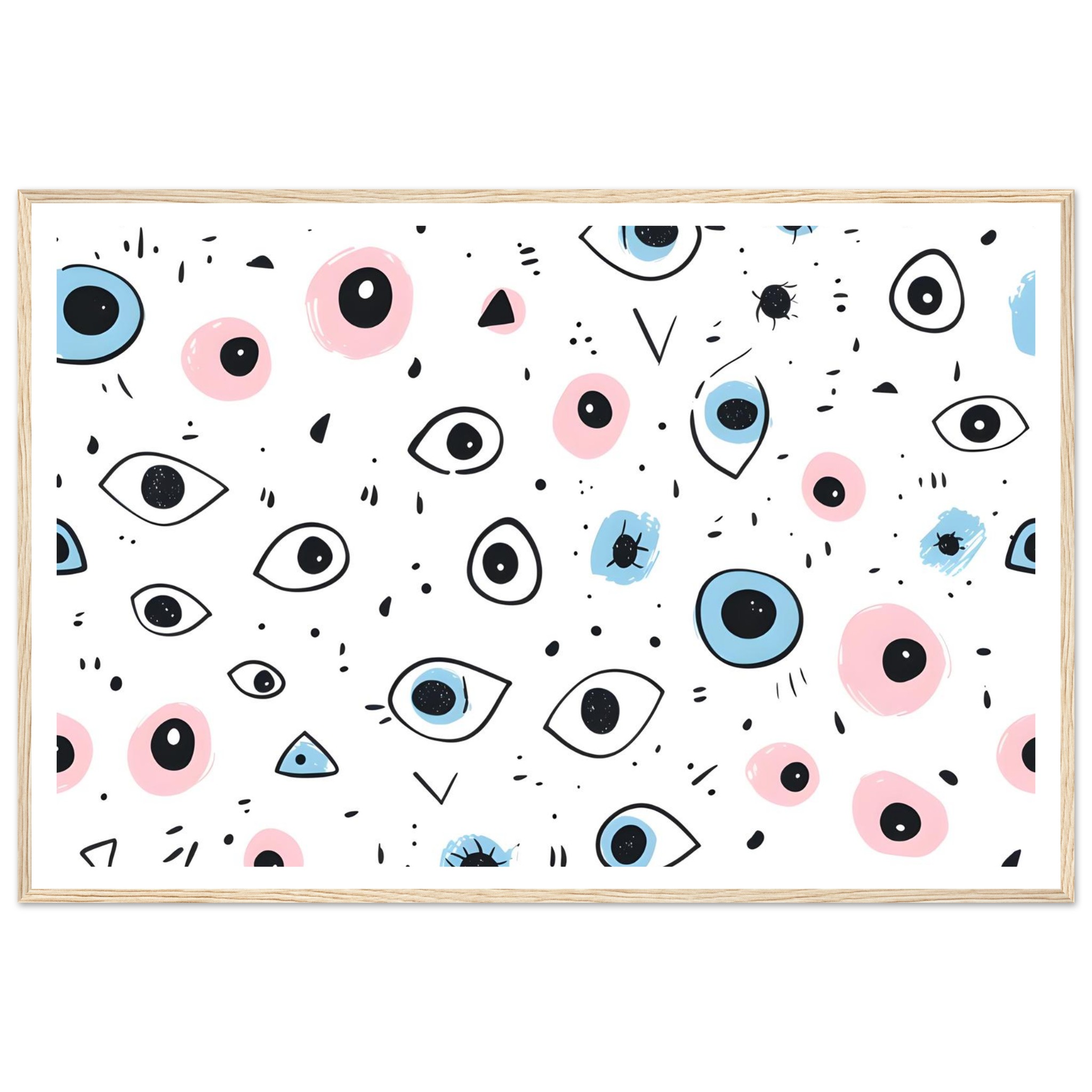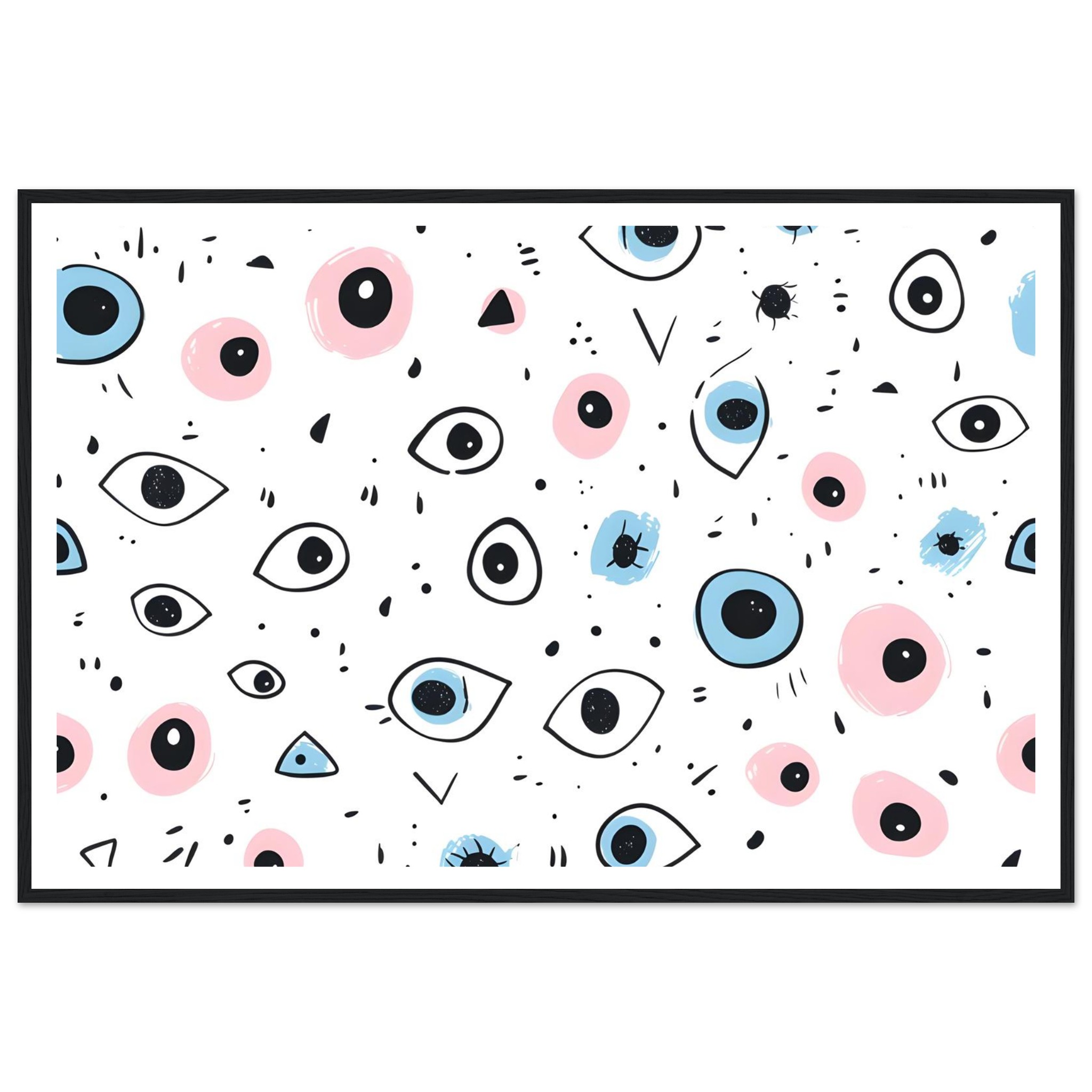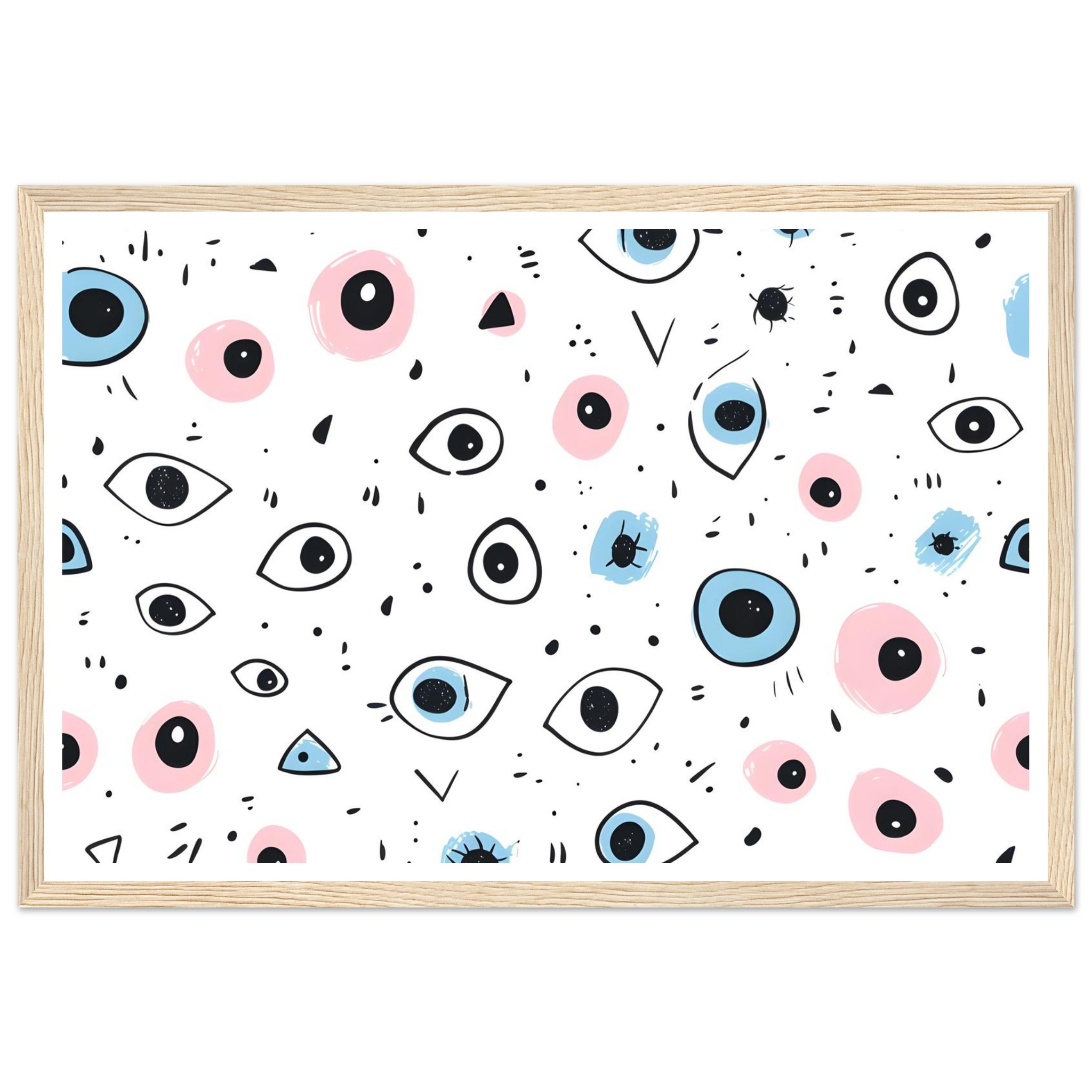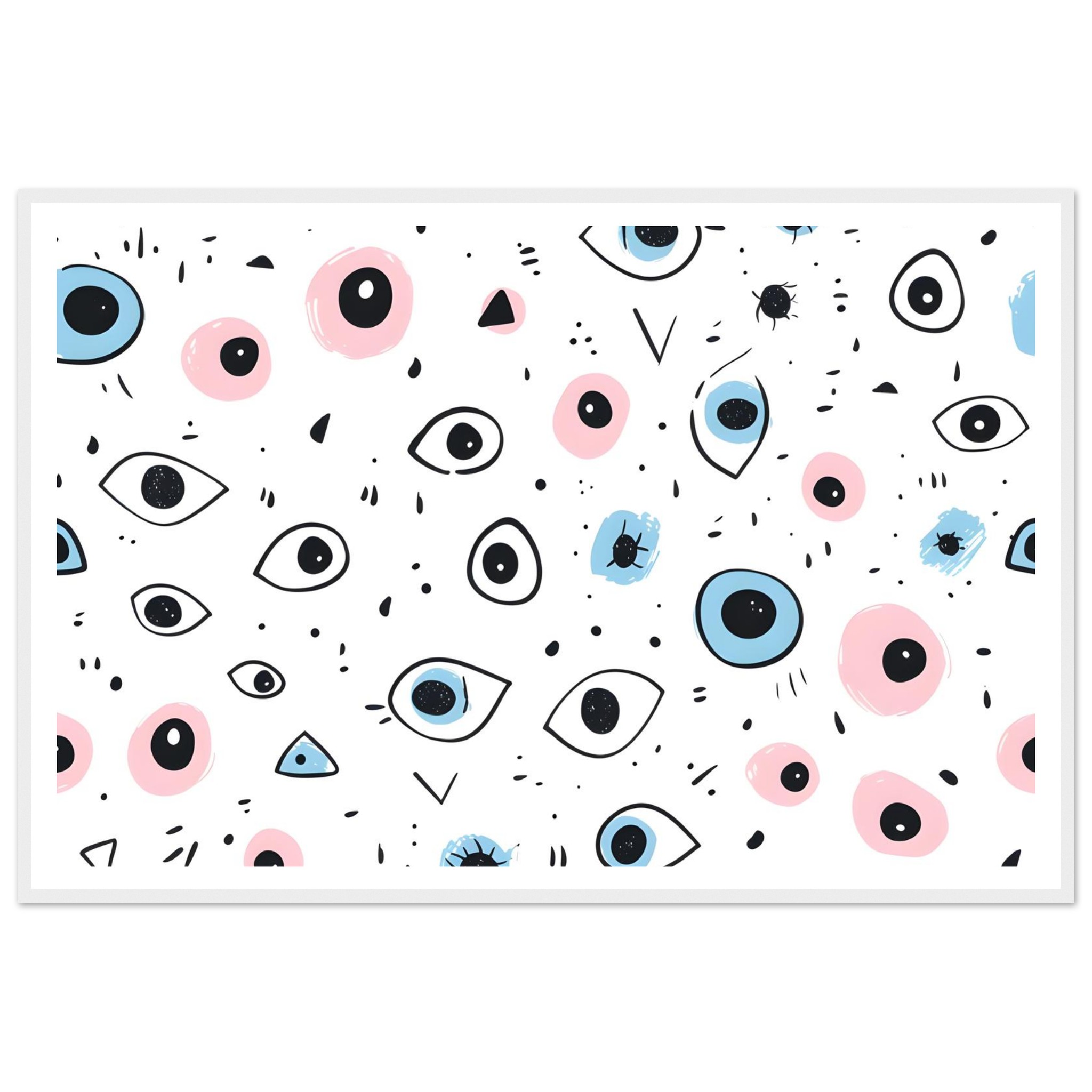 Bring a touch of whimsical wonder and contemporary charm to your space with our ‘Eyes Wide Open’ art print. Featuring an enchanting pattern of stylized eyes and playful abstract shapes in a delightful palette of soft pink and serene blue, this piece invites intrigue and personality into any room. Each detail is rendered with a hand-drawn feel, adding an artisanal touch that speaks to your unique aesthetic.