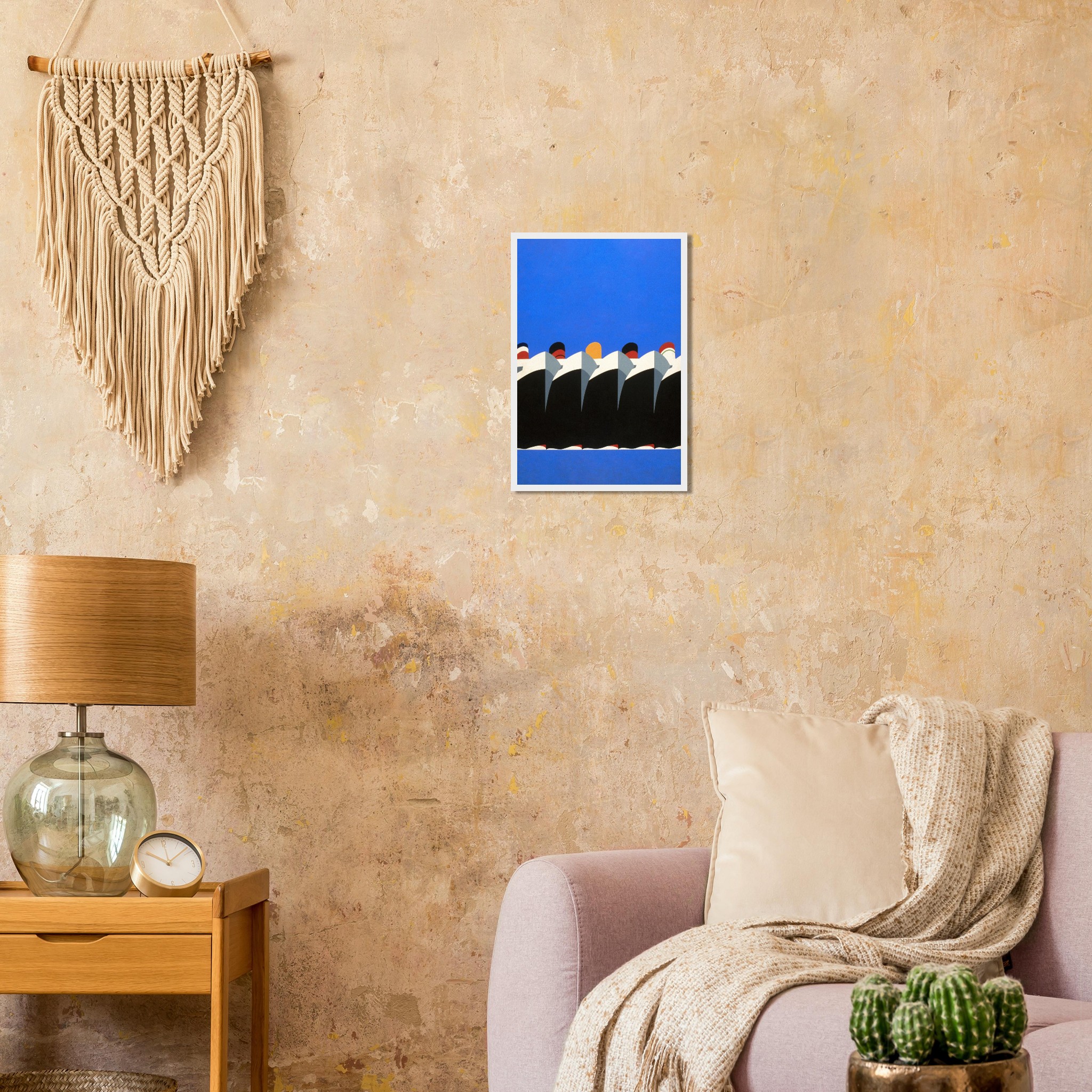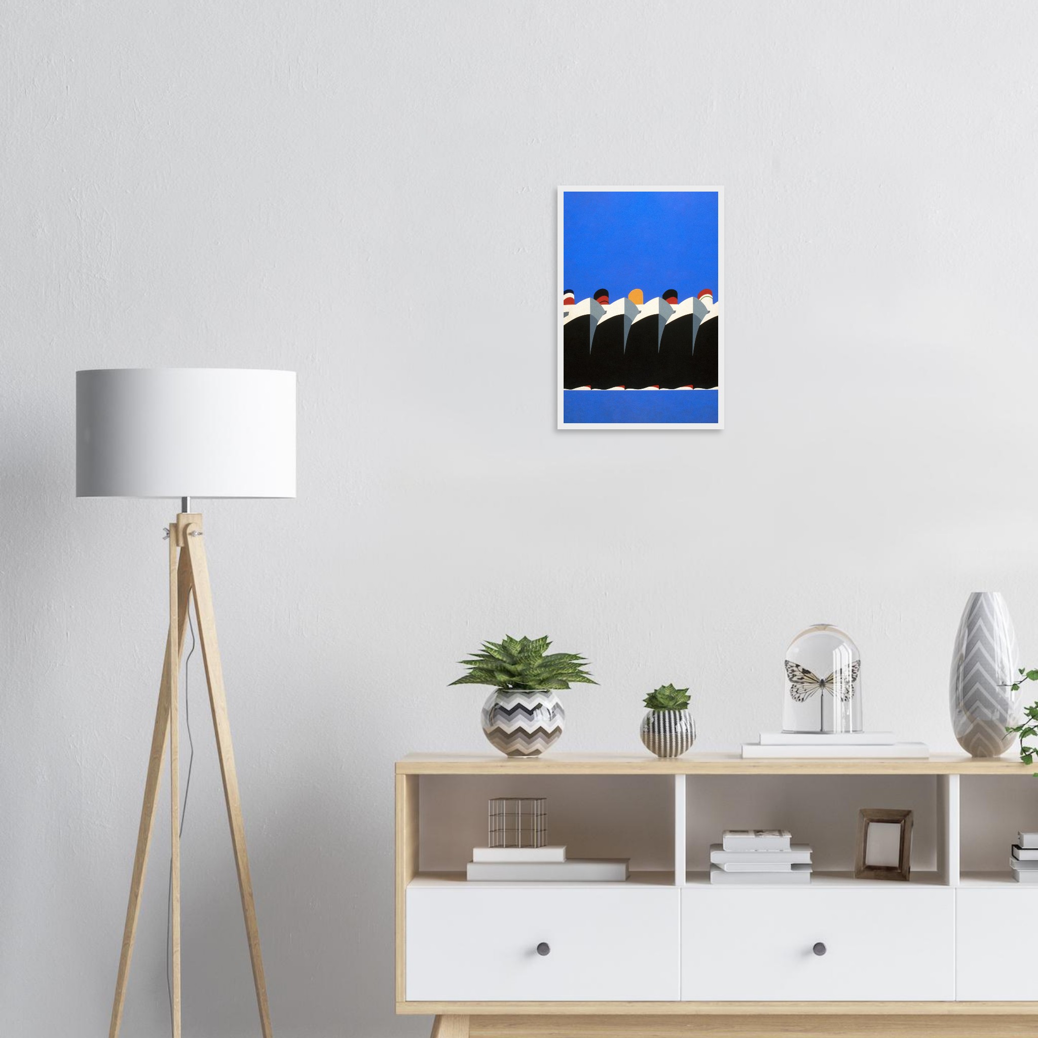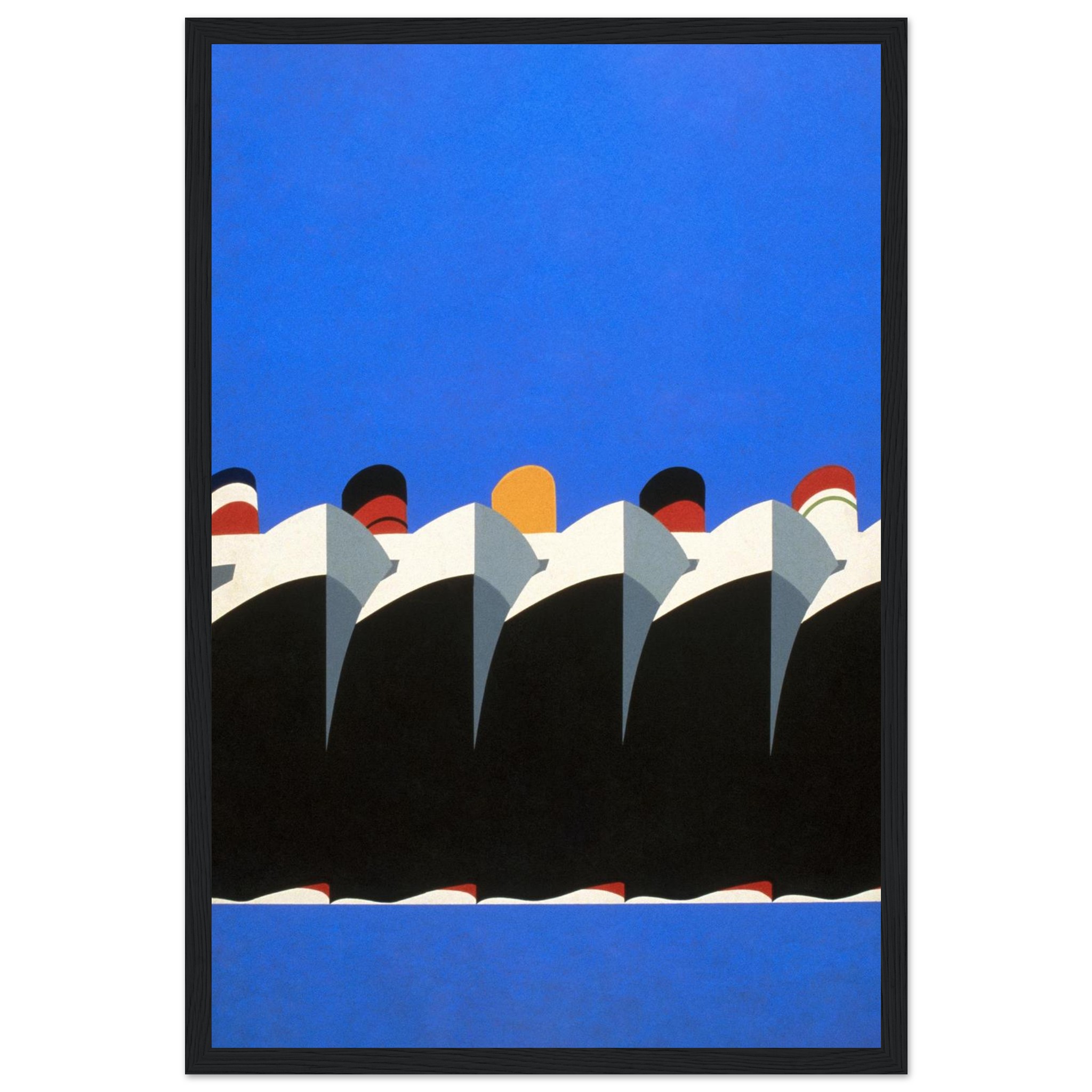 Capture the sleek elegance of mid-century maritime design with this striking abstract art print. Featuring a parade of ocean liners in a vibrant blue and black palette, accented with bold red and white details, this poster brings a touch of classic sophistication and adventurous spirit to any room. It’s an ideal piece for lovers of travel, vintage aesthetics, or modern art with a timeless feel.