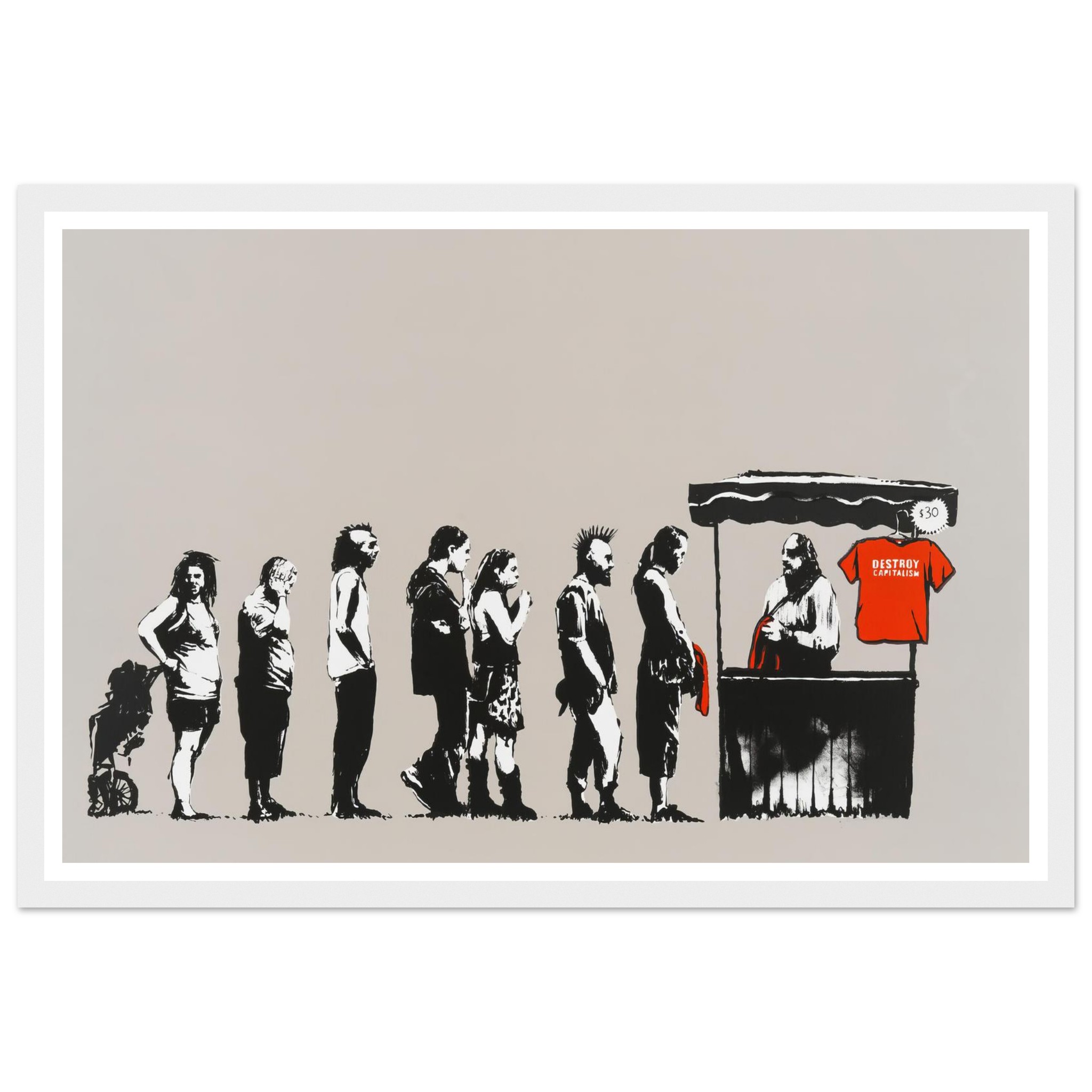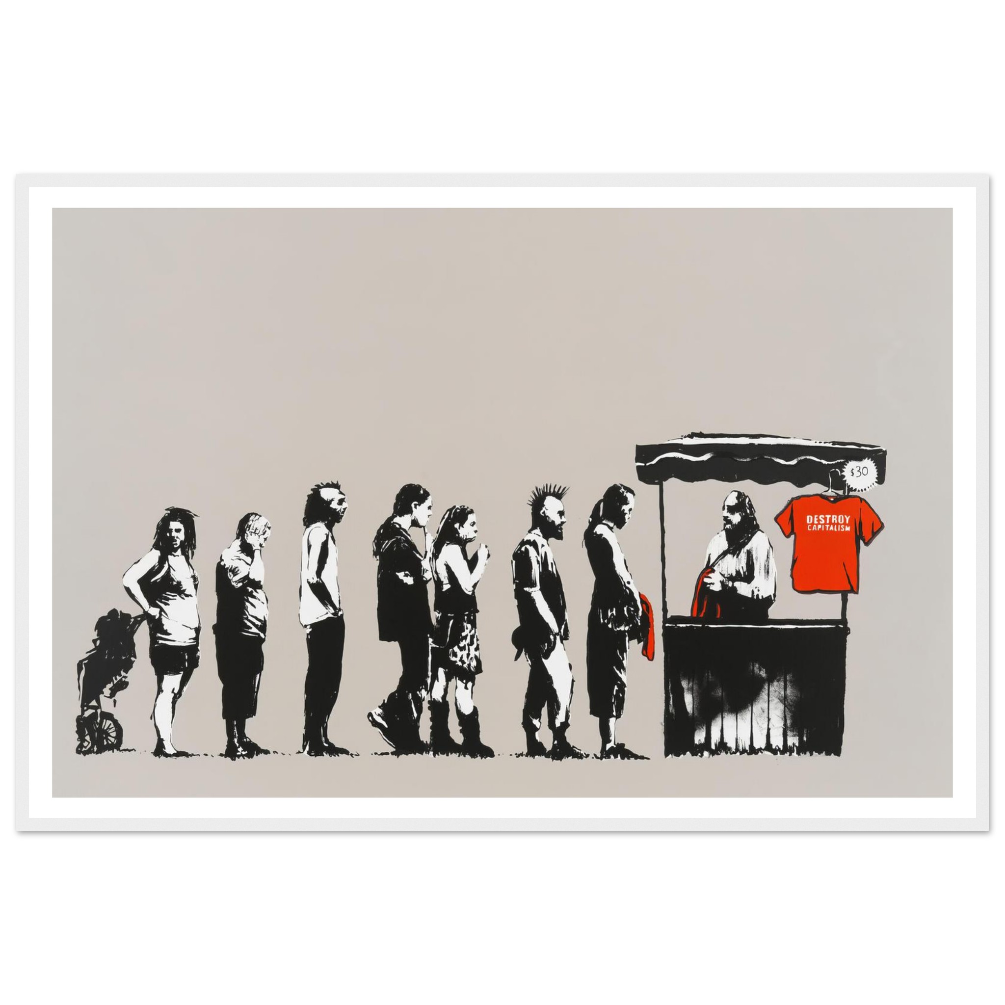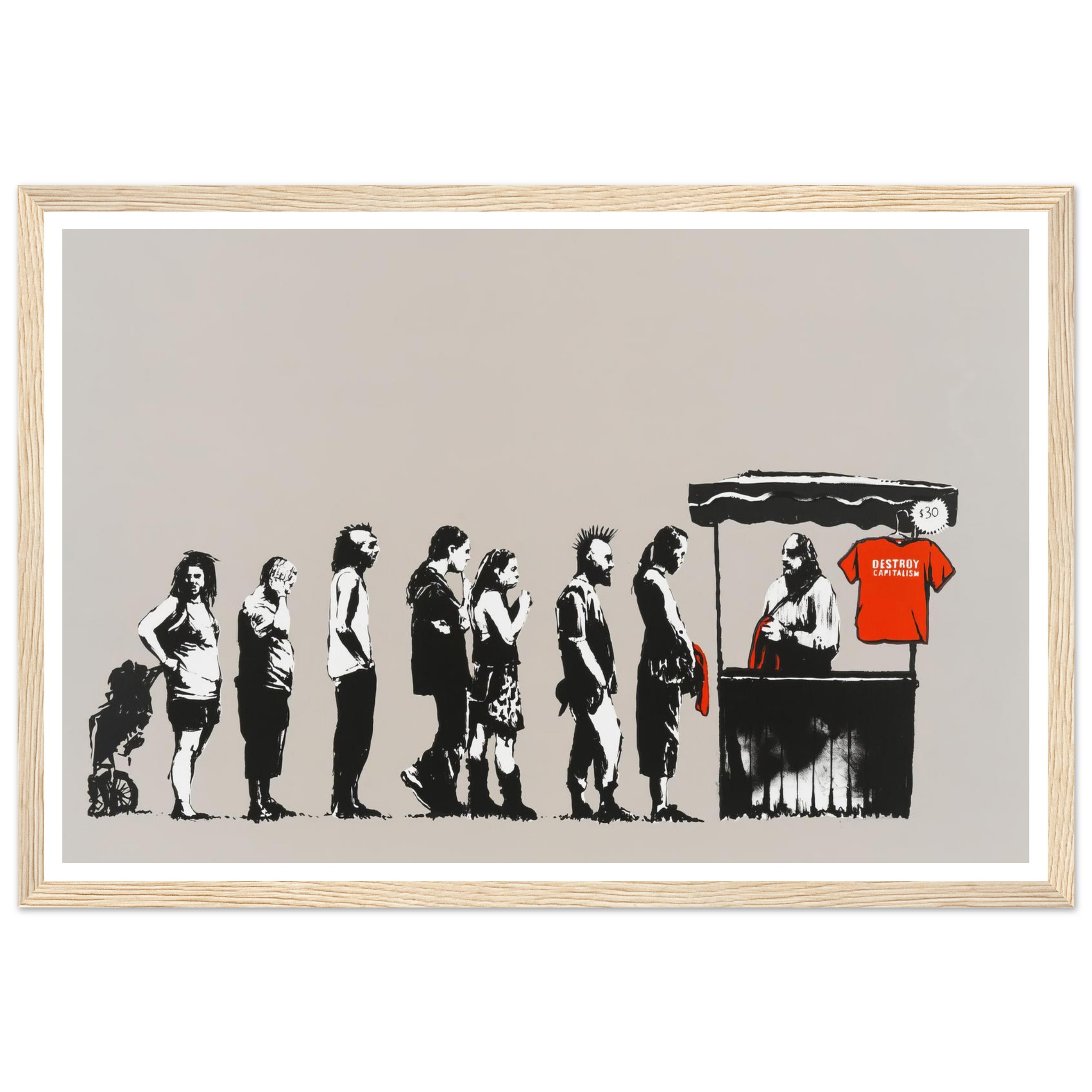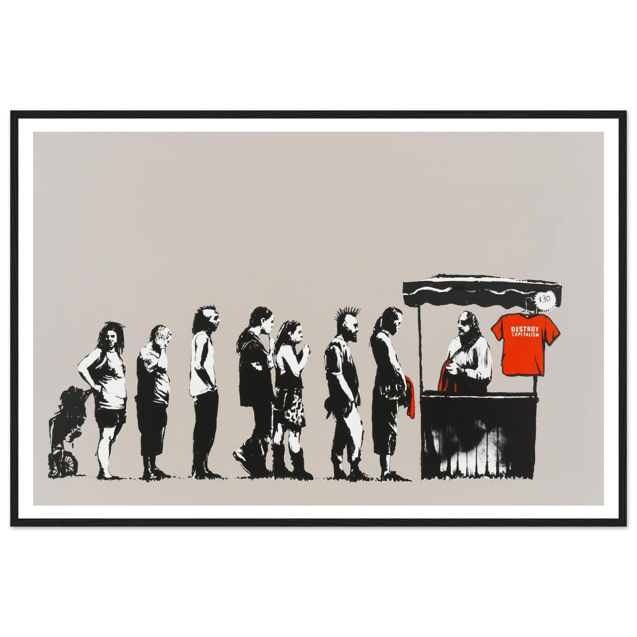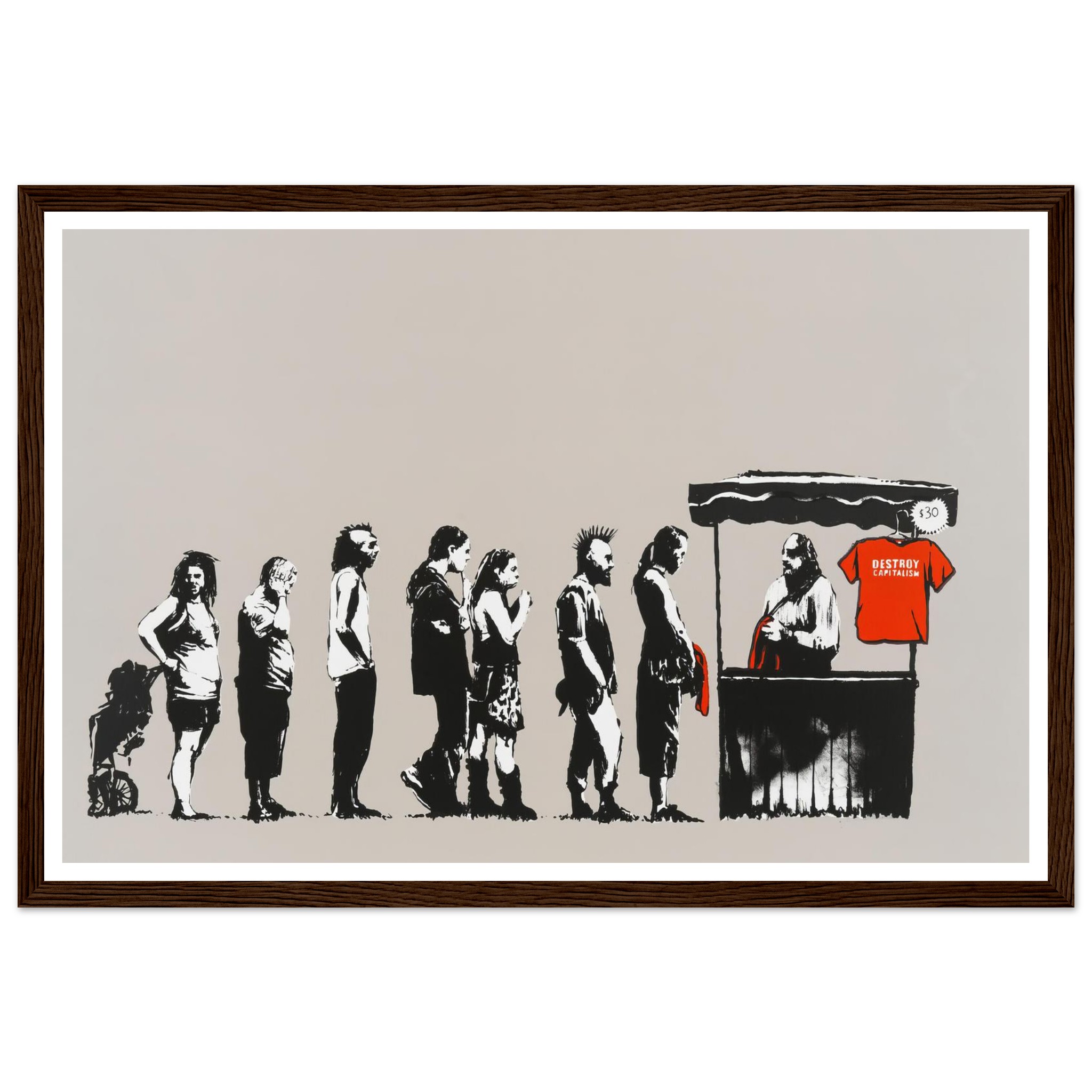 Make a bold statement with our Anti-Capitalist Statement Art Framed Poster, capturing a powerful social commentary with striking visual impact. This thought-provoking piece, featuring a queue of diverse individuals leading to a vendor selling an “DESTROY CAPITALISM” t-shirt, is a must-have for those who appreciate art that challenges the status quo. The stark black and white figures against the muted background, punctuated by the vibrant red of the protest tee, create a compelling focal point in any room.