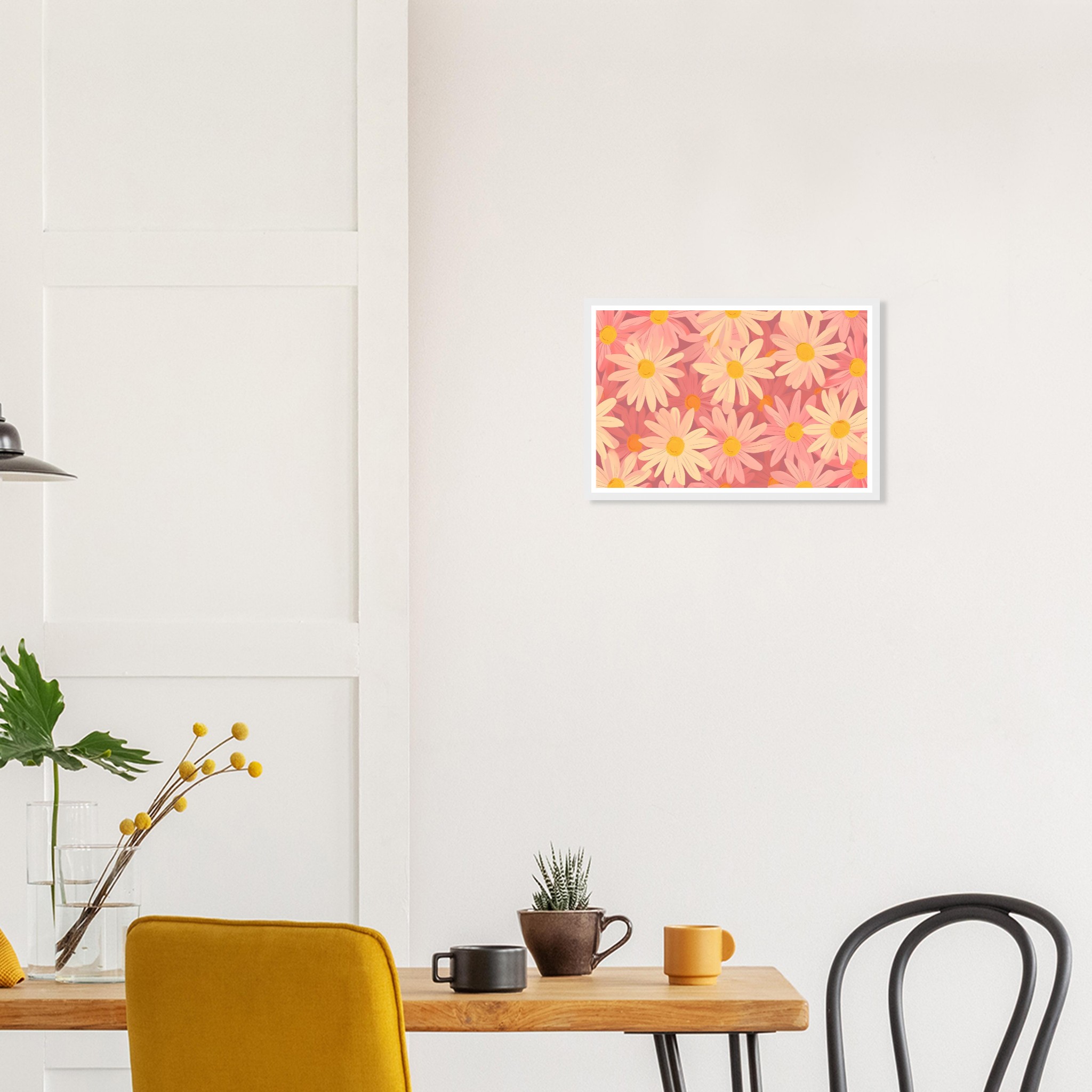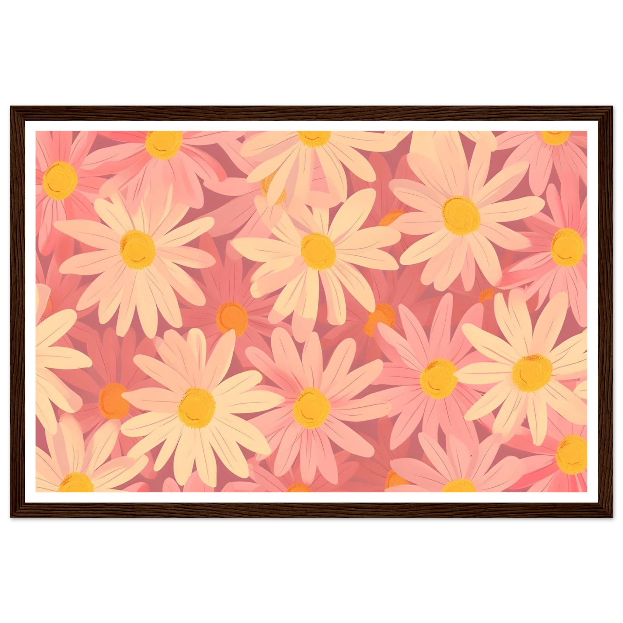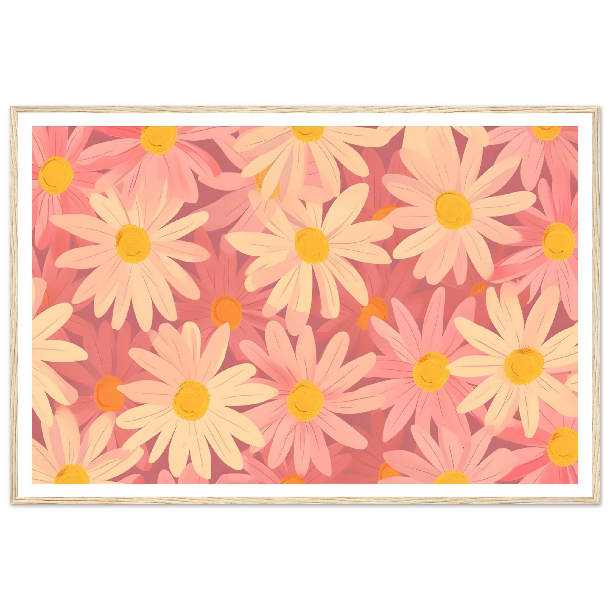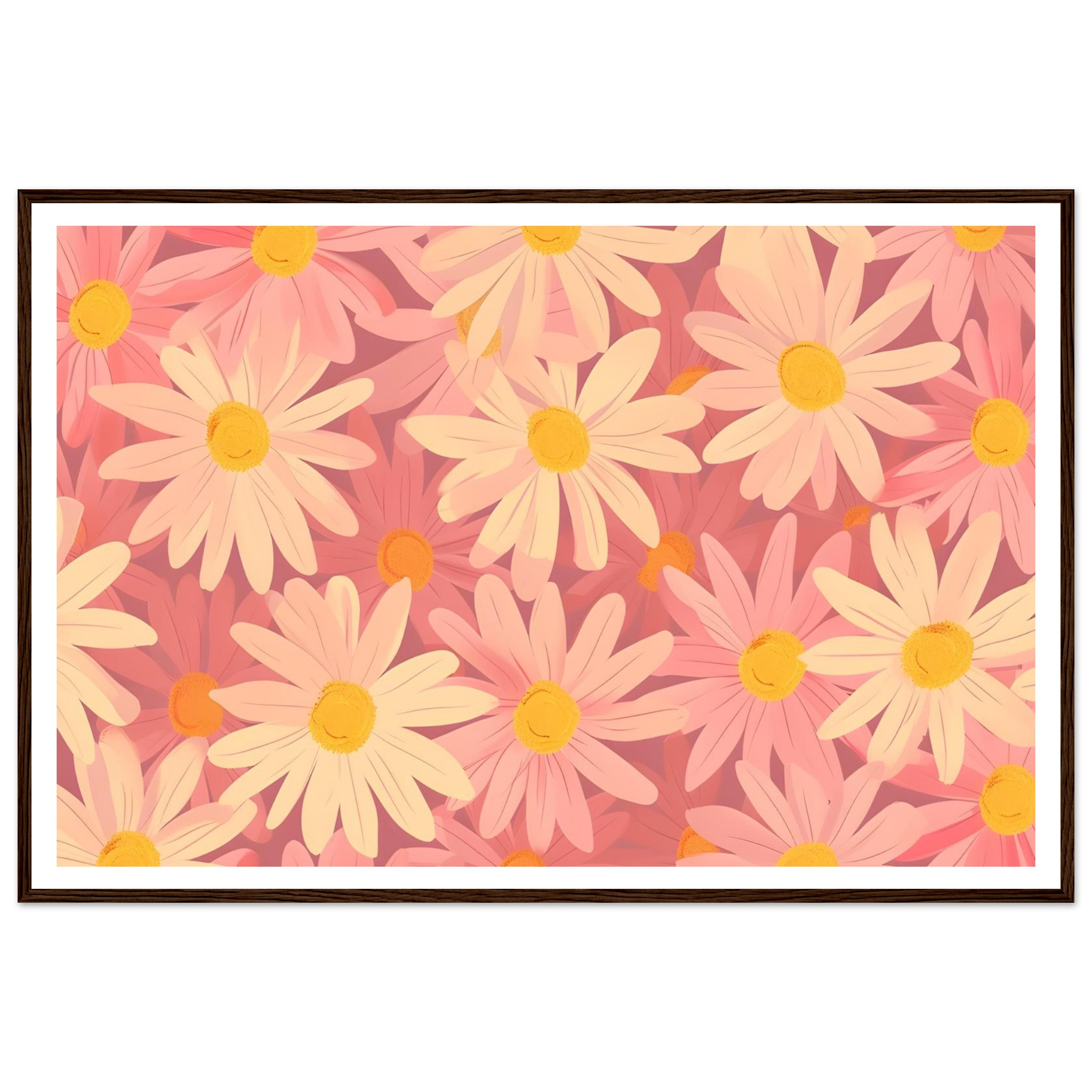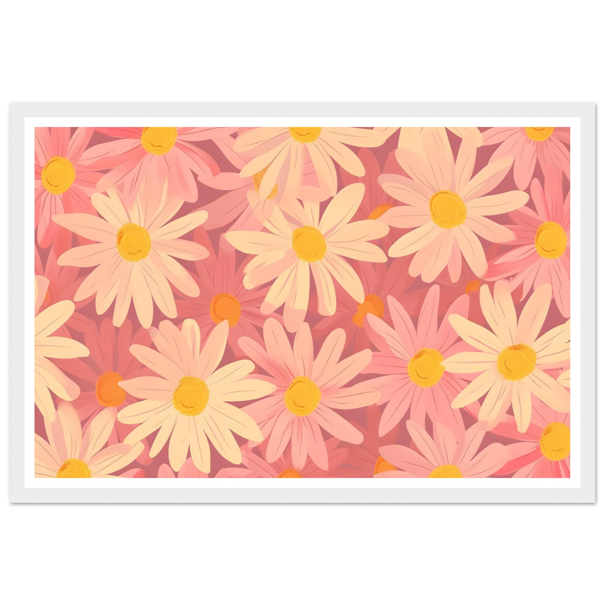 Bring a touch of whimsical spring into your home with our Blush Daisy Dream framed poster. Featuring a delightful pattern of soft pink and warm yellow daisies, this artwork exudes a gentle, uplifting mood. It’s perfect for adding a serene floral accent to any room, creating an inviting atmosphere that celebrates nature’s simple beauty.