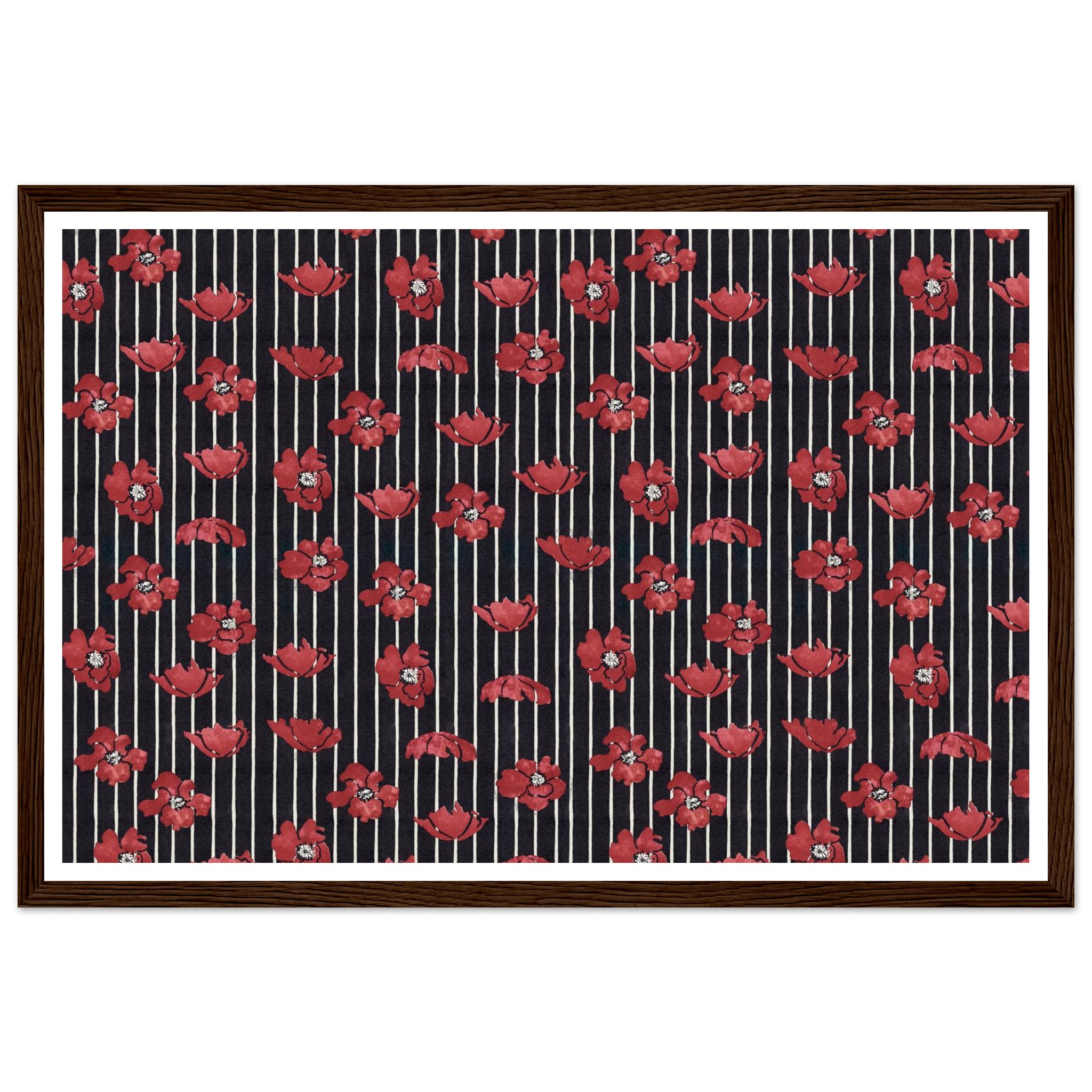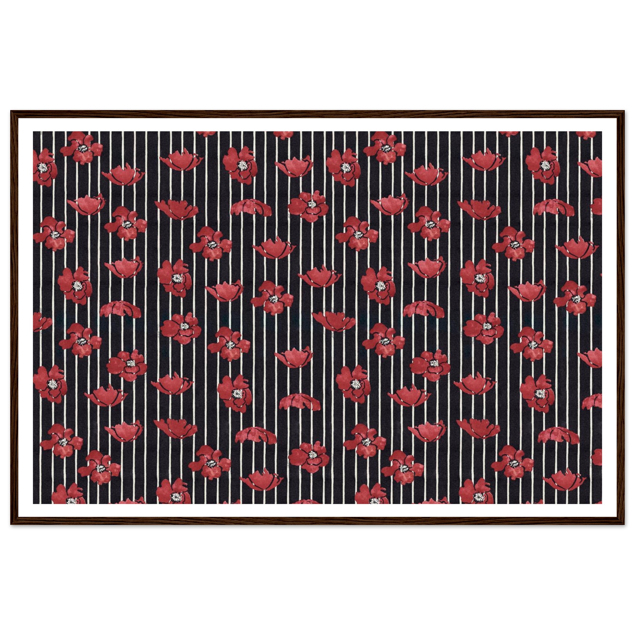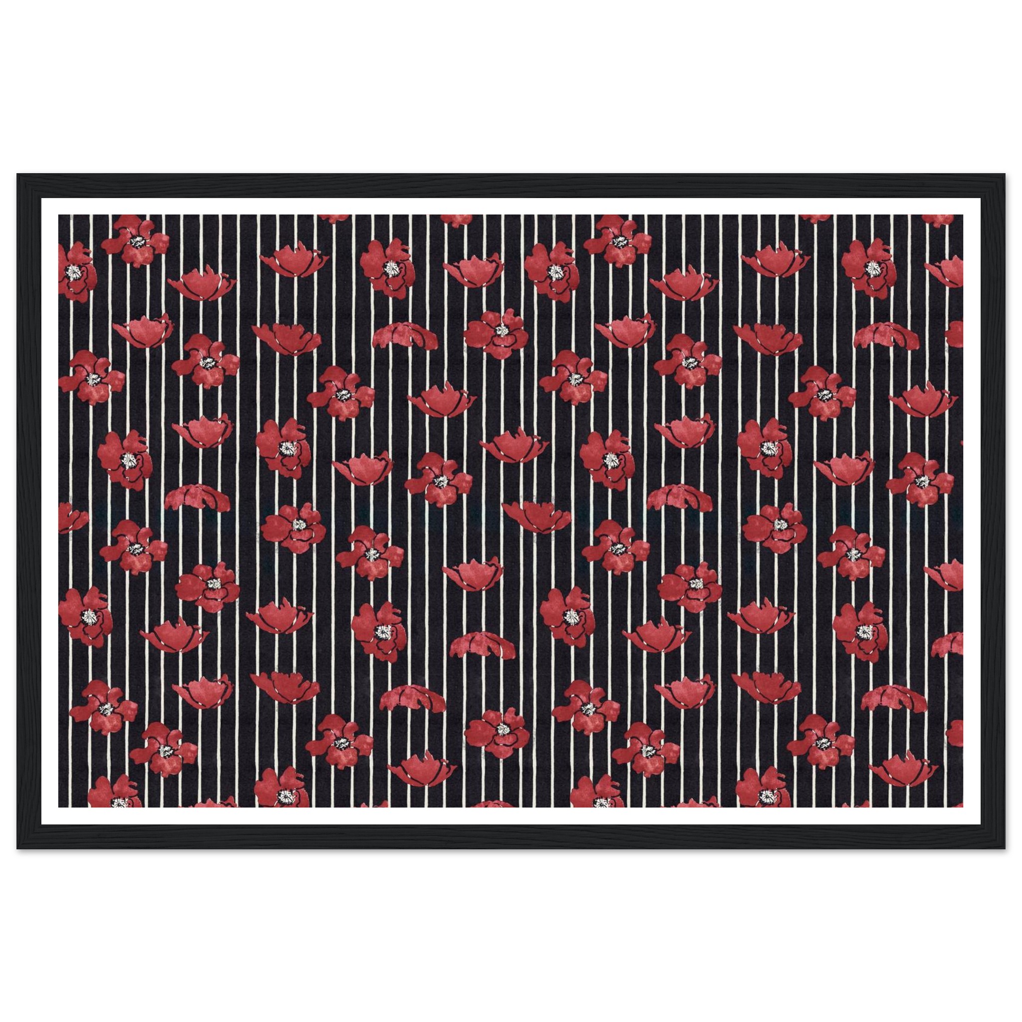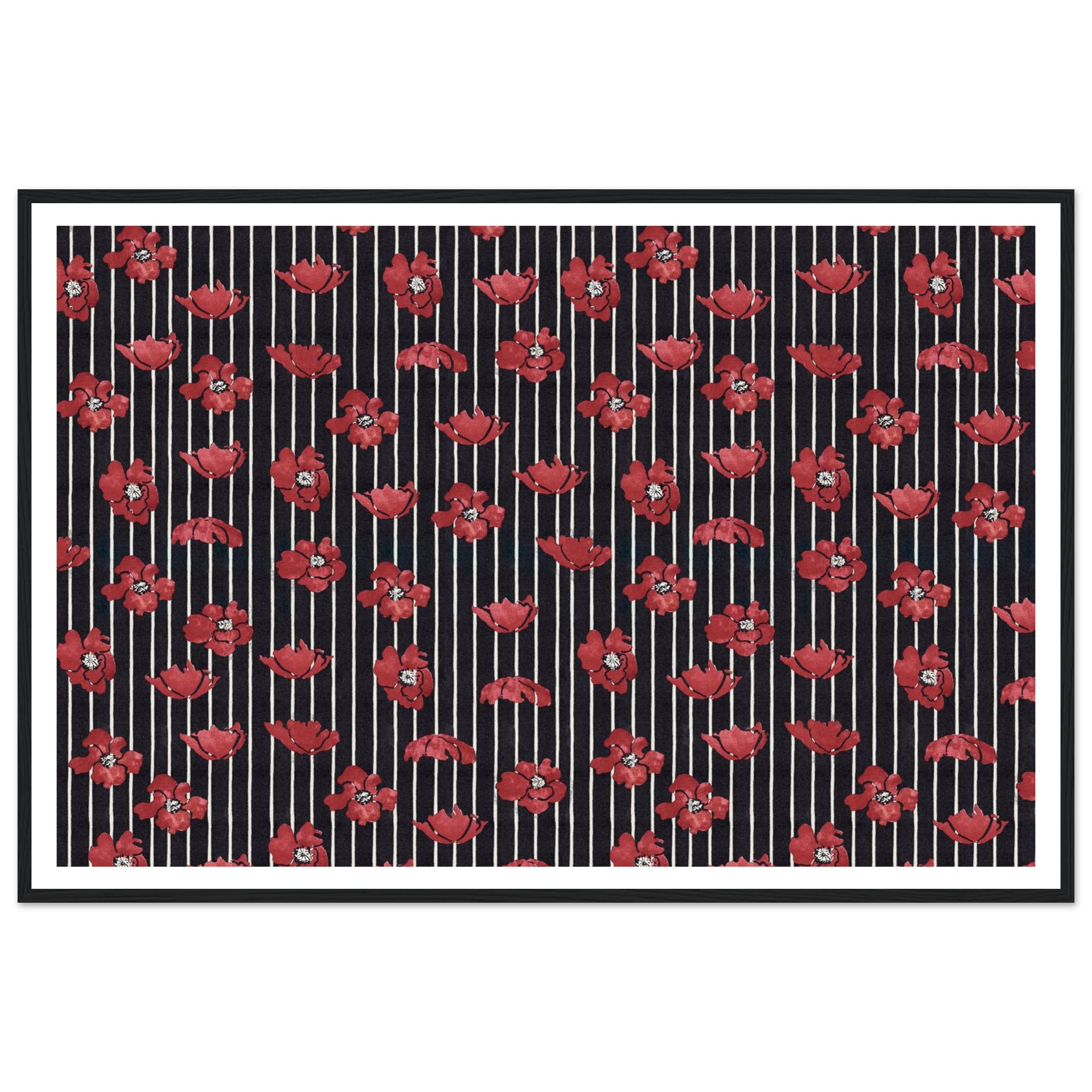 Infuse your living space with a touch of dramatic elegance! This framed poster features vibrant red poppy illustrations set against a chic striped background, creating a timeless pattern that speaks to both classic and contemporary tastes. It’s the perfect statement piece to brighten any room, offering a blend of bold color and sophisticated design that will captivate and inspire.