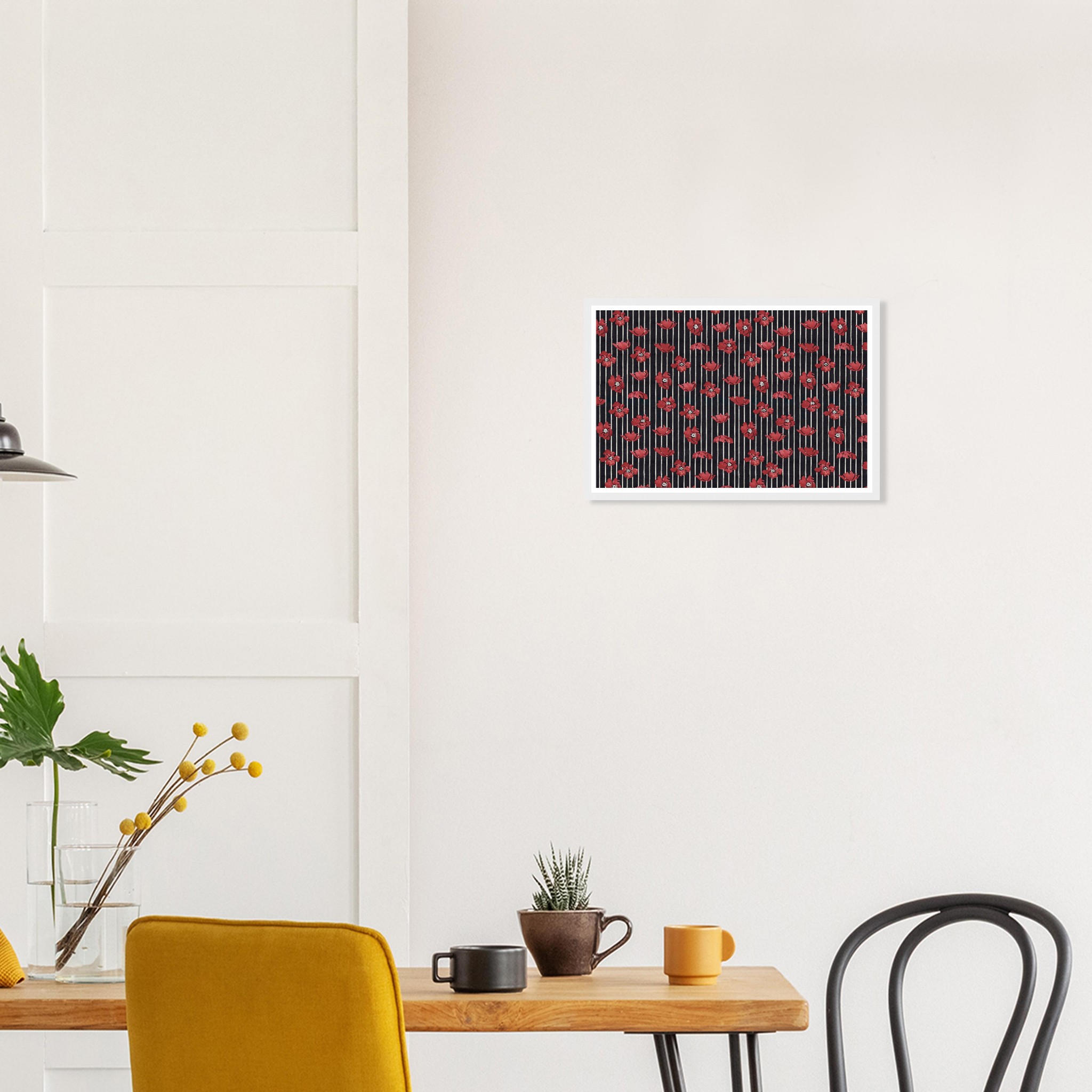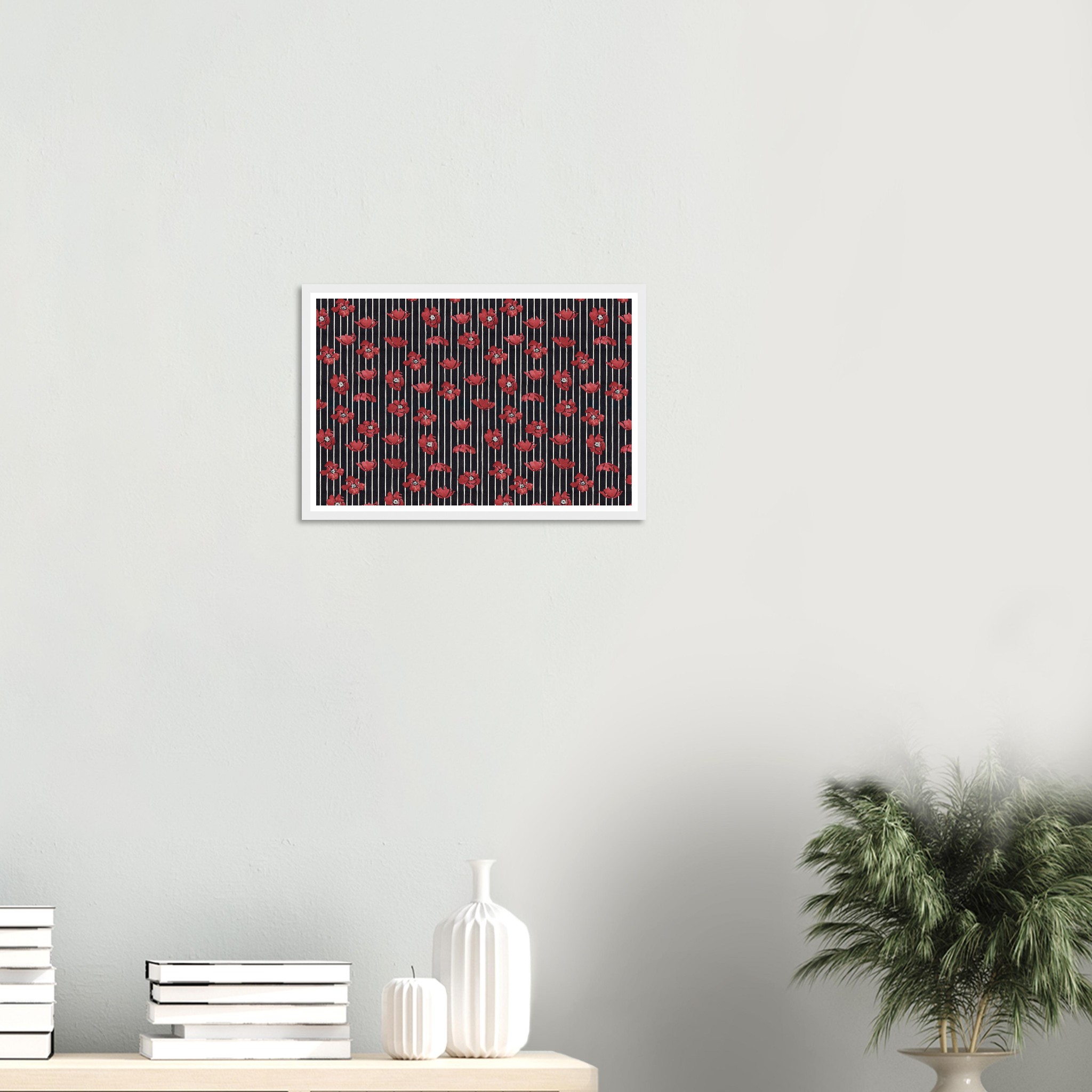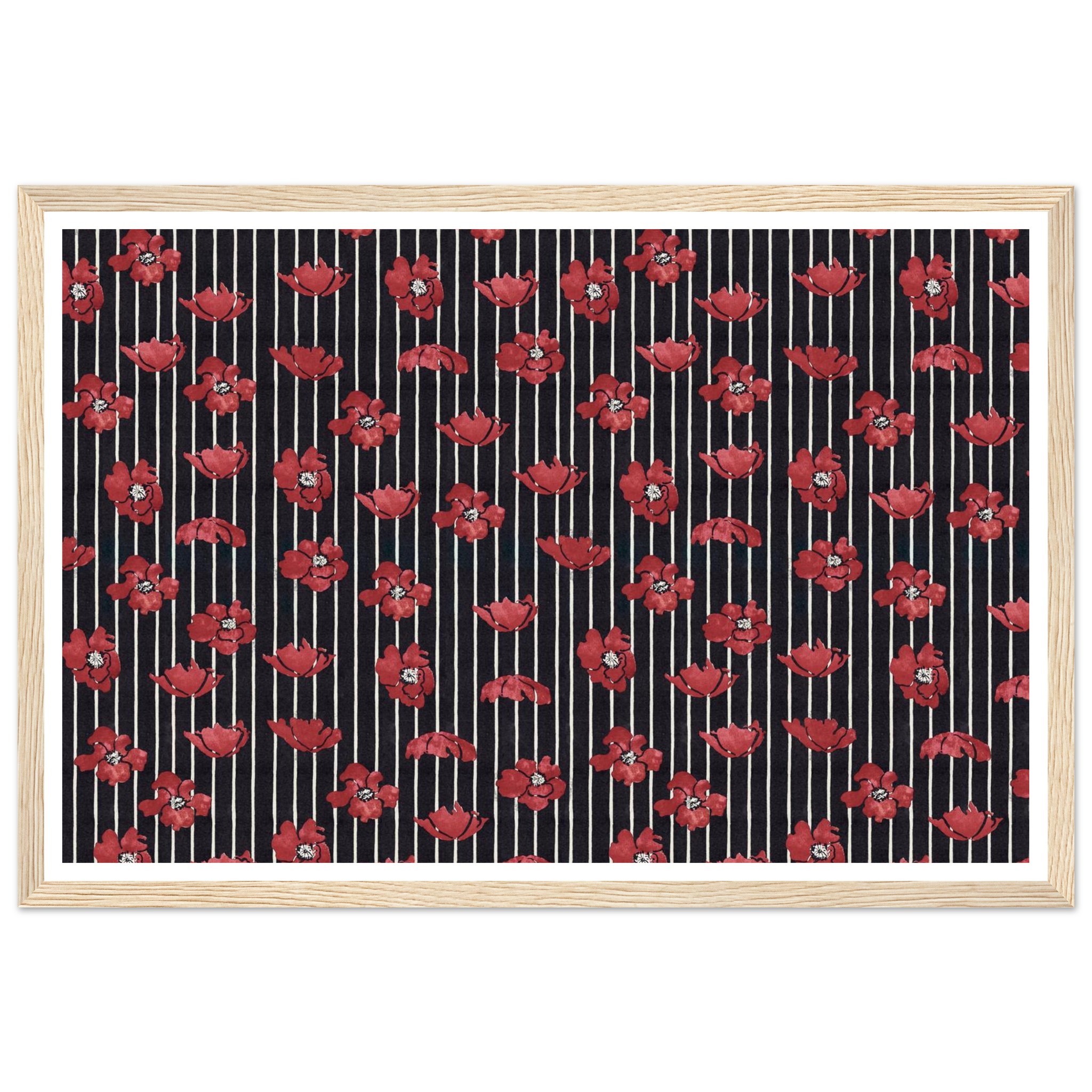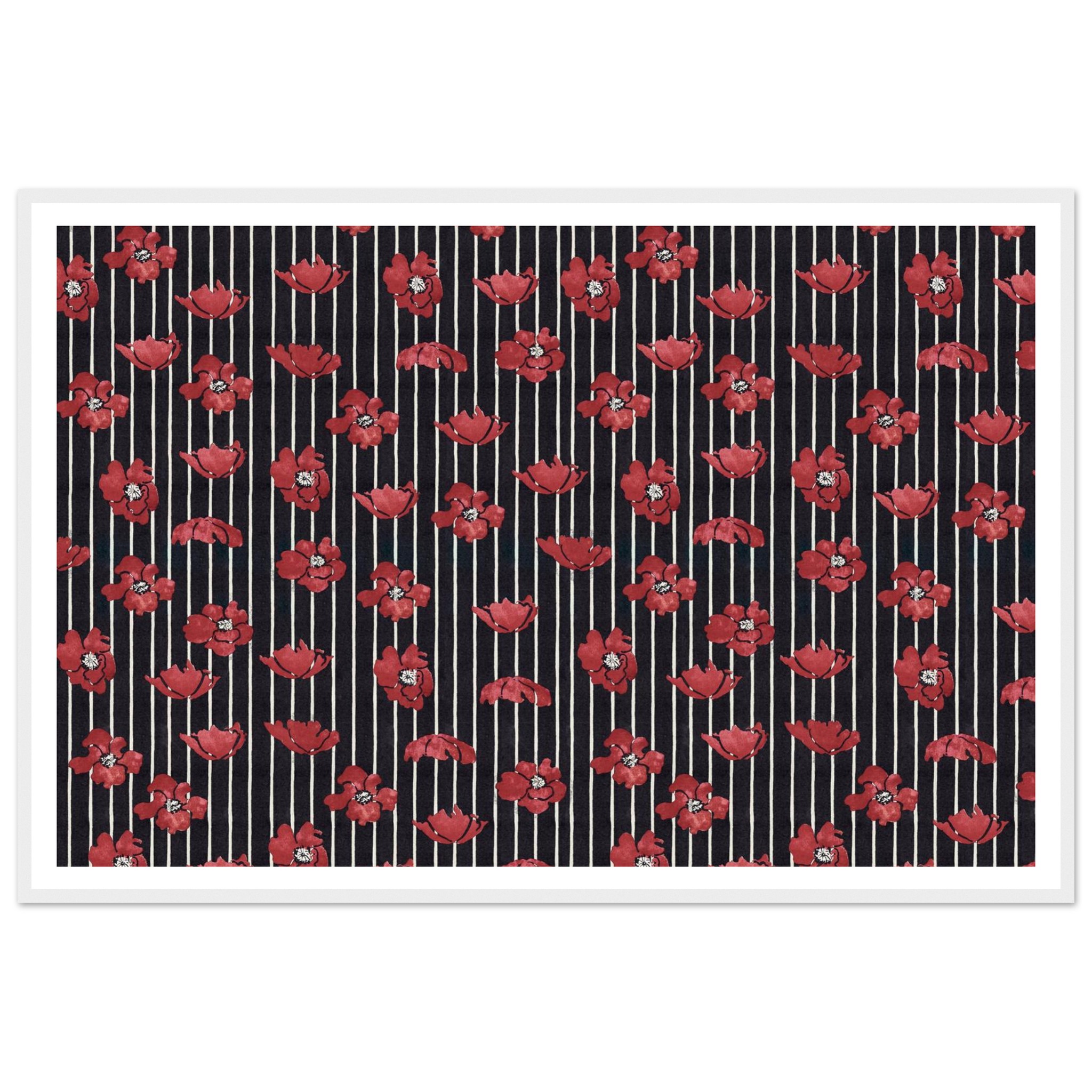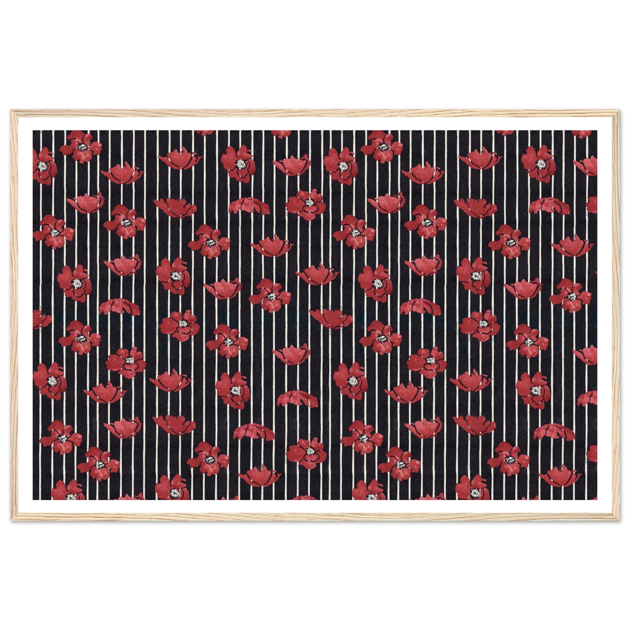 Infuse your living space with a touch of dramatic elegance! This framed poster features vibrant red poppy illustrations set against a chic striped background, creating a timeless pattern that speaks to both classic and contemporary tastes. It’s the perfect statement piece to brighten any room, offering a blend of bold color and sophisticated design that will captivate and inspire.