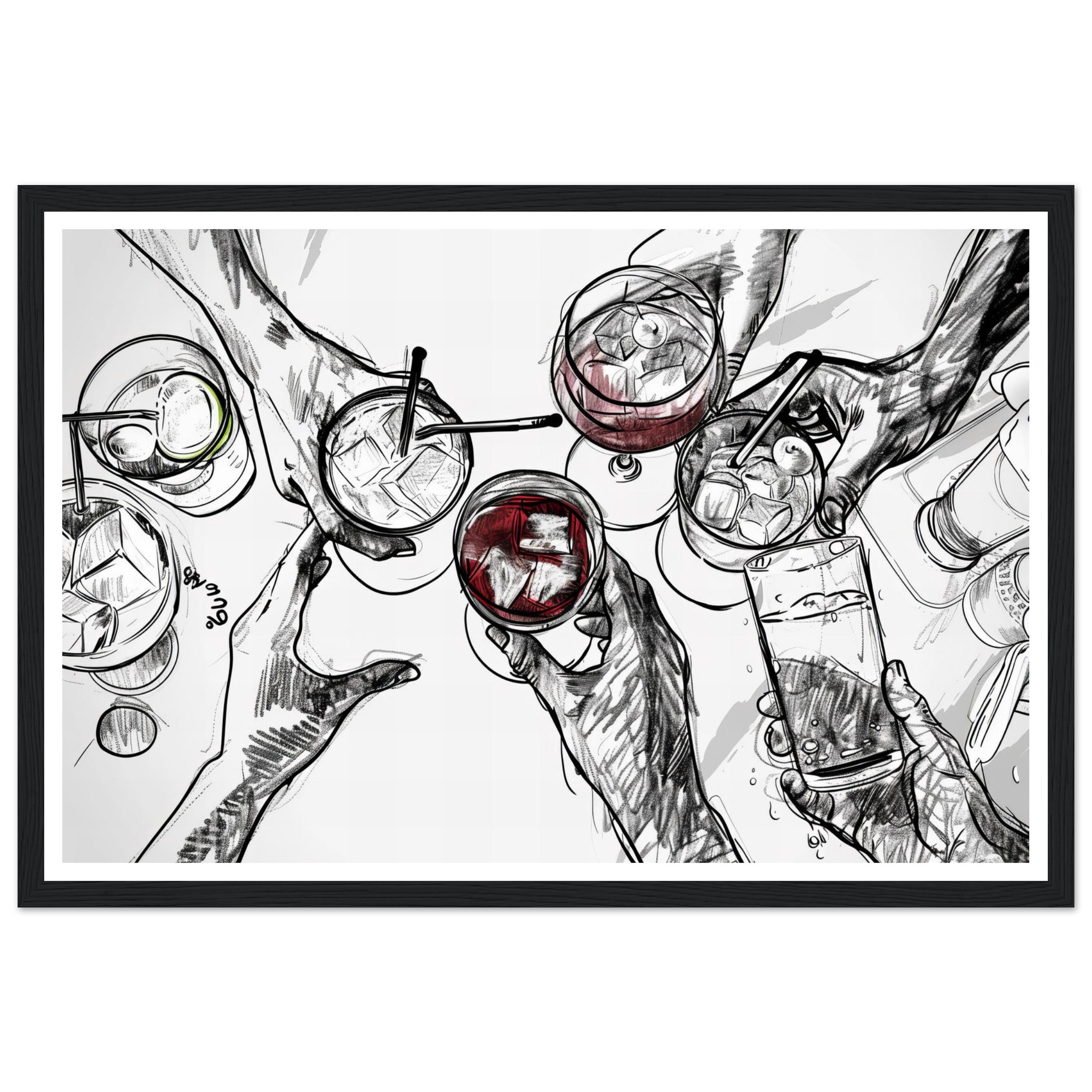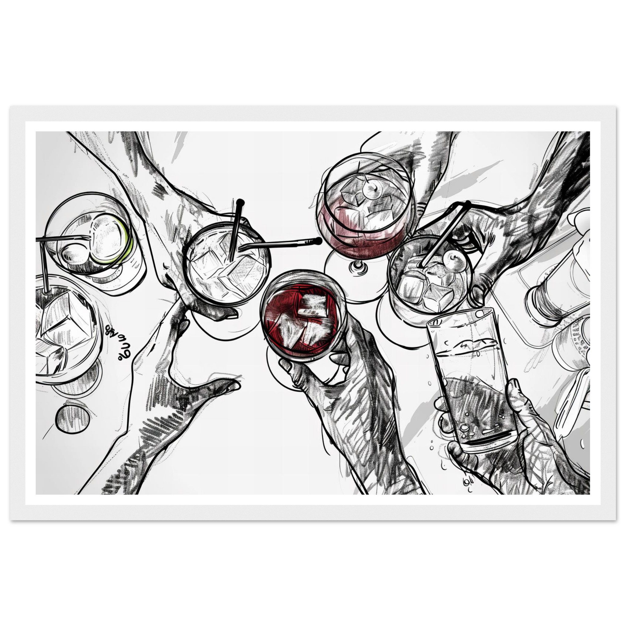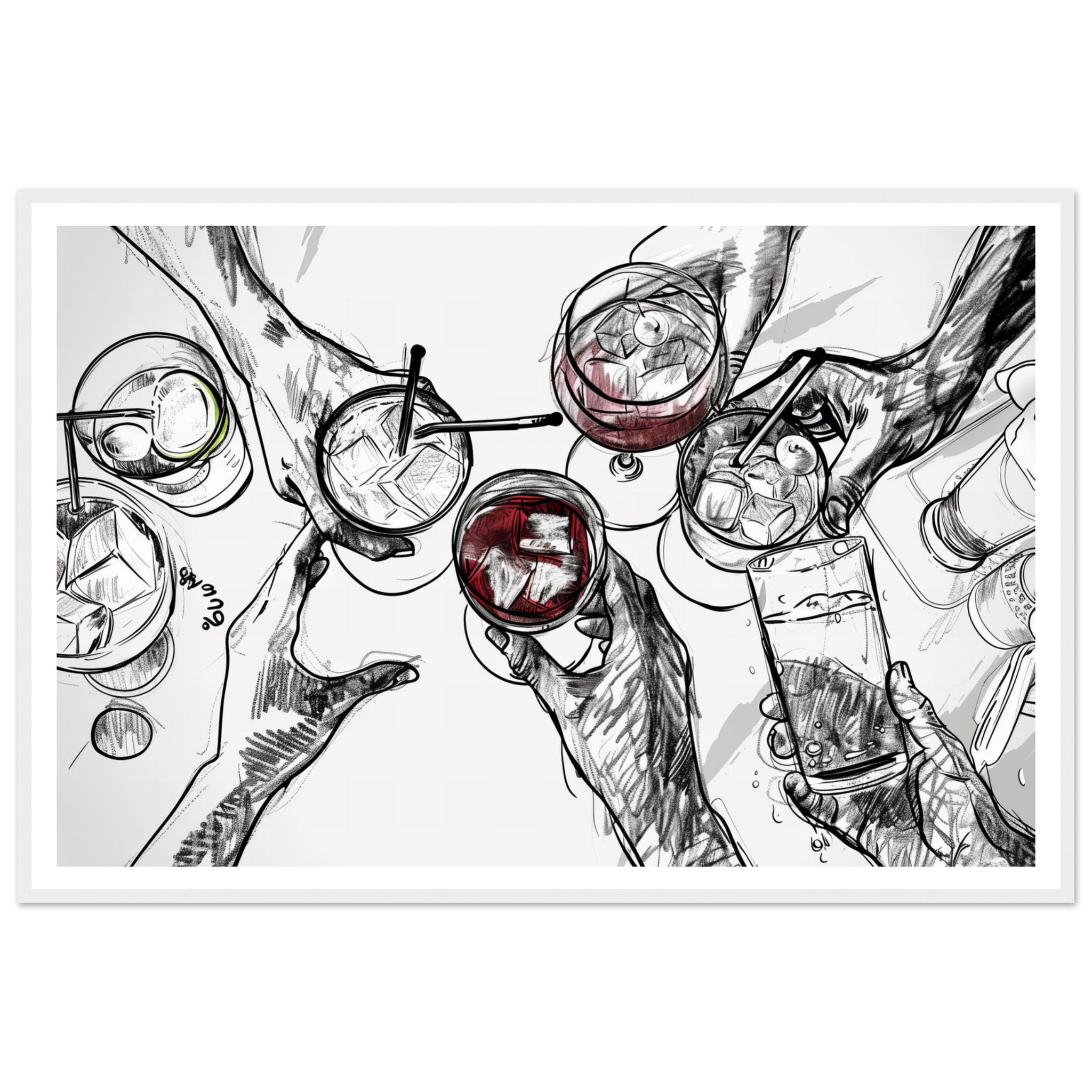 Raise a glass to friendship and good times with this vibrant sketch art print, perfectly capturing a moment of joyous celebration. The dynamic line work and splash of color evoke the fun of clinking glasses, making it an ideal piece to liven up your kitchen, dining room, or home bar. This unique artwork is printed on heavyweight matte paper, designed to bring a touch of lively sophistication to any space.