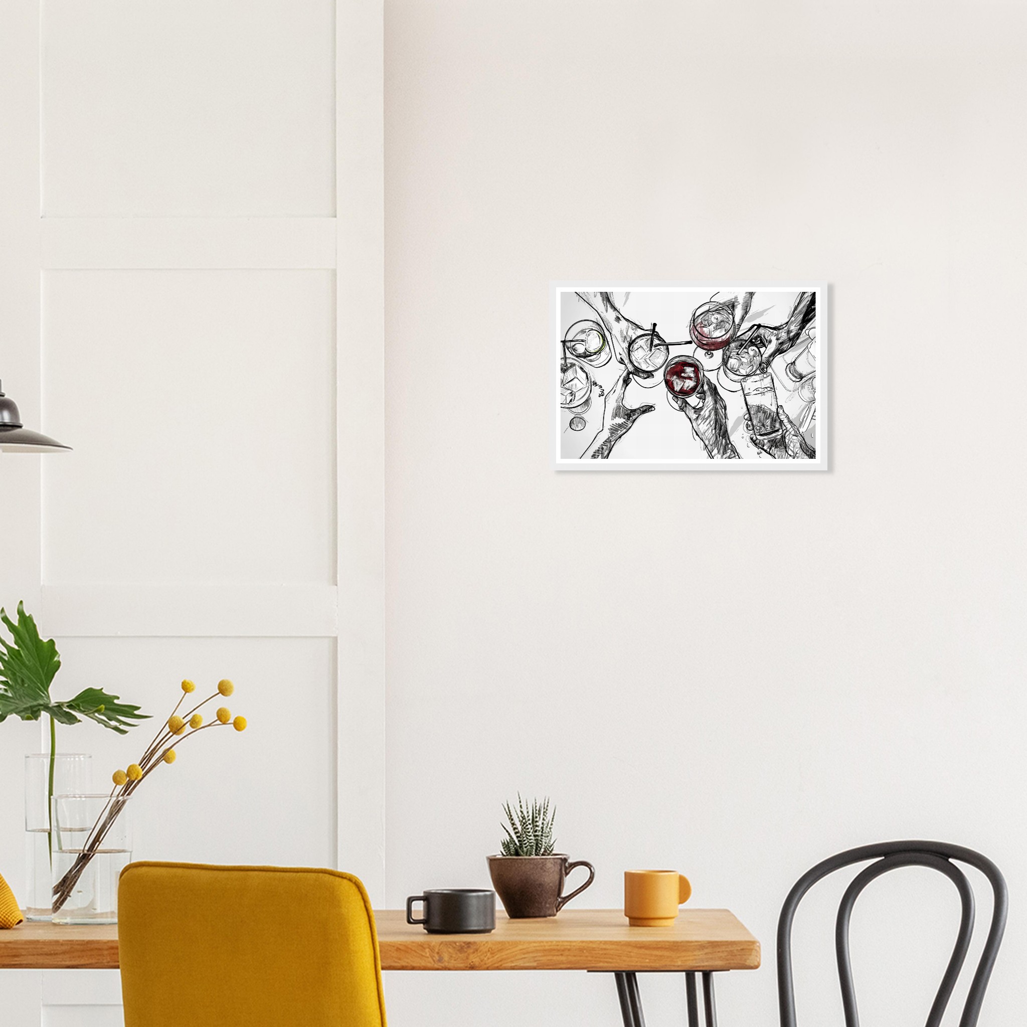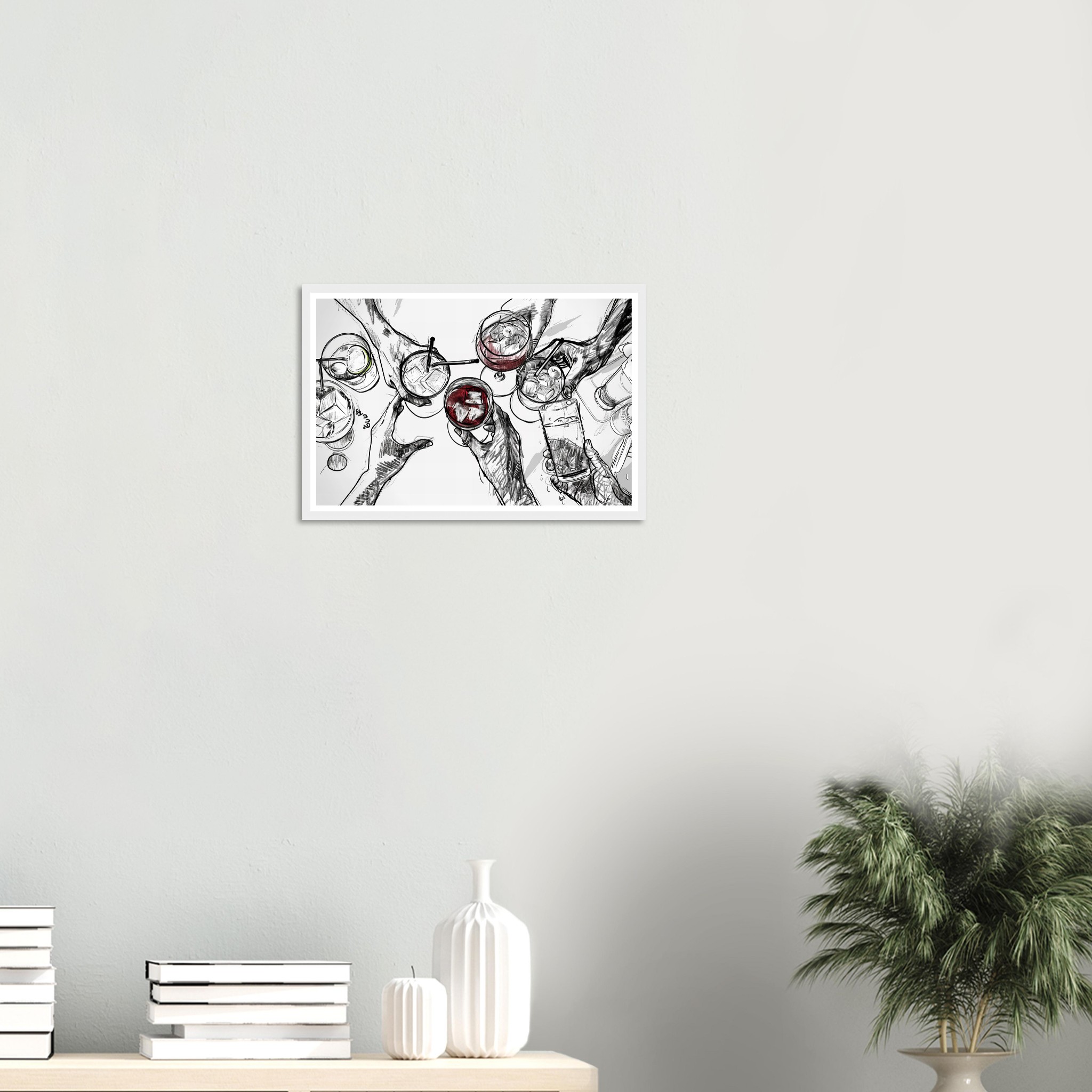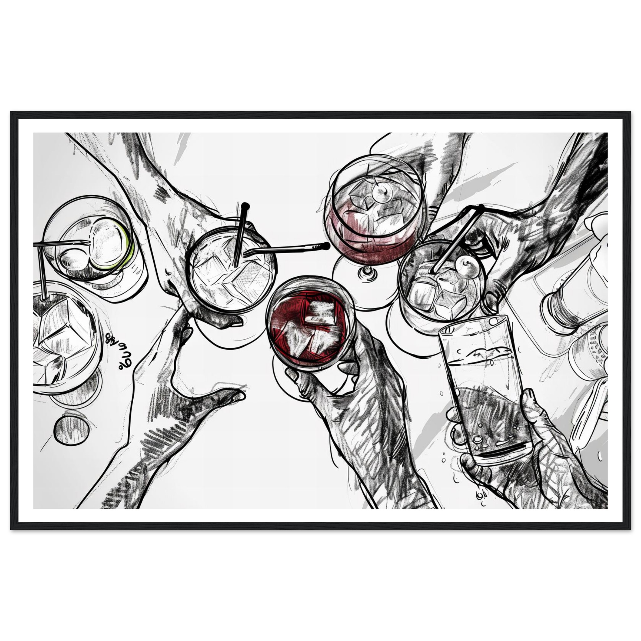 Raise a glass to friendship and good times with this vibrant sketch art print, perfectly capturing a moment of joyous celebration. The dynamic line work and splash of color evoke the fun of clinking glasses, making it an ideal piece to liven up your kitchen, dining room, or home bar. This unique artwork is printed on heavyweight matte paper, designed to bring a touch of lively sophistication to any space.