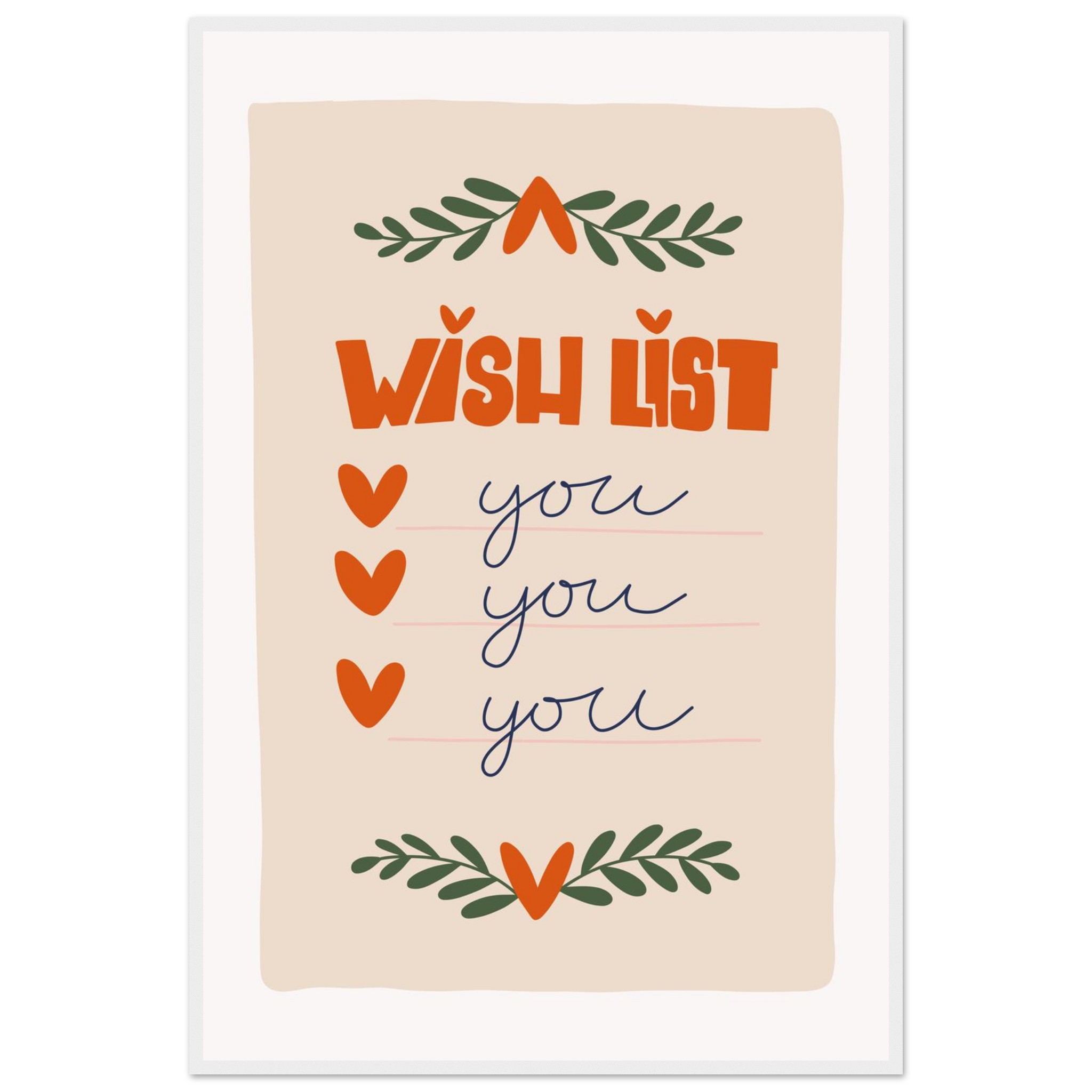 Capture the heartfelt sentiment of this charming ‘Wish List: You’ framed poster, a perfect blend of whimsical design and warm affection. Adorned with playful typography and delicate botanical accents in a soothing color palette, this piece adds a touch of lighthearted romance and a personal declaration of love to any space. It’s ideal for a cozy bedroom, a loving living room, or as a thoughtful gift that speaks volumes.