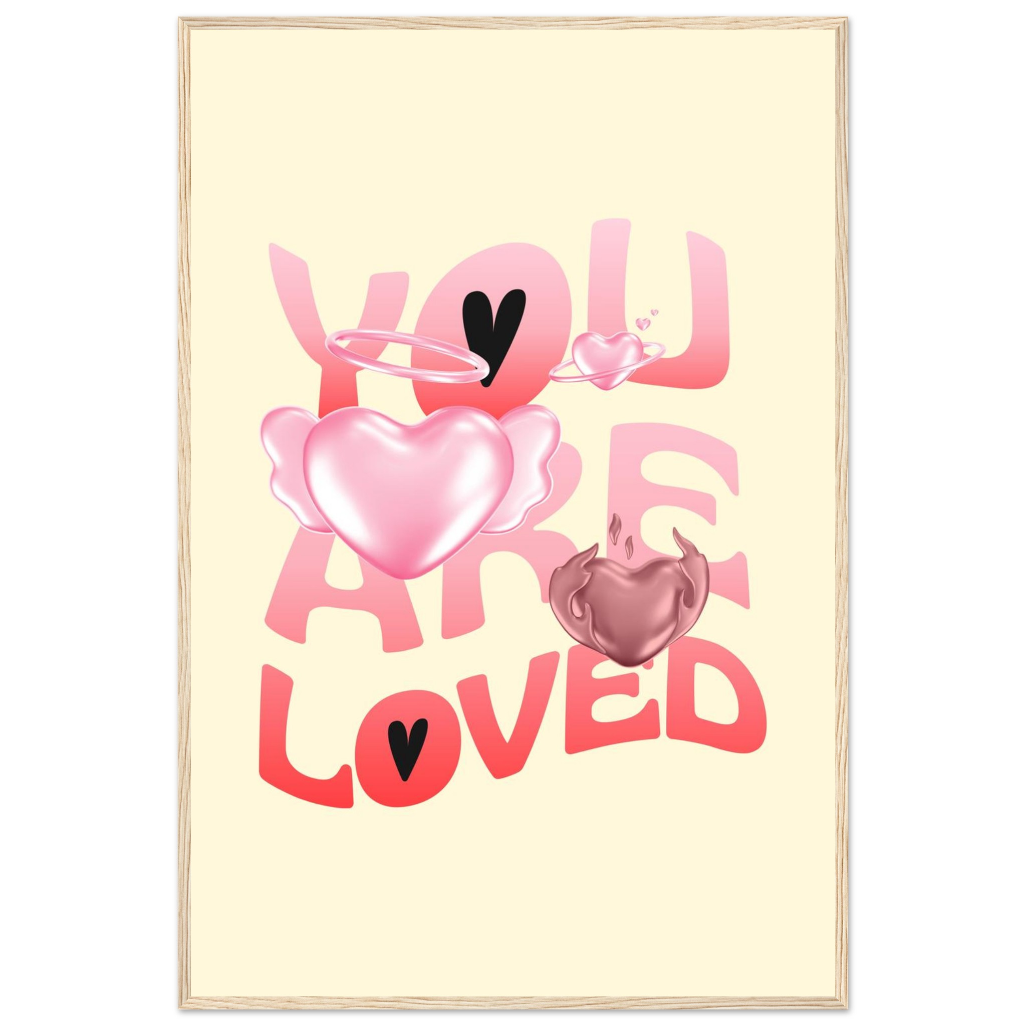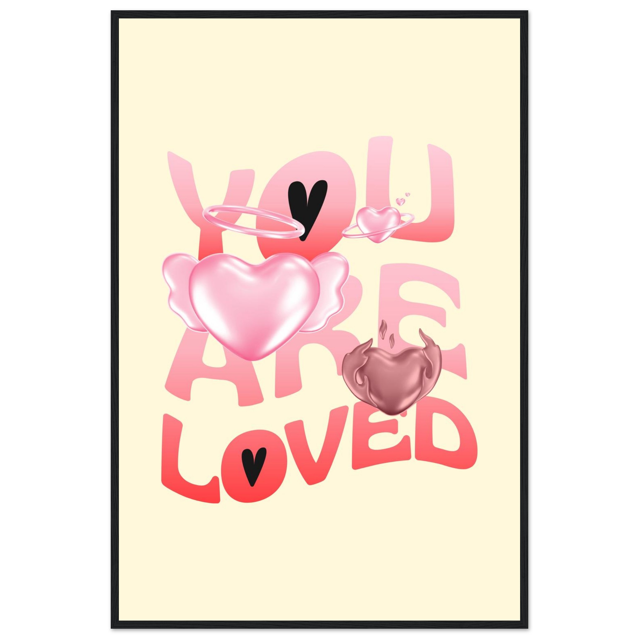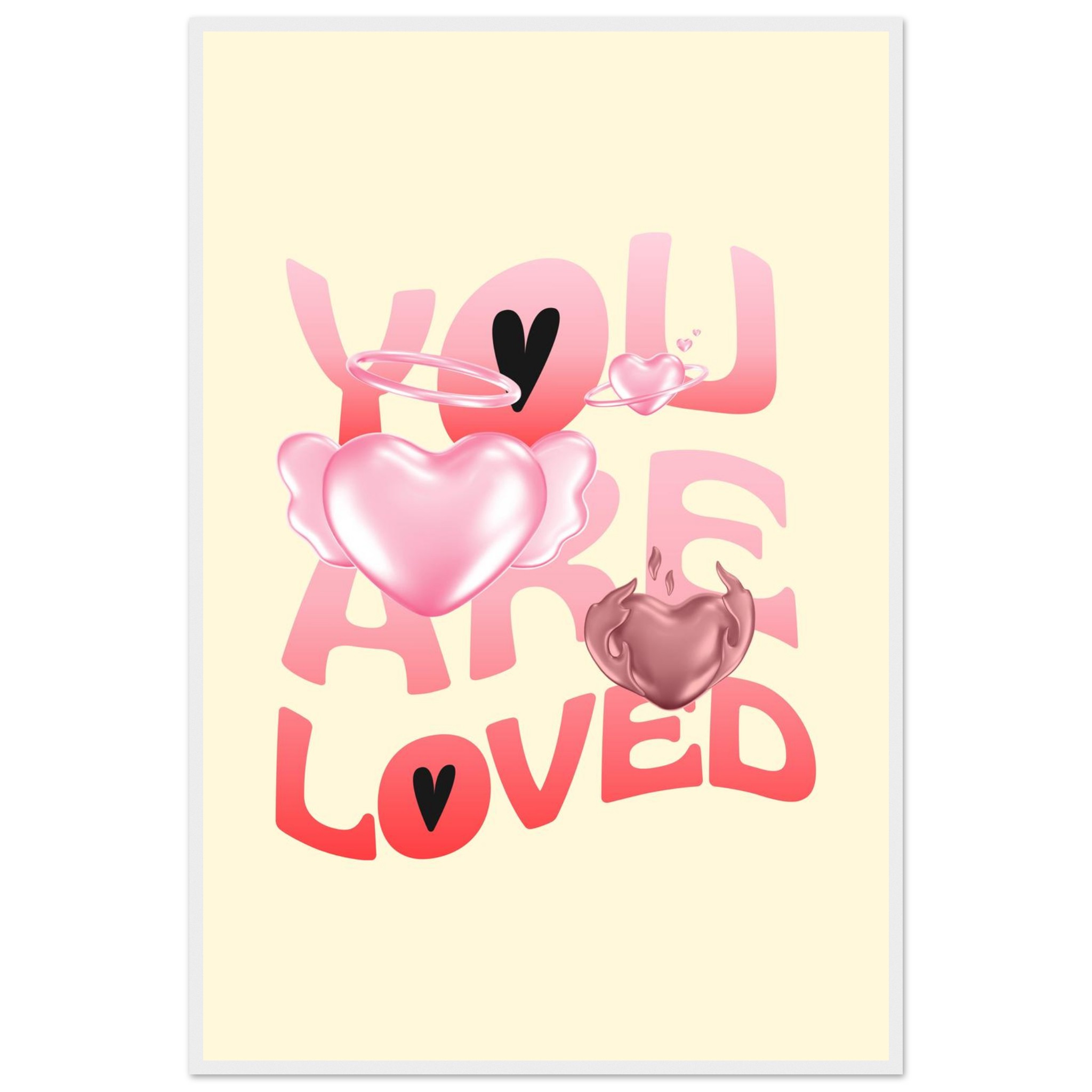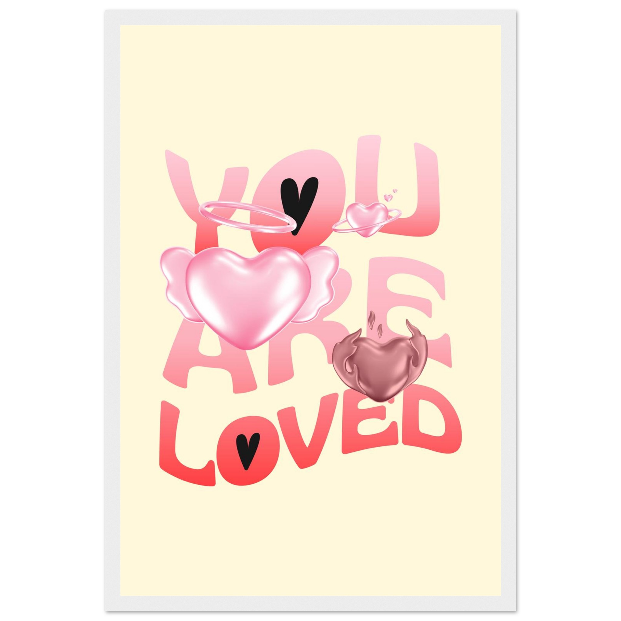 Spread warmth and affection with our “You Are Loved” framed poster, featuring a delightful blend of gradient pink and red hearts, some with ethereal wings and halos, on a soft yellow background. This charming design brings a gentle, loving touch to any space, making it perfect for a nursery, bedroom, or as a thoughtful gift. Each poster is printed on heavyweight white matte paper, offering a smooth, luxurious finish that promises to maintain its vibrancy over time.