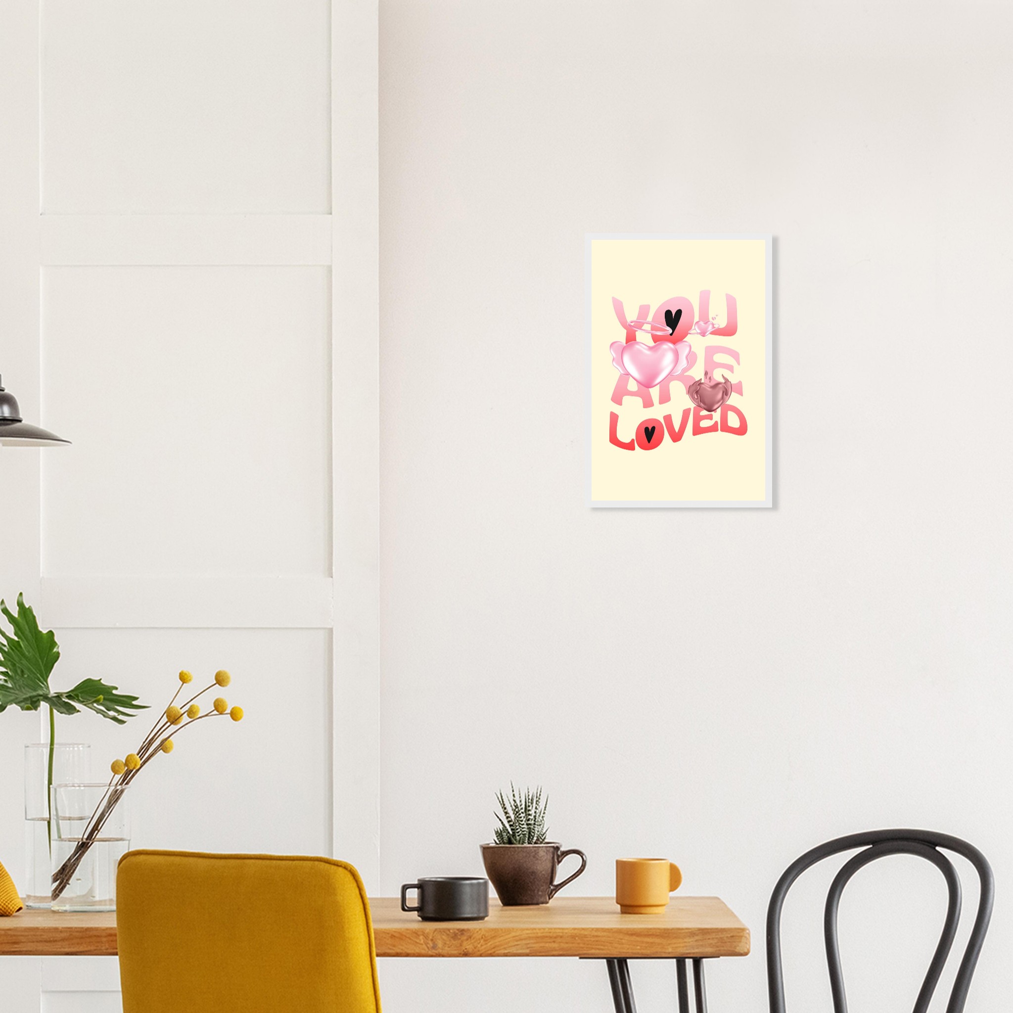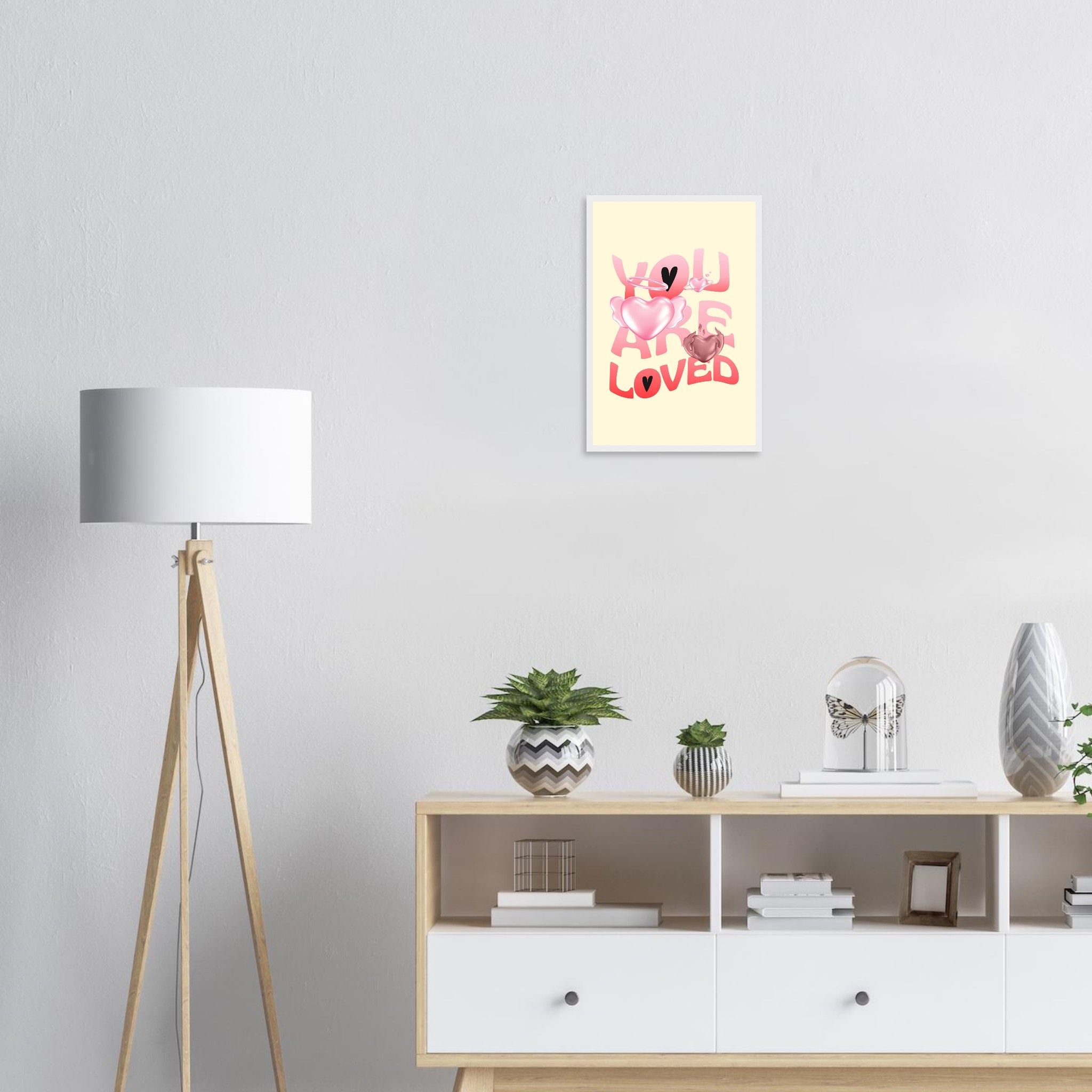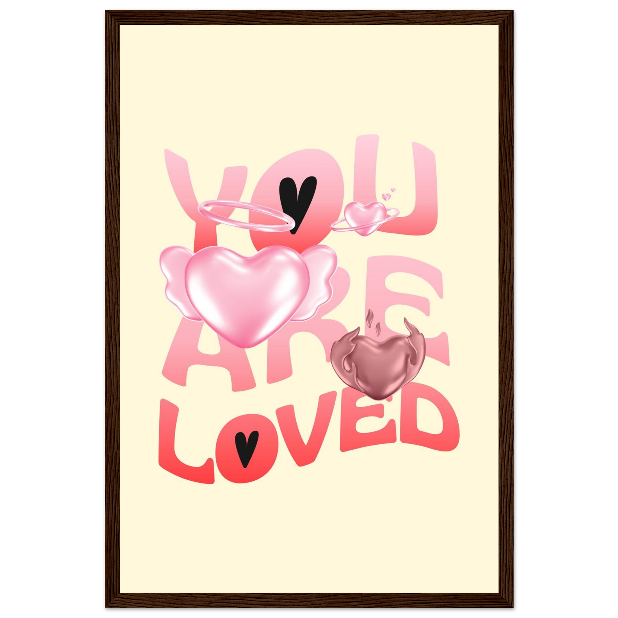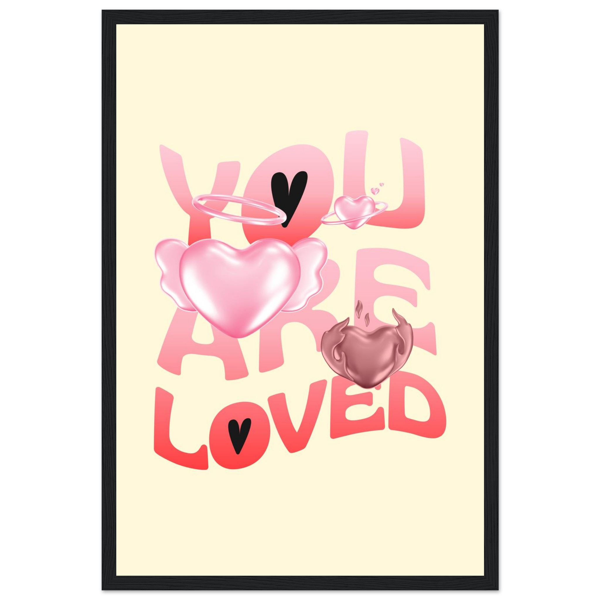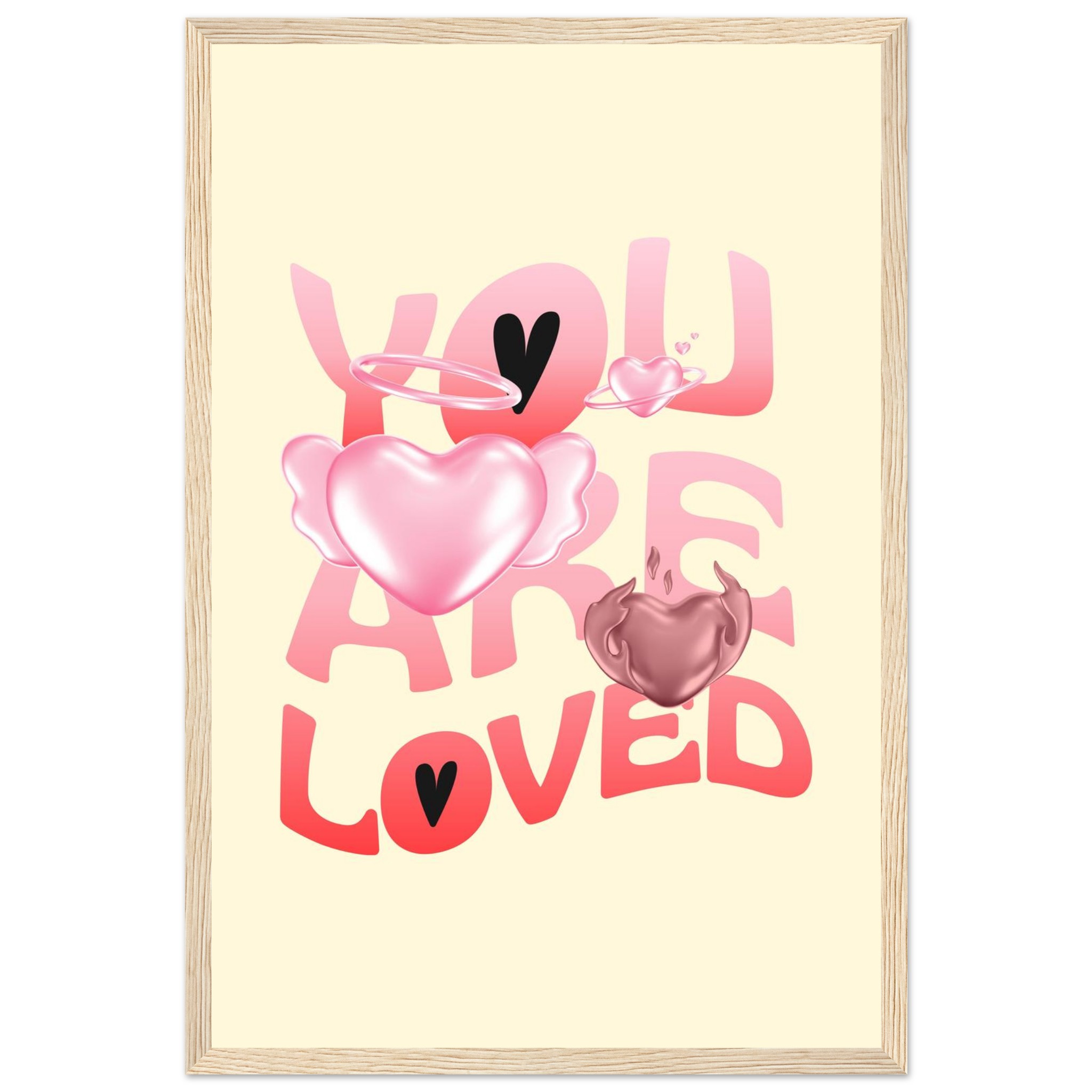 Spread warmth and affection with our “You Are Loved” framed poster, featuring a delightful blend of gradient pink and red hearts, some with ethereal wings and halos, on a soft yellow background. This charming design brings a gentle, loving touch to any space, making it perfect for a nursery, bedroom, or as a thoughtful gift. Each poster is printed on heavyweight white matte paper, offering a smooth, luxurious finish that promises to maintain its vibrancy over time.