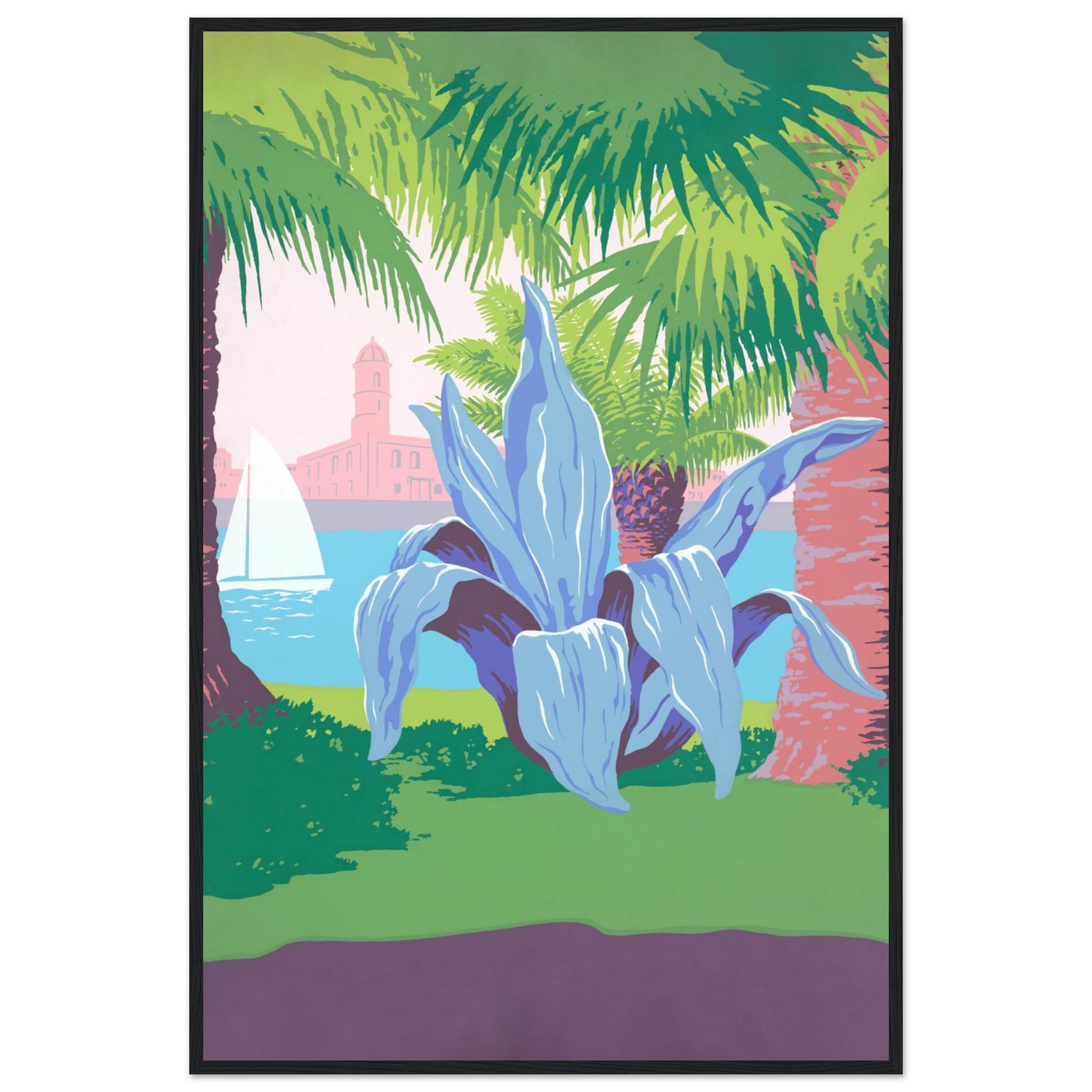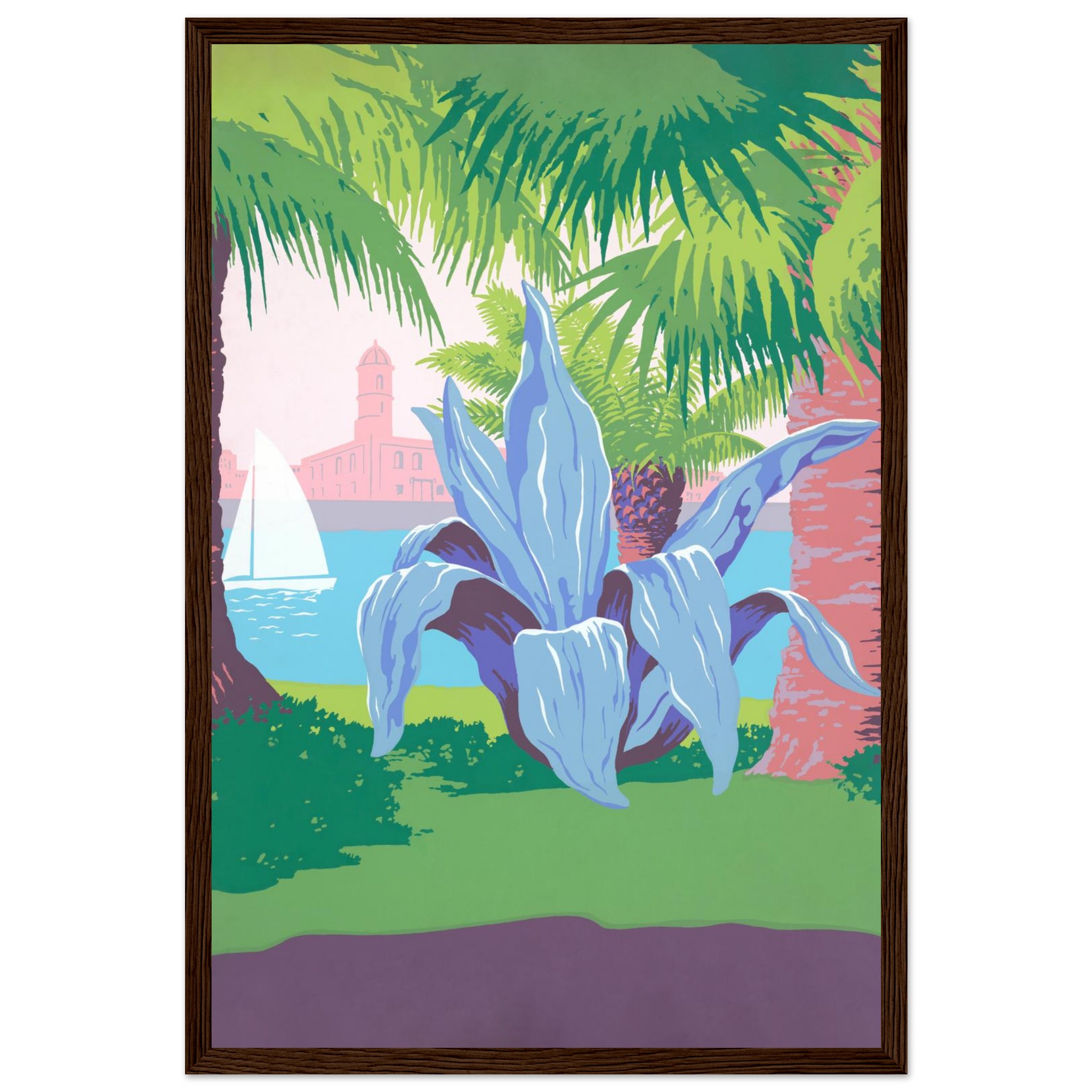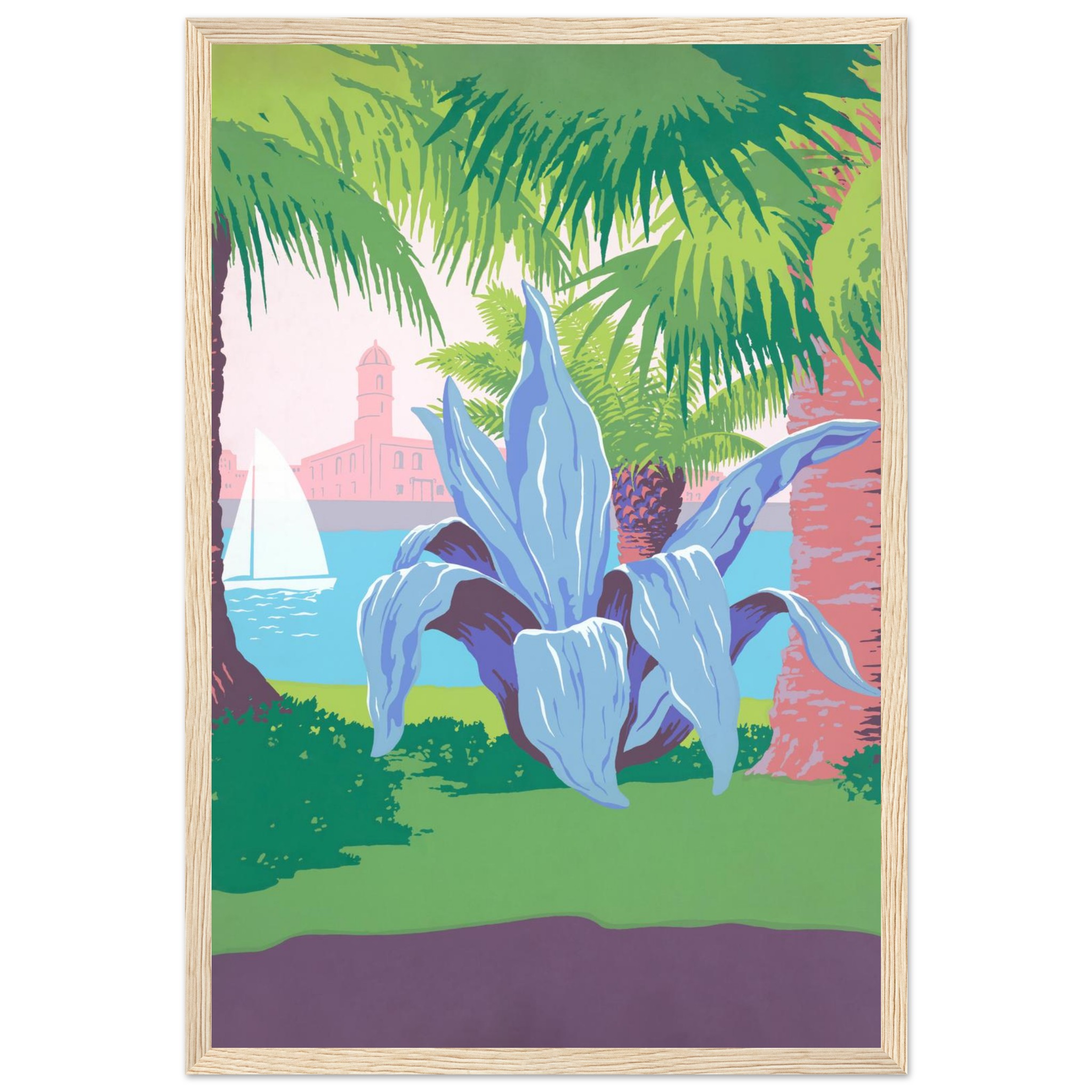Bring the tranquil vibrancy of a coastal dreamscape into your home with this stunning framed poster. Featuring lush palm trees, a majestic agave, and a serene sailboat against a pastel sky, this artwork captures the essence of a sun-kissed escape. Its striking color palette and unique composition offer a refreshingly modern take on tropical serenity.