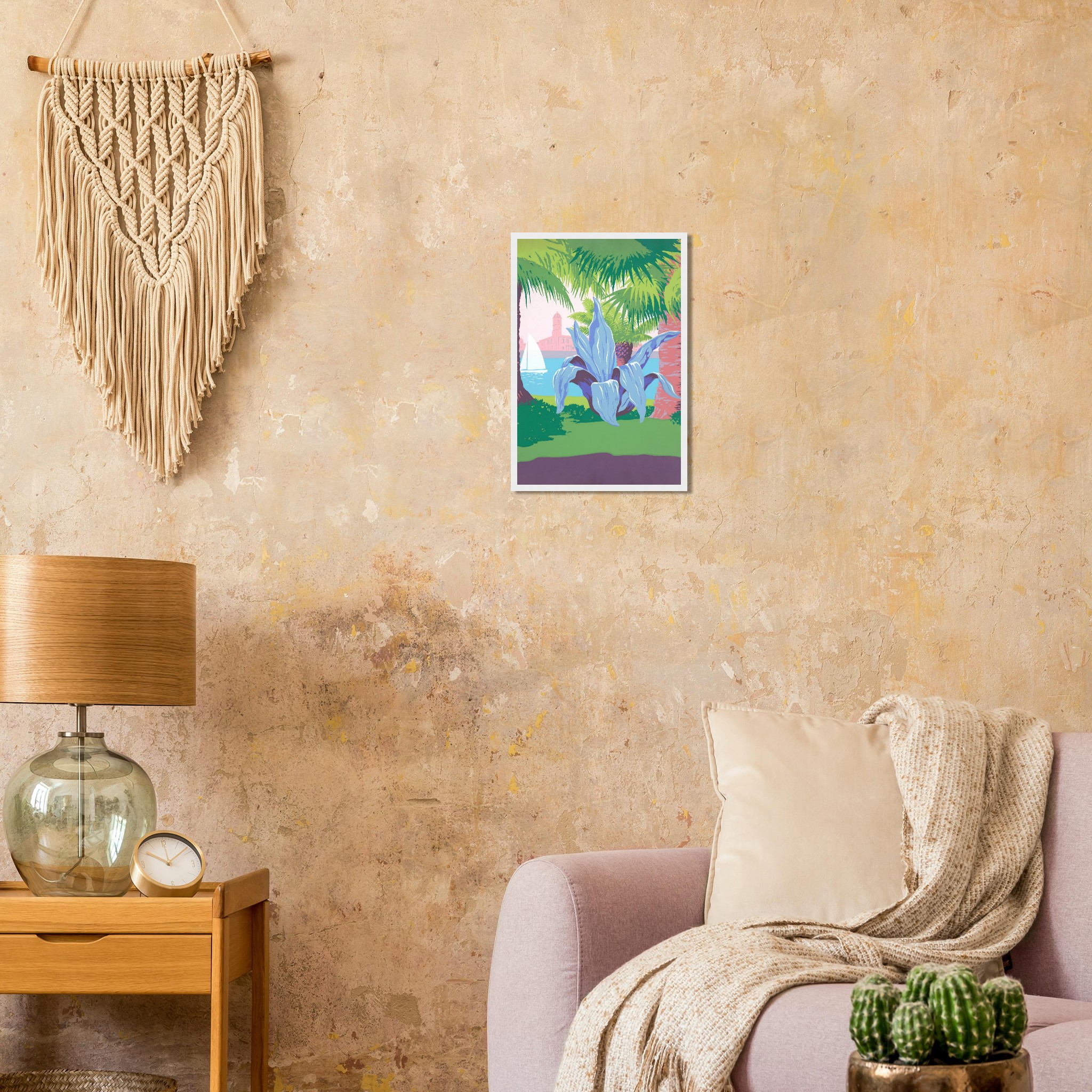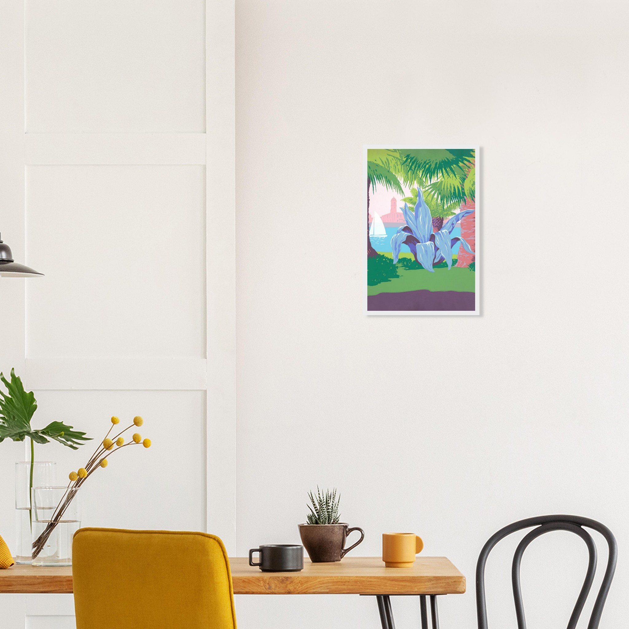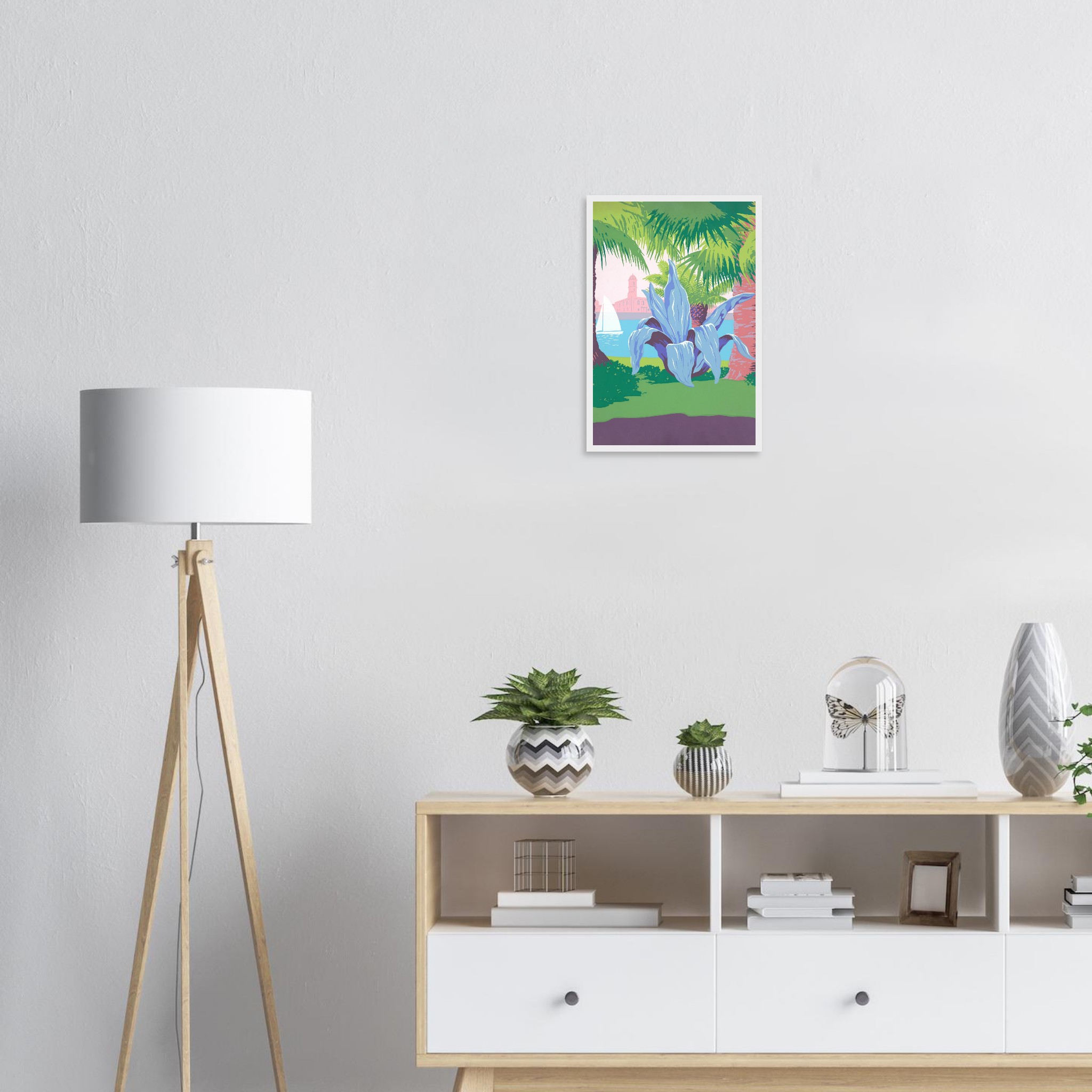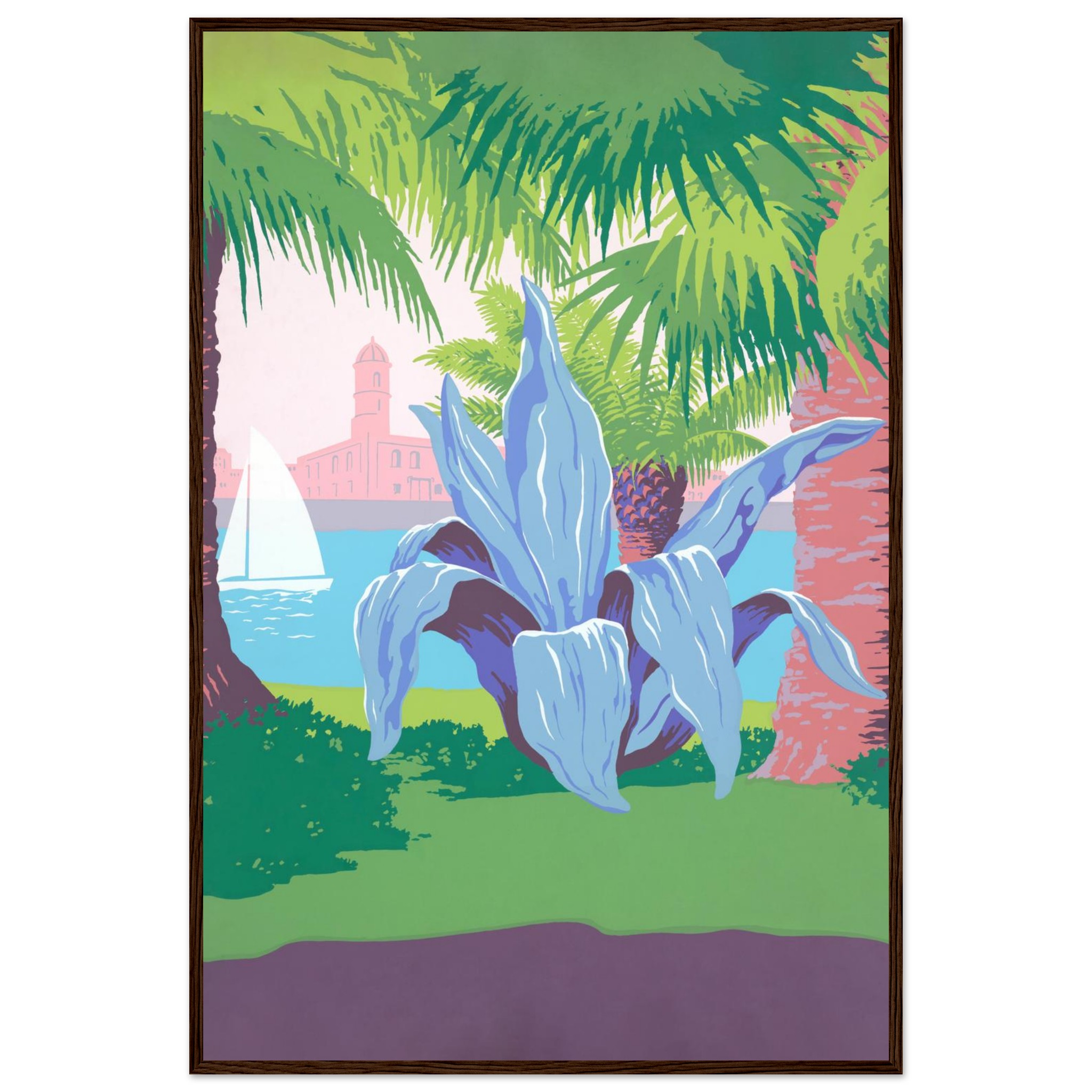 Bring the tranquil vibrancy of a coastal dreamscape into your home with this stunning framed poster. Featuring lush palm trees, a majestic agave, and a serene sailboat against a pastel sky, this artwork captures the essence of a sun-kissed escape. Its striking color palette and unique composition offer a refreshingly modern take on tropical serenity.