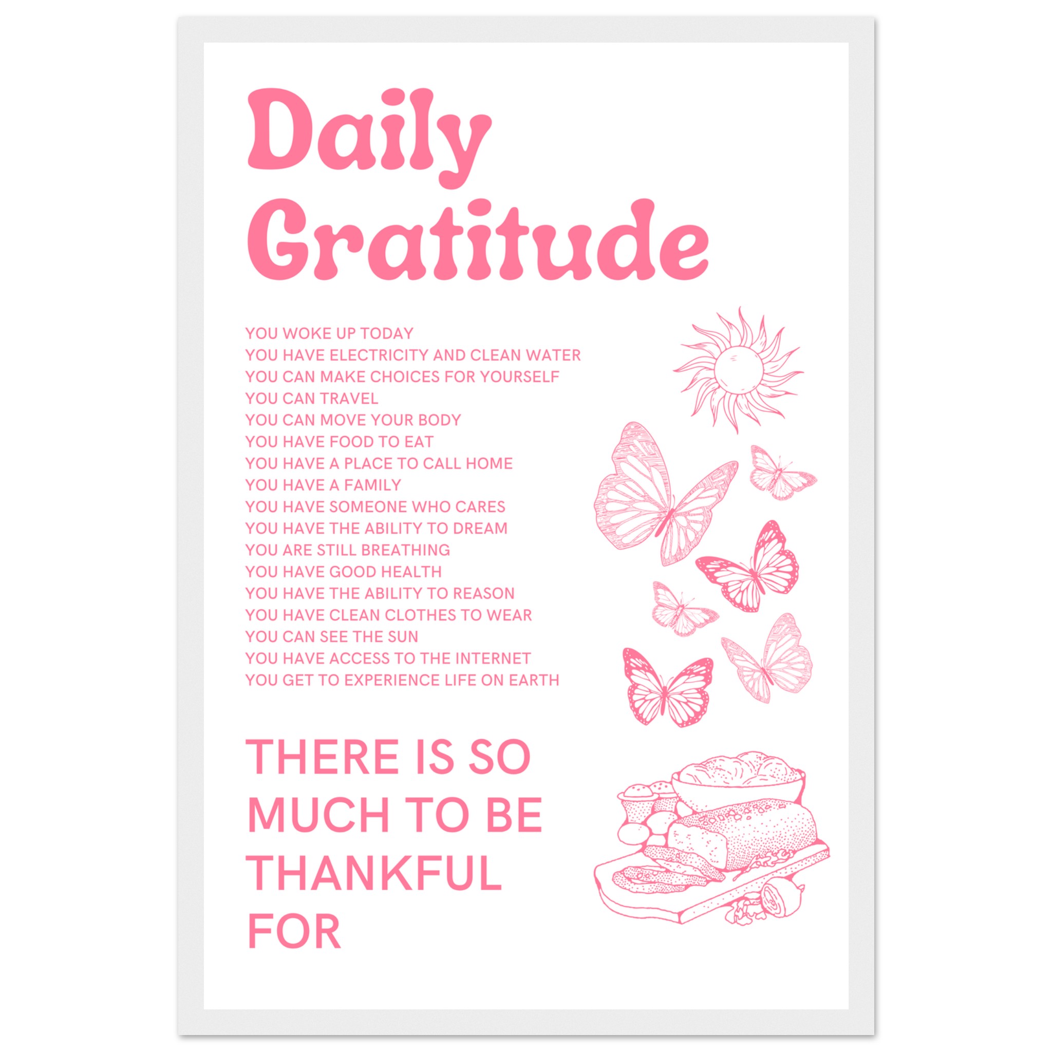 Invite daily doses of joy and gratitude into your space with this inspiring framed poster. Featuring a calming pink palette and uplifting affirmations, this piece is more than just decor—it’s a daily reminder of life’s simple blessings, perfect for creating a positive atmosphere in any room. The charming butterflies and sun details add a touch of whimsy, encouraging a lighthearted approach to mindfulness.