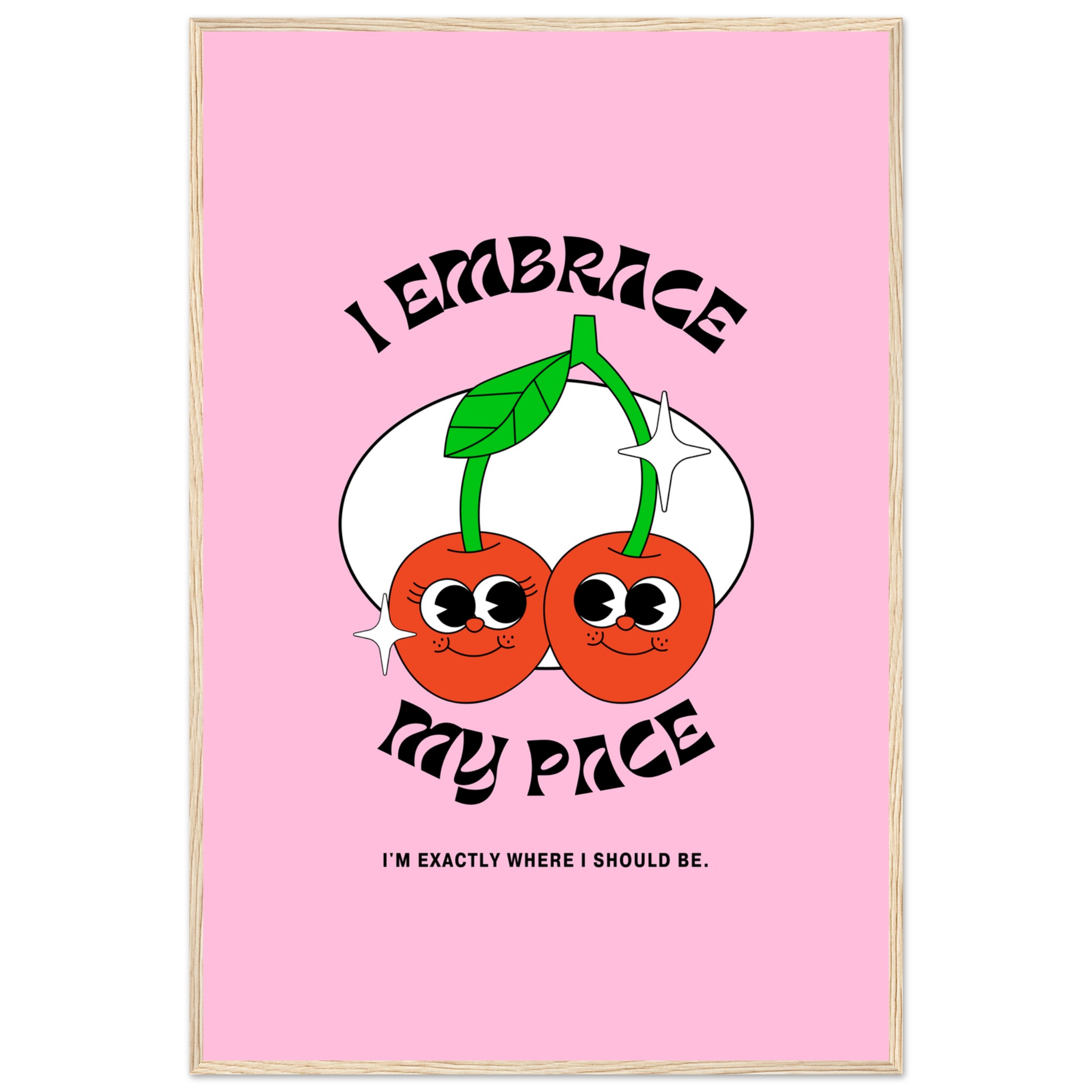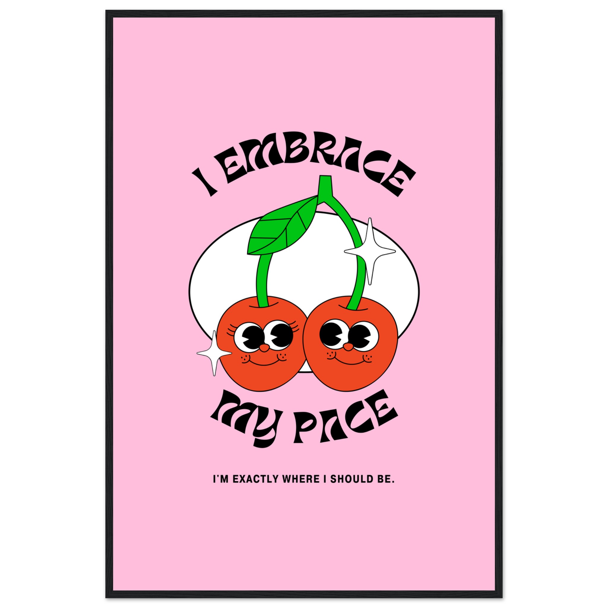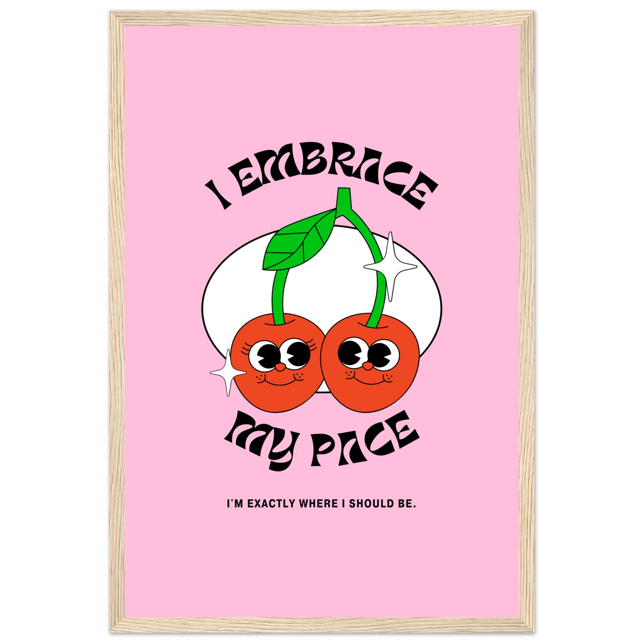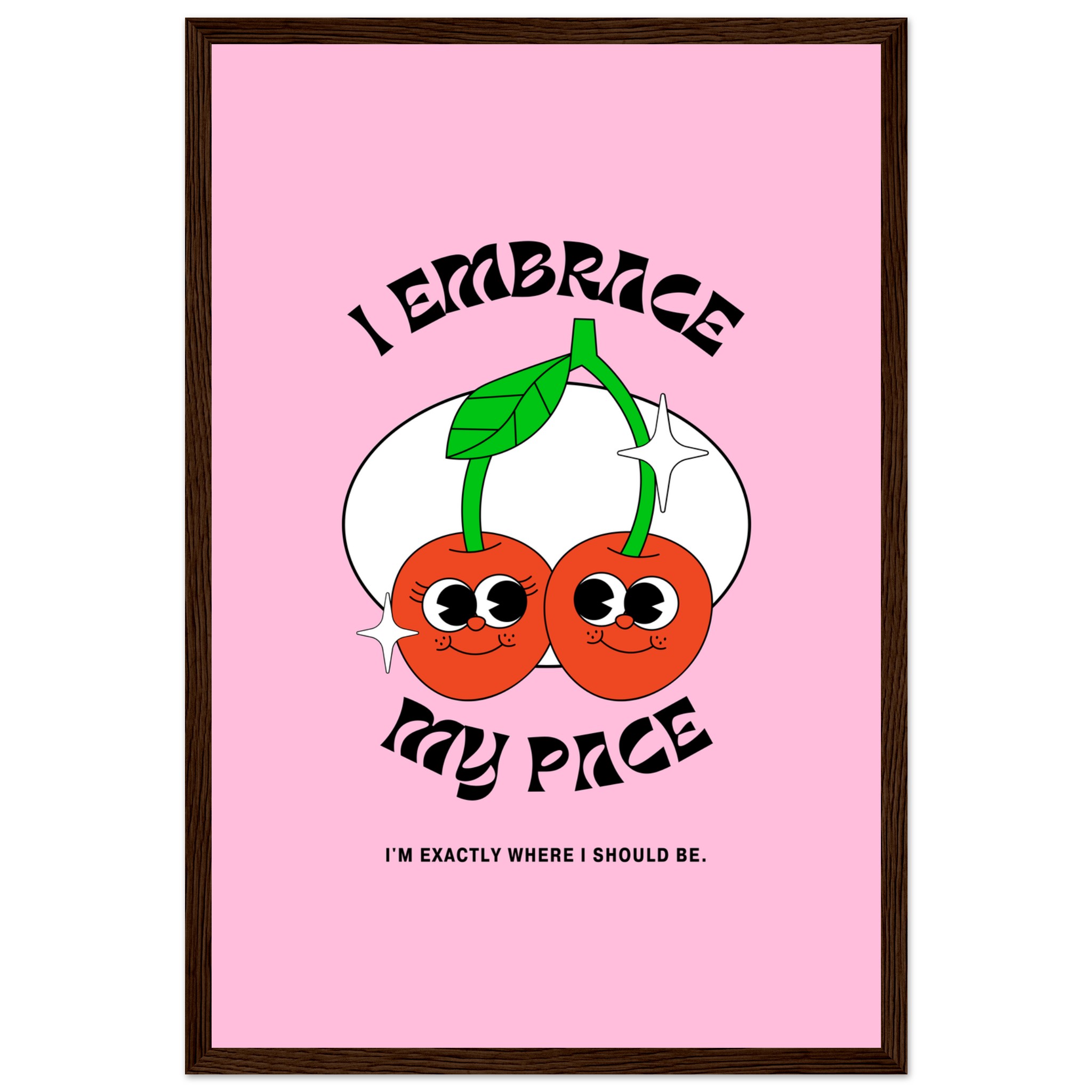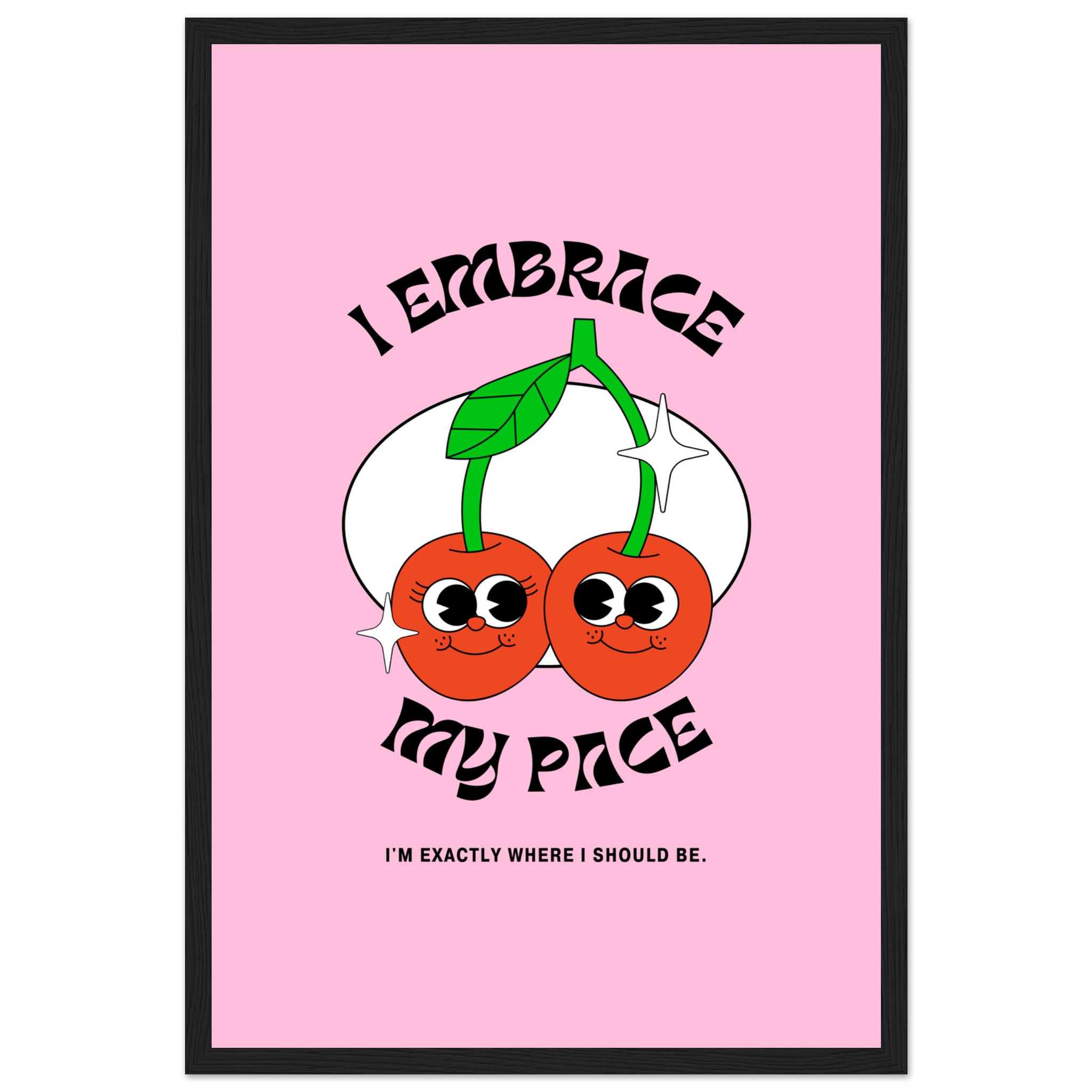 Celebrate self-love and good vibes with our “I Embrace My Pace” framed poster, featuring adorable, retro-style cherries that radiate positive energy! This playful and empowering artwork, set against a cheerful pink backdrop, is perfect for adding a touch of whimsy and daily affirmation to any space. It’s a delightful reminder to appreciate your journey, exactly where you are.