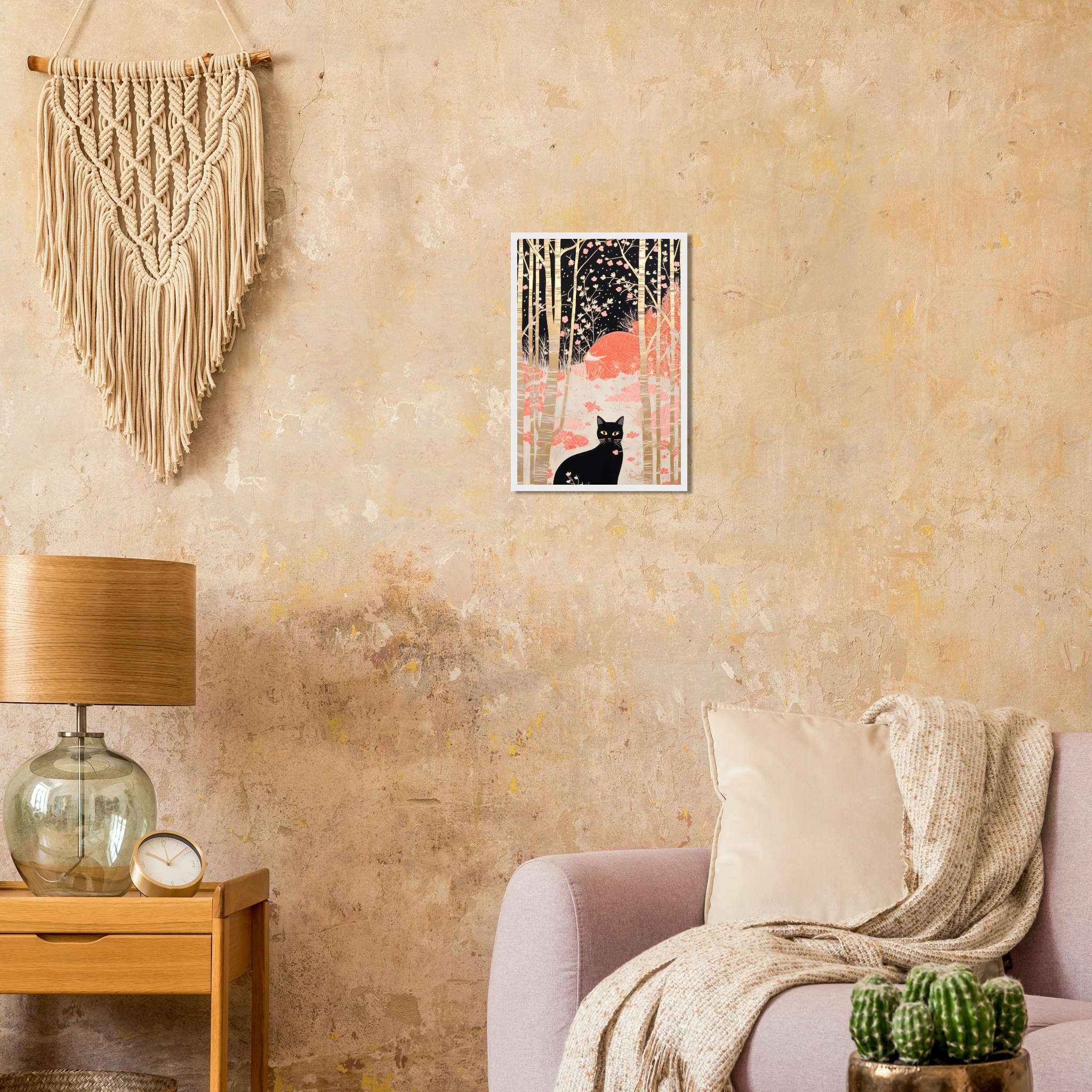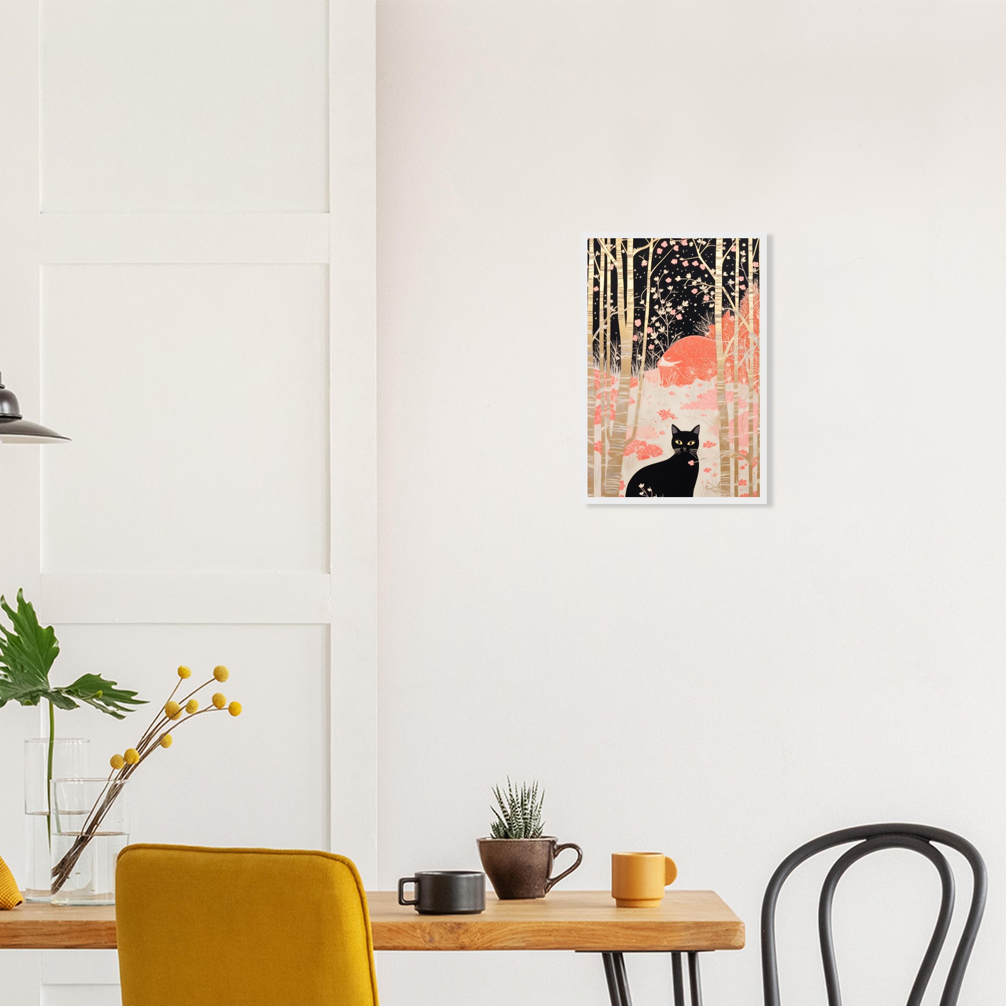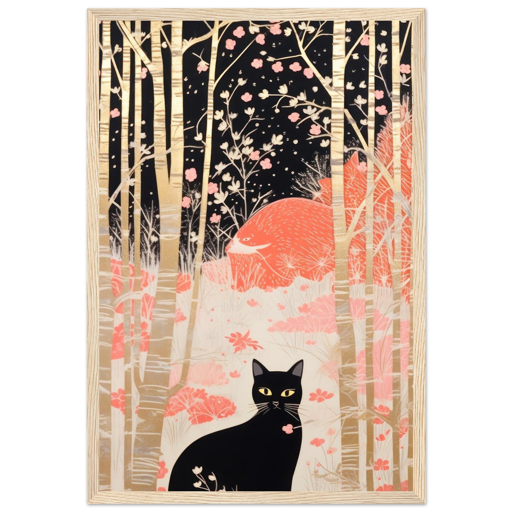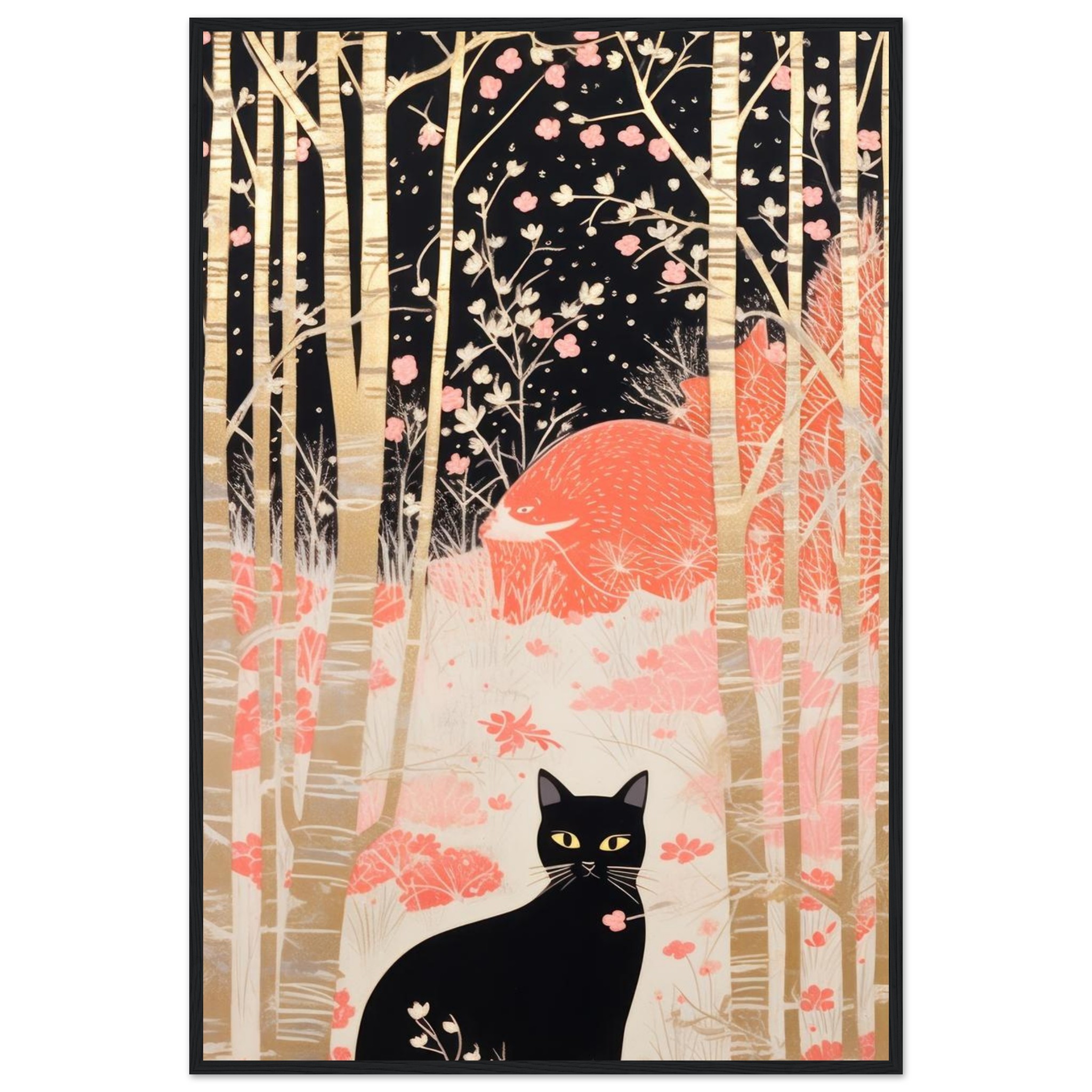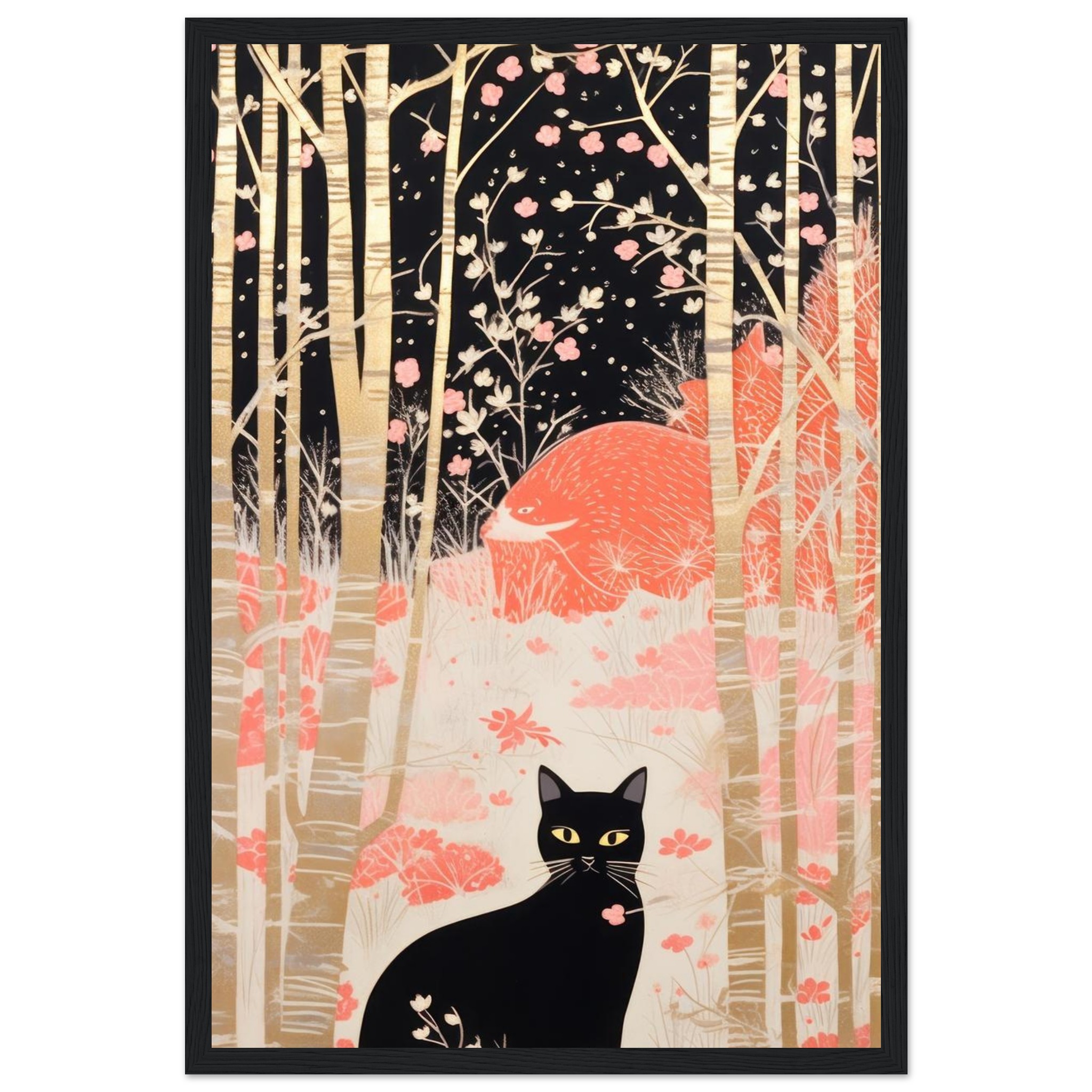 Invite a touch of serene mystery and natural elegance into your home with this captivating framed poster. Featuring a sleek black cat with piercing yellow eyes, nestled amongst a stylized forest of golden birch trees and delicate pink blossoms against a dark, ethereal backdrop, this artwork evokes a sense of whimsical charm and quiet contemplation. It’s a perfect piece to add character and a conversation starter to any room, offering a unique blend of modern illustration and timeless allure.