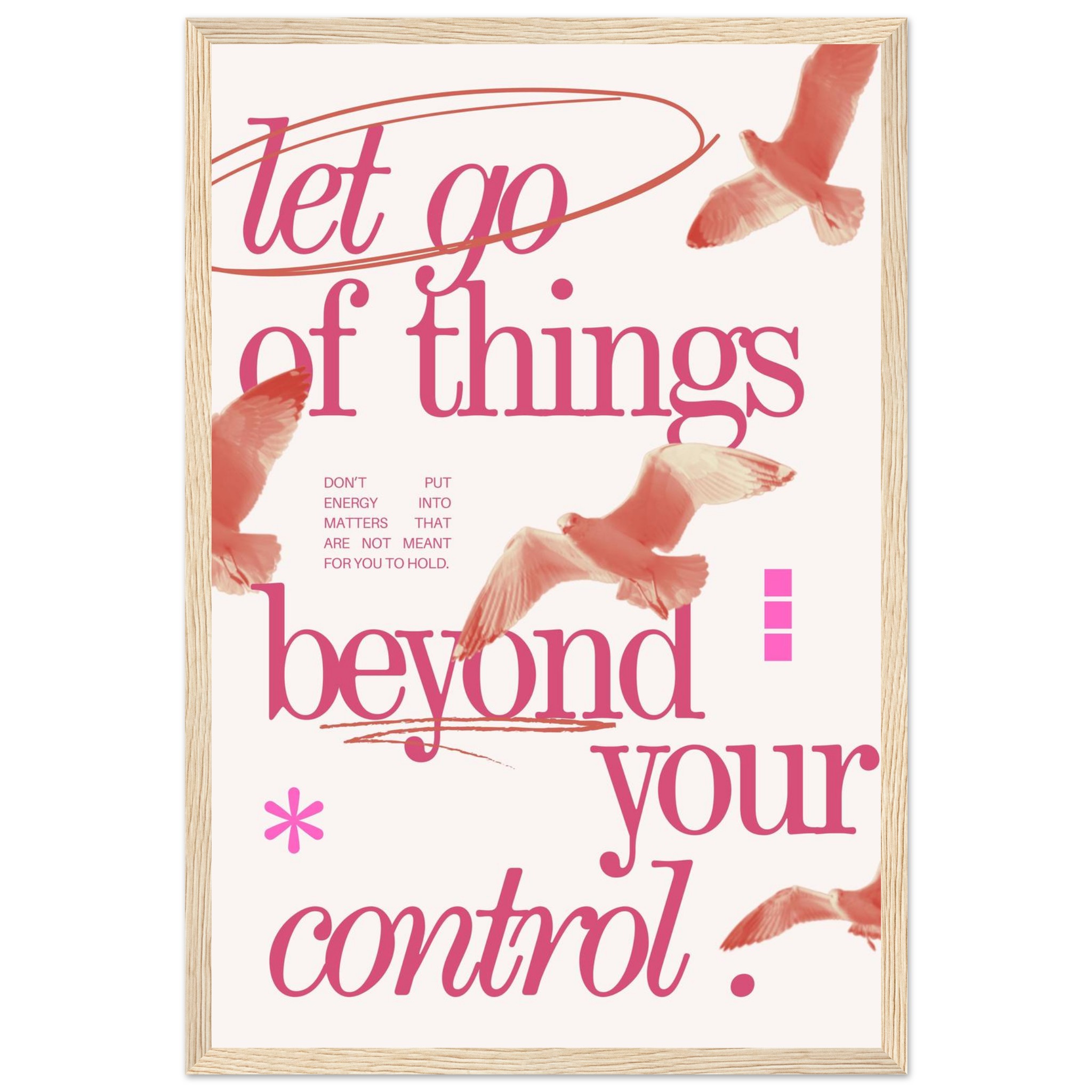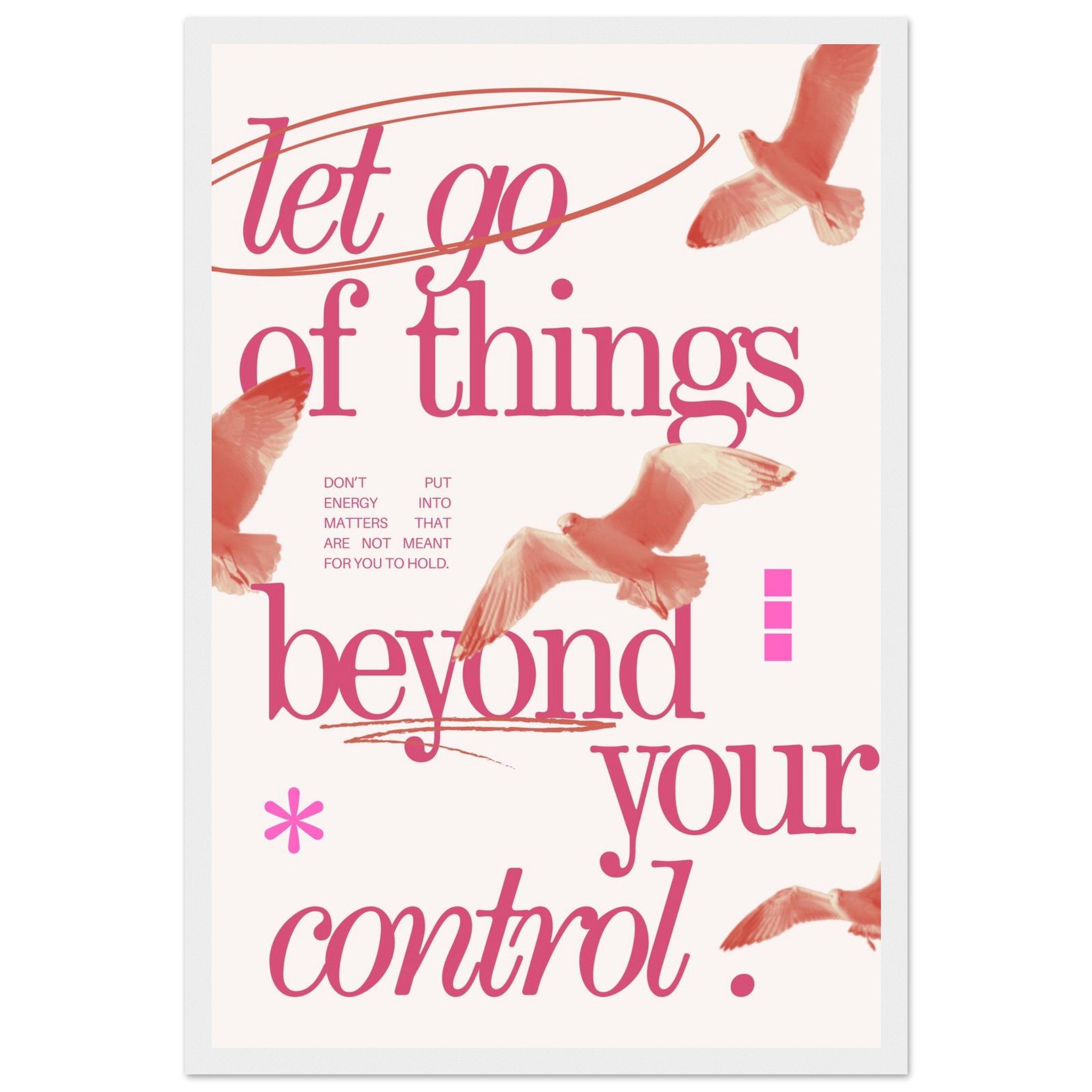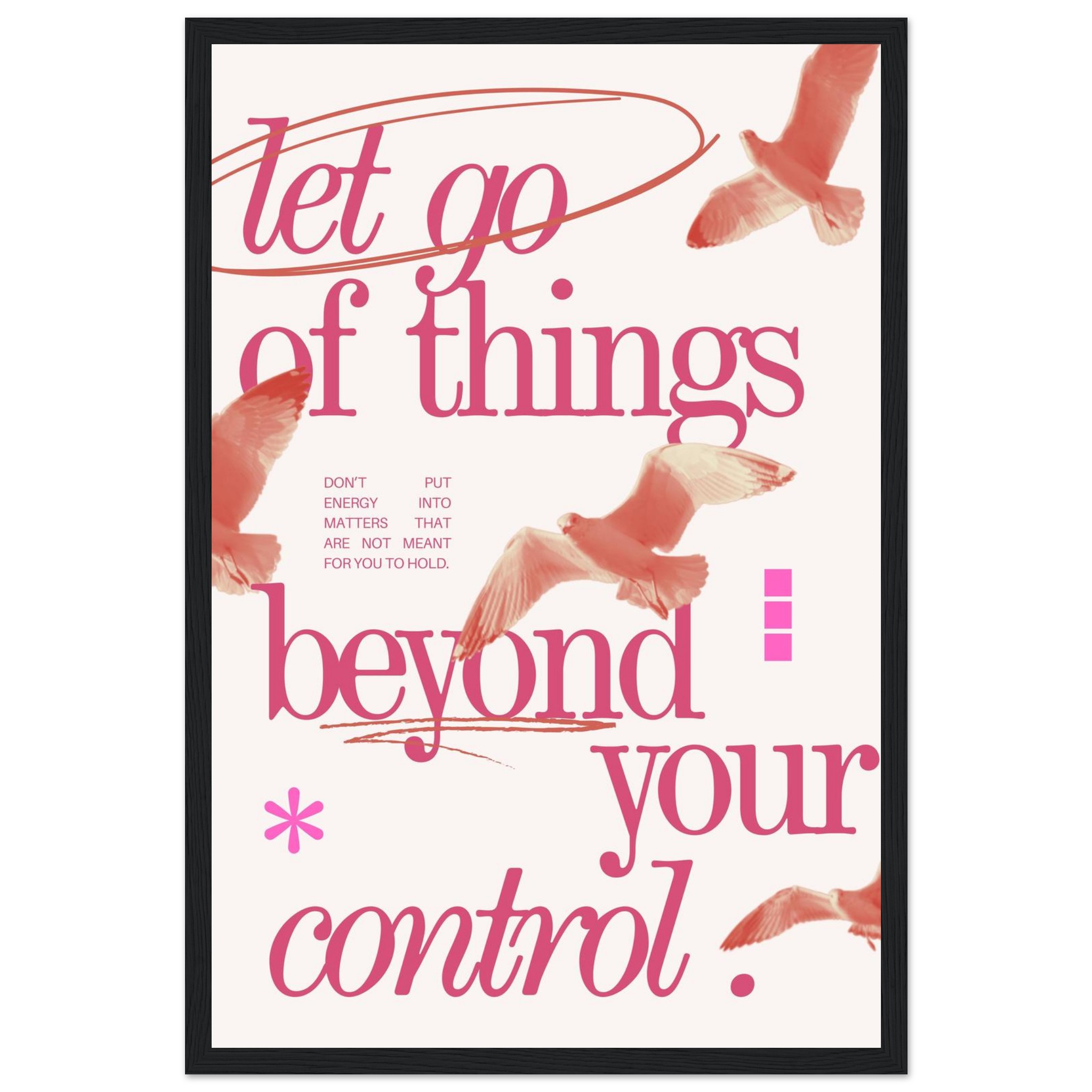 Embrace a philosophy of freedom and serenity with our ‘Let Go of Things Beyond Your Control’ framed poster. Featuring elegant script and subtle imagery of soaring birds in a beautiful coral pink palette, this piece serves as a gentle daily reminder to release what doesn’t serve you. It’s more than just decor; it’s a statement of peace and a beacon of mindful living, perfect for any space needing a touch of calm and inspiration.