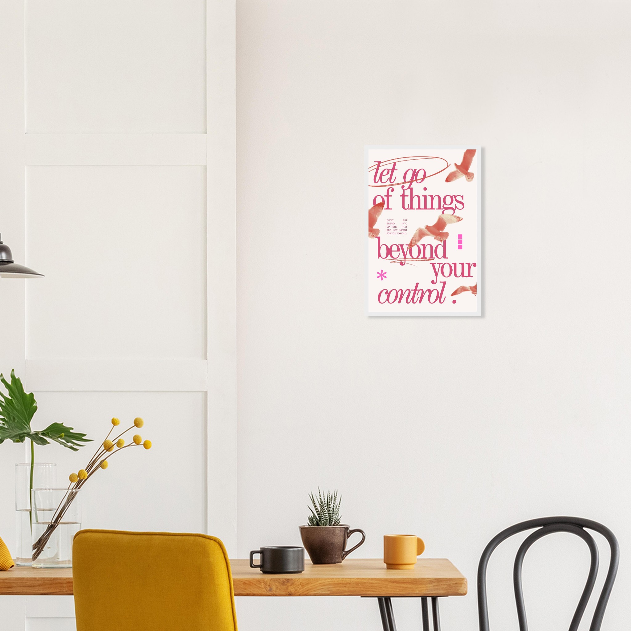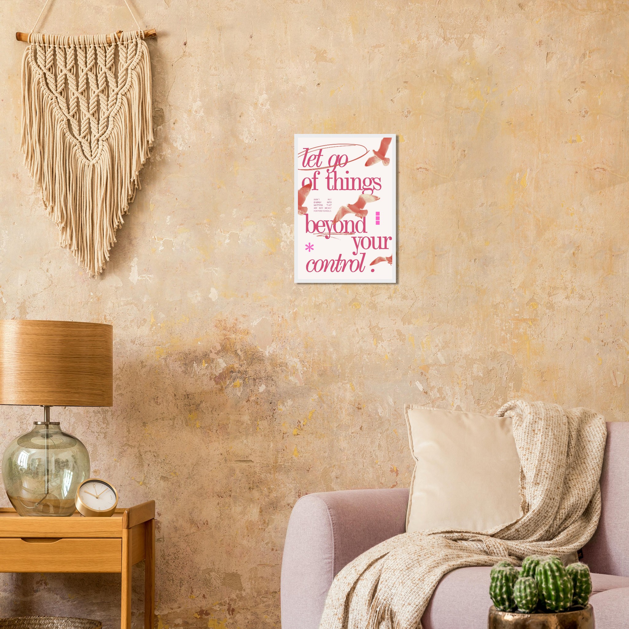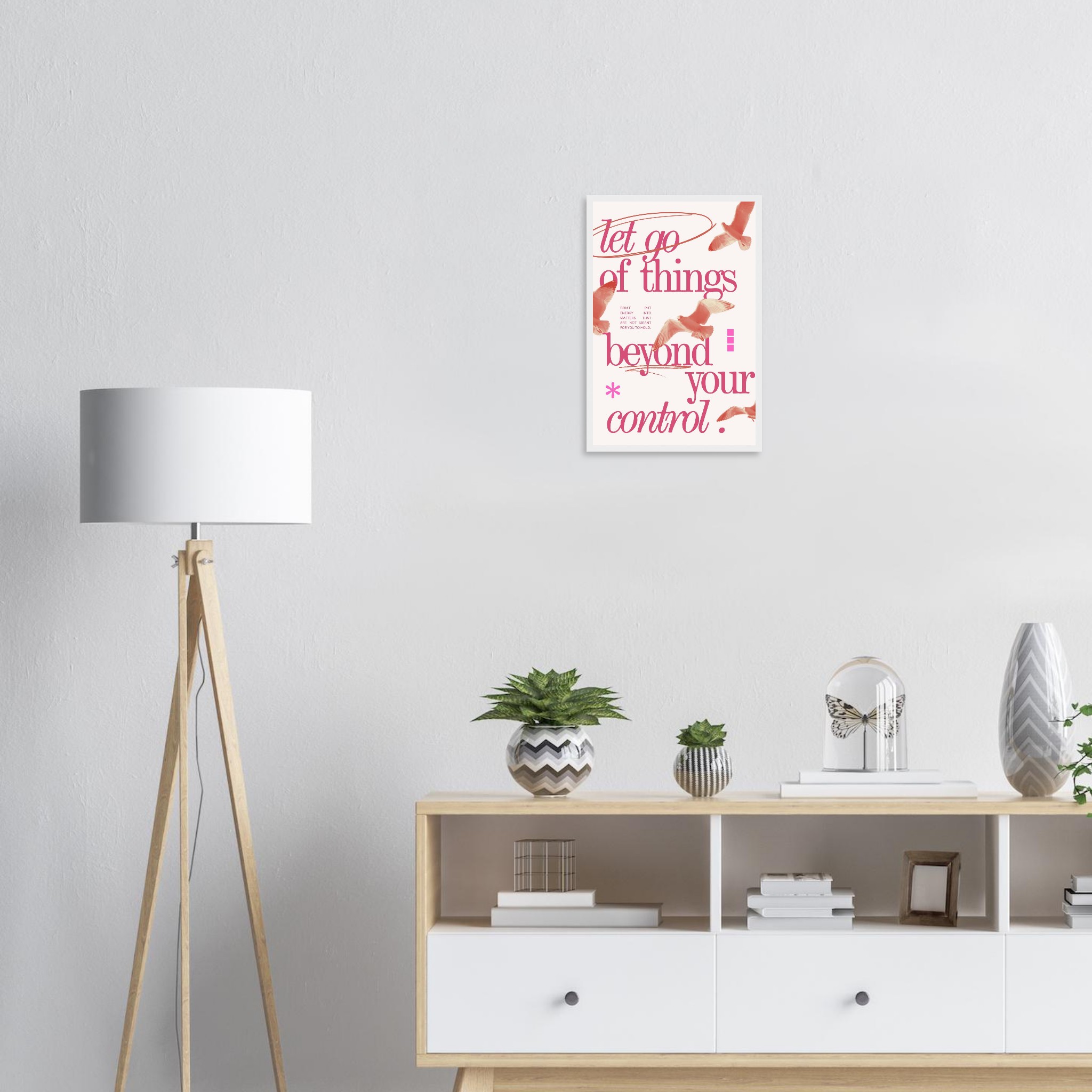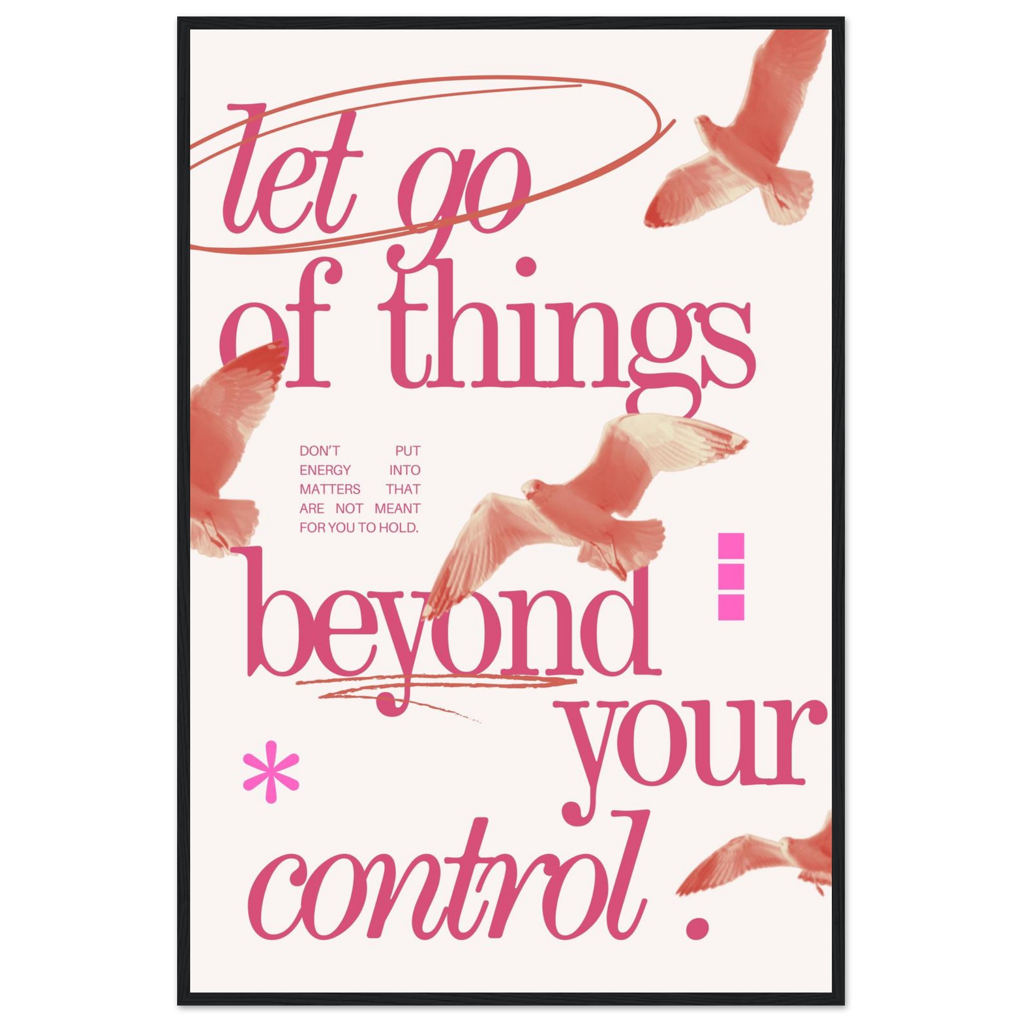 Embrace a philosophy of freedom and serenity with our ‘Let Go of Things Beyond Your Control’ framed poster. Featuring elegant script and subtle imagery of soaring birds in a beautiful coral pink palette, this piece serves as a gentle daily reminder to release what doesn’t serve you. It’s more than just decor; it’s a statement of peace and a beacon of mindful living, perfect for any space needing a touch of calm and inspiration.
