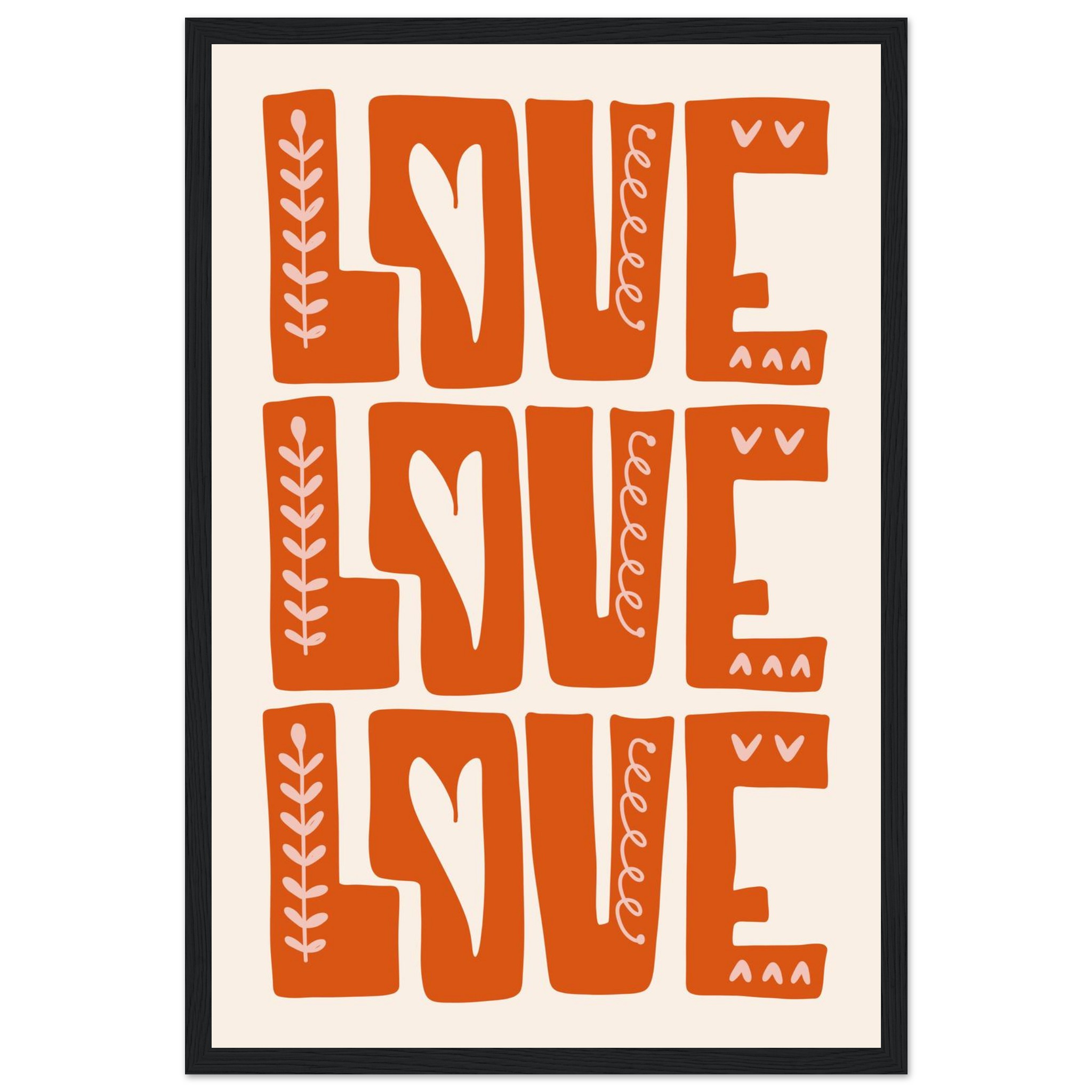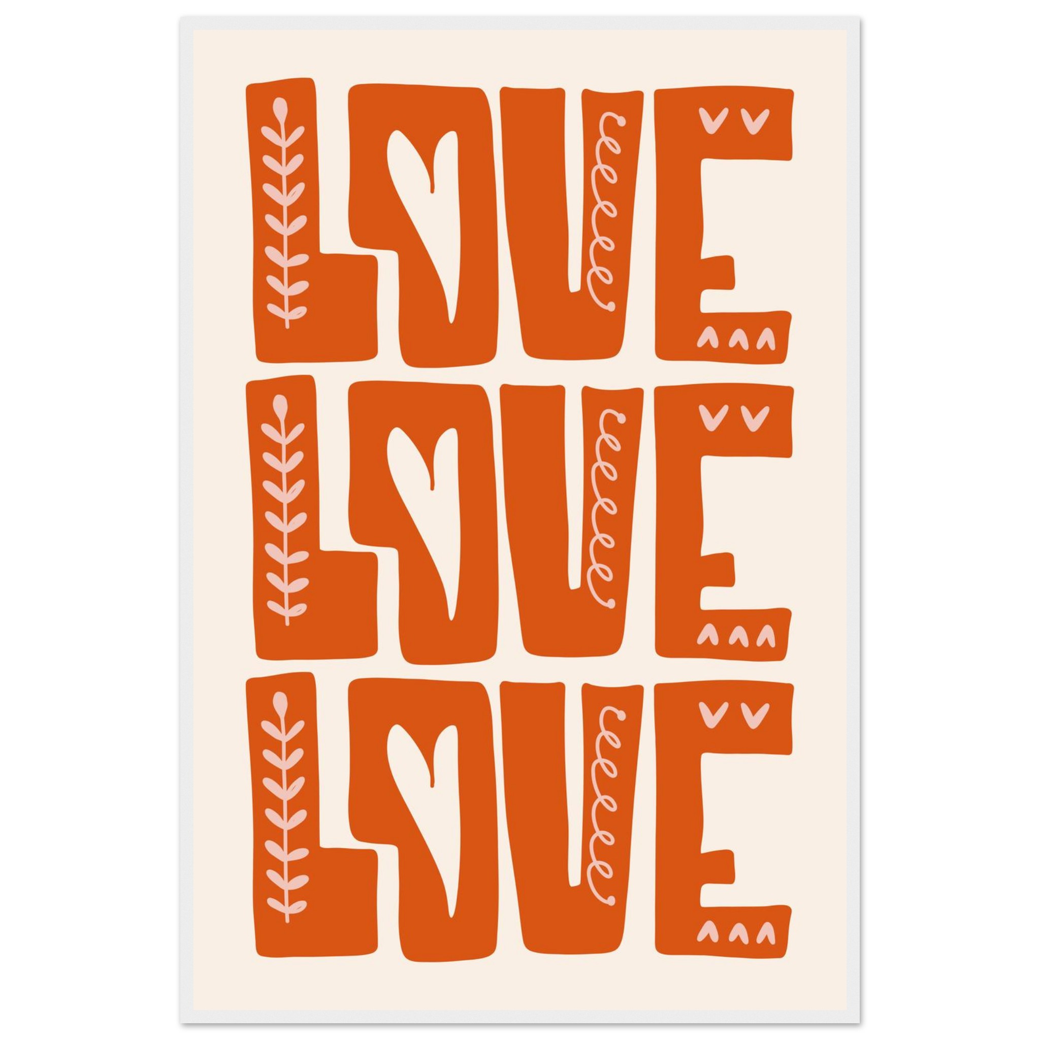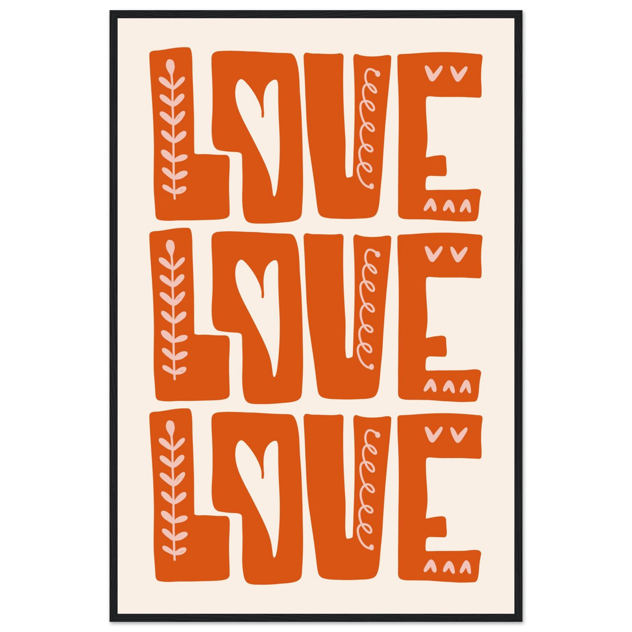 Infuse your space with a heartfelt, boho-chic vibe with our ‘Love Repetition’ framed poster. Featuring a captivating hand-drawn aesthetic and a warm, inviting color palette of burnt orange and soft cream, this piece brings a touch of organic charm and positivity to any room. It’s more than just decor; it’s a statement of love, beautifully crafted to inspire warmth and connection.