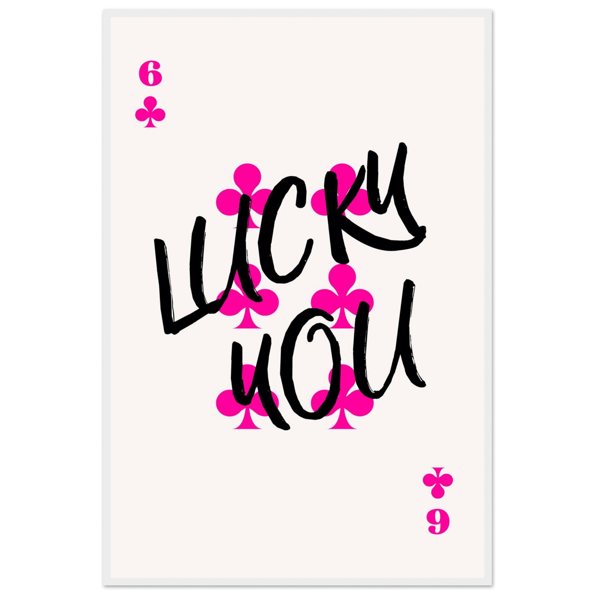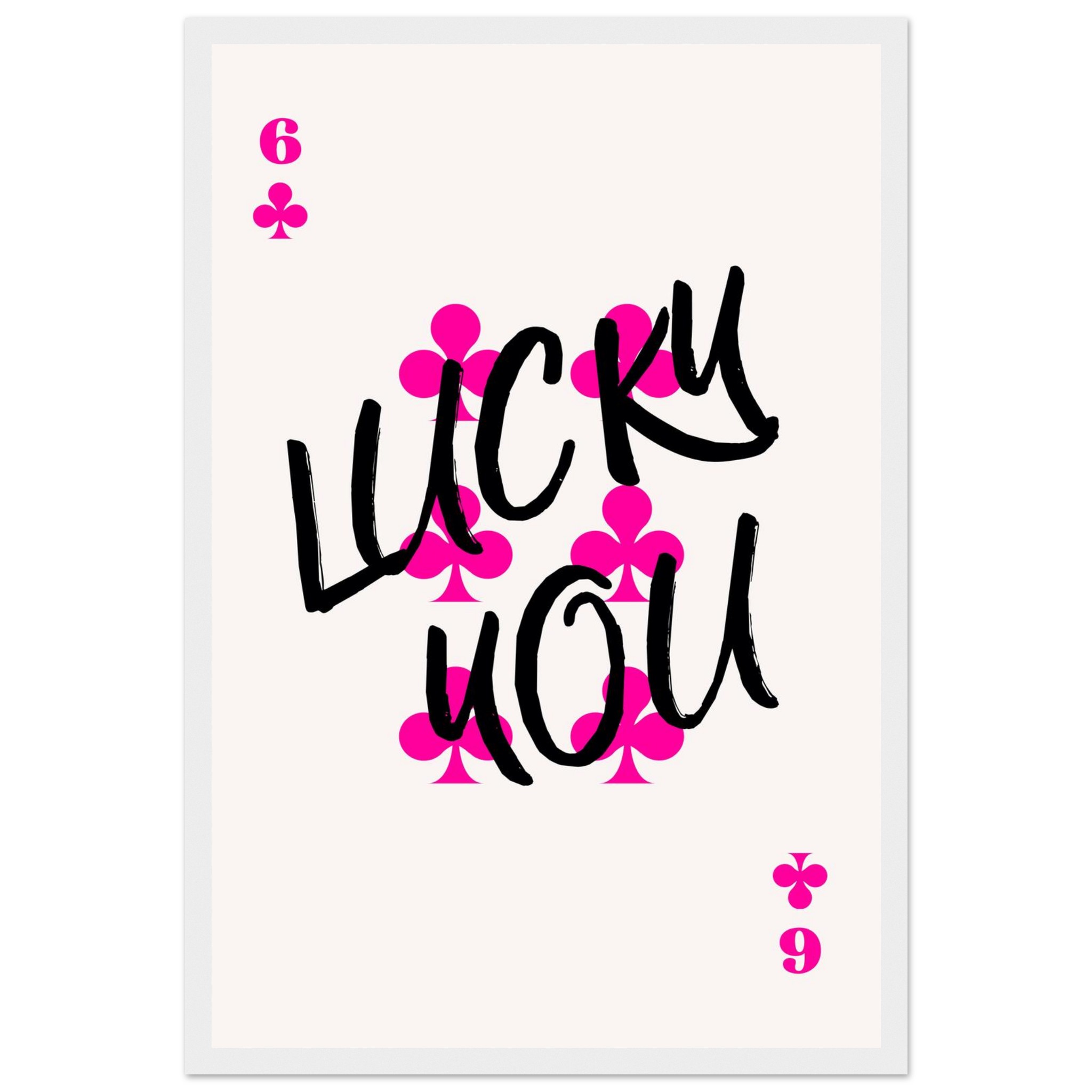 Bring a touch of playful charm and bold personality to your space with our “Lucky You” framed poster. Featuring a striking design reminiscent of a poker card, complete with vibrant hot pink club symbols and confident black brush-script typography, this piece is perfect for those who embrace fun and a bit of daring. It’s a fantastic conversation starter and a stylish way to add a pop of color to any room, whether it’s your game den, living room, or office.