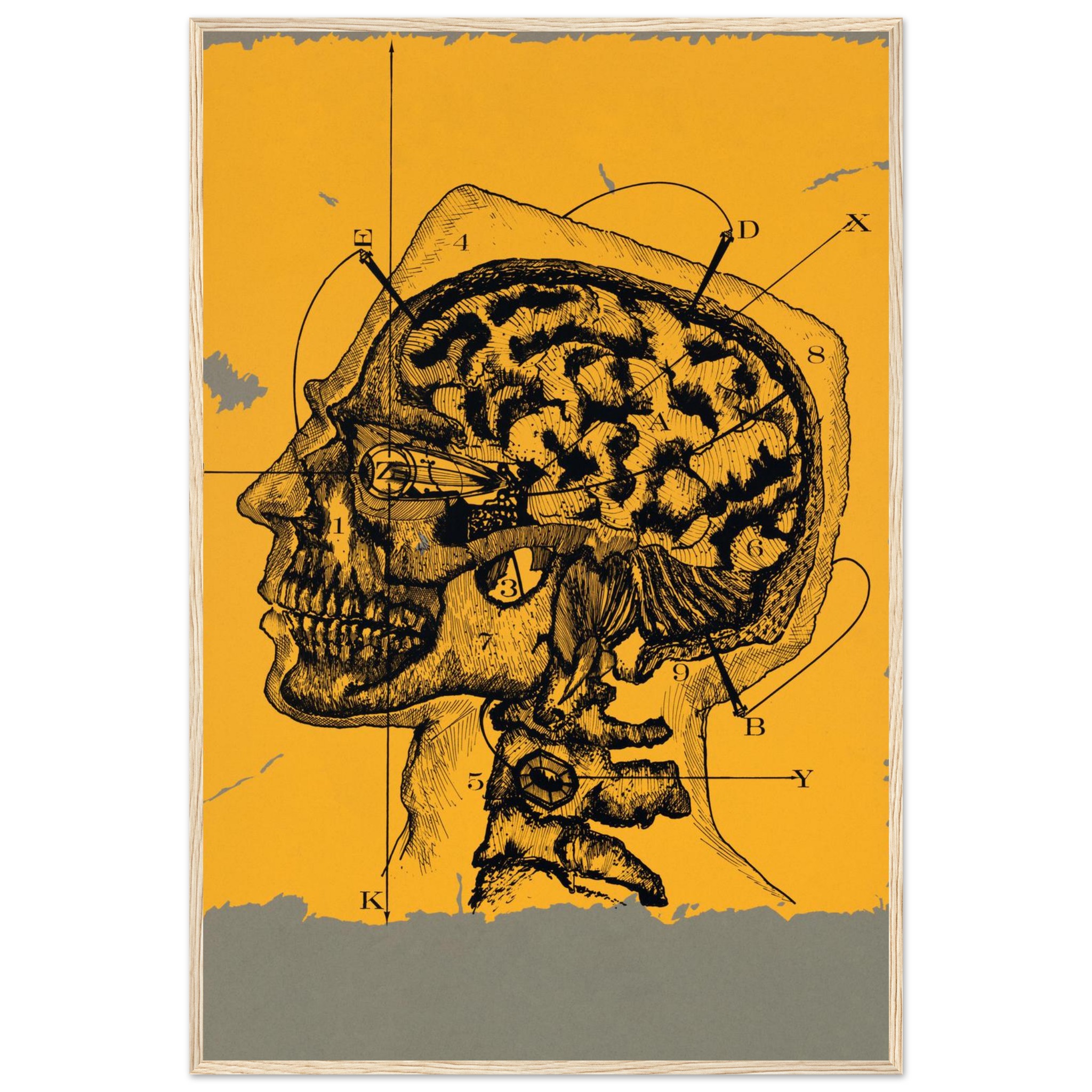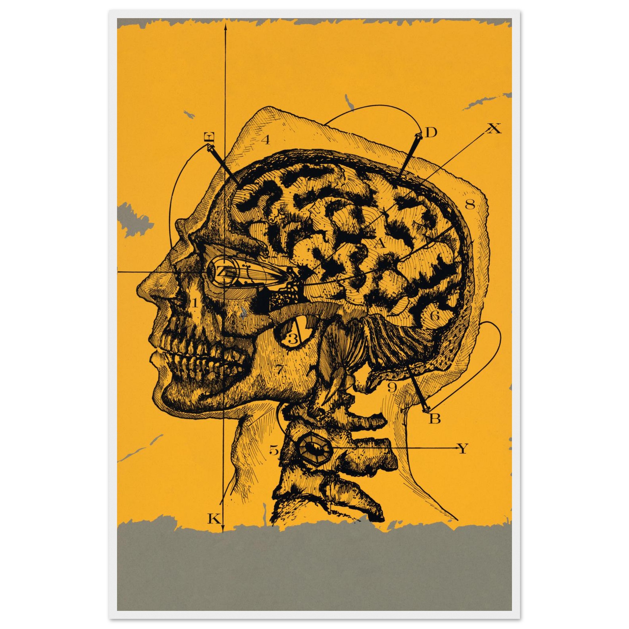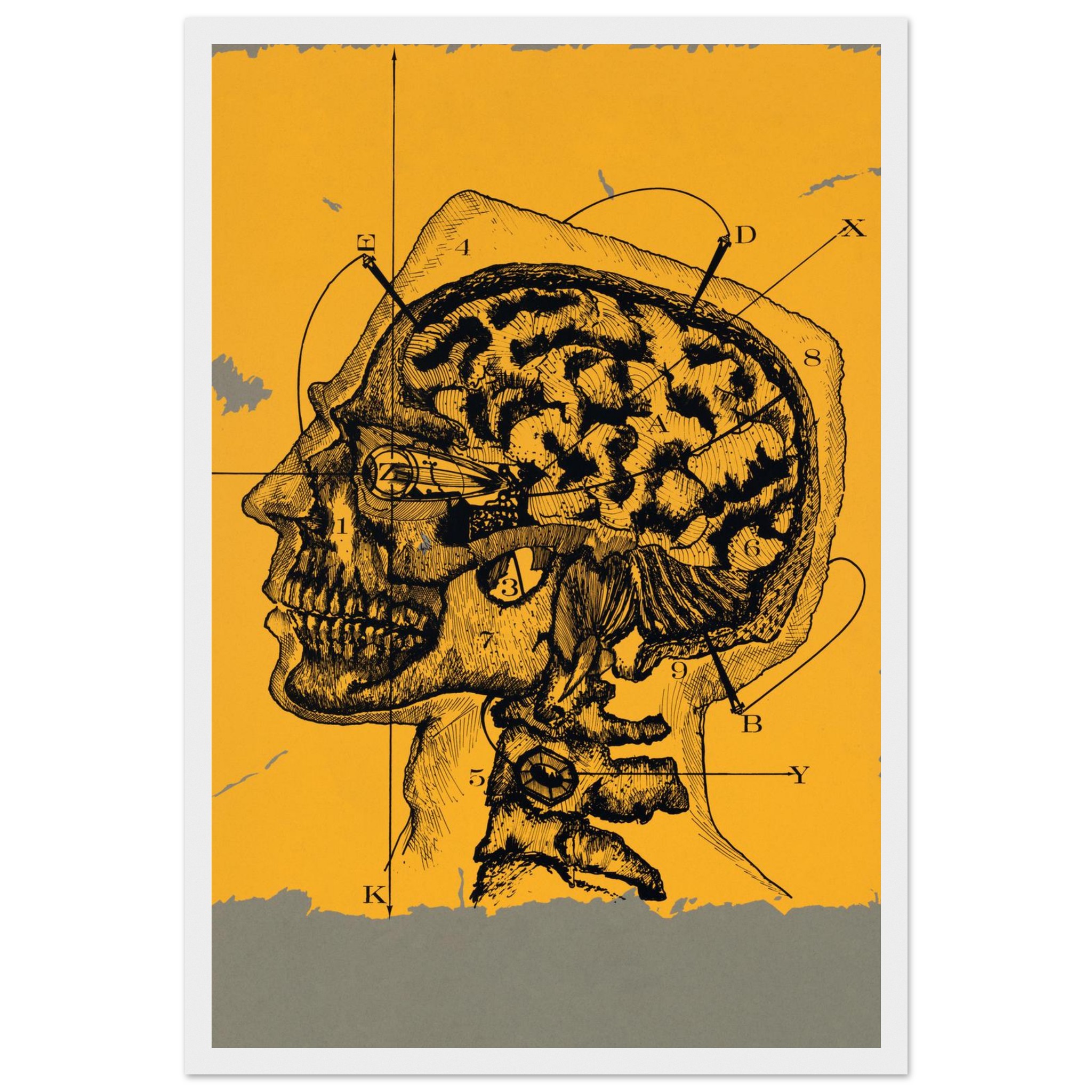 Delve into the intricate beauty of the mind with our “Mind Mapping” framed poster, featuring a striking vintage anatomical illustration of the human brain and skull. Set against a warm, sun-kissed yellow backdrop with a textured gray border, this piece brings a touch of classic scientific intrigue and intellectual curiosity to any space. Perfect for the discerning art lover or anyone fascinated by the complexities of thought, this poster transforms your wall into a gallery of profound human insight.
