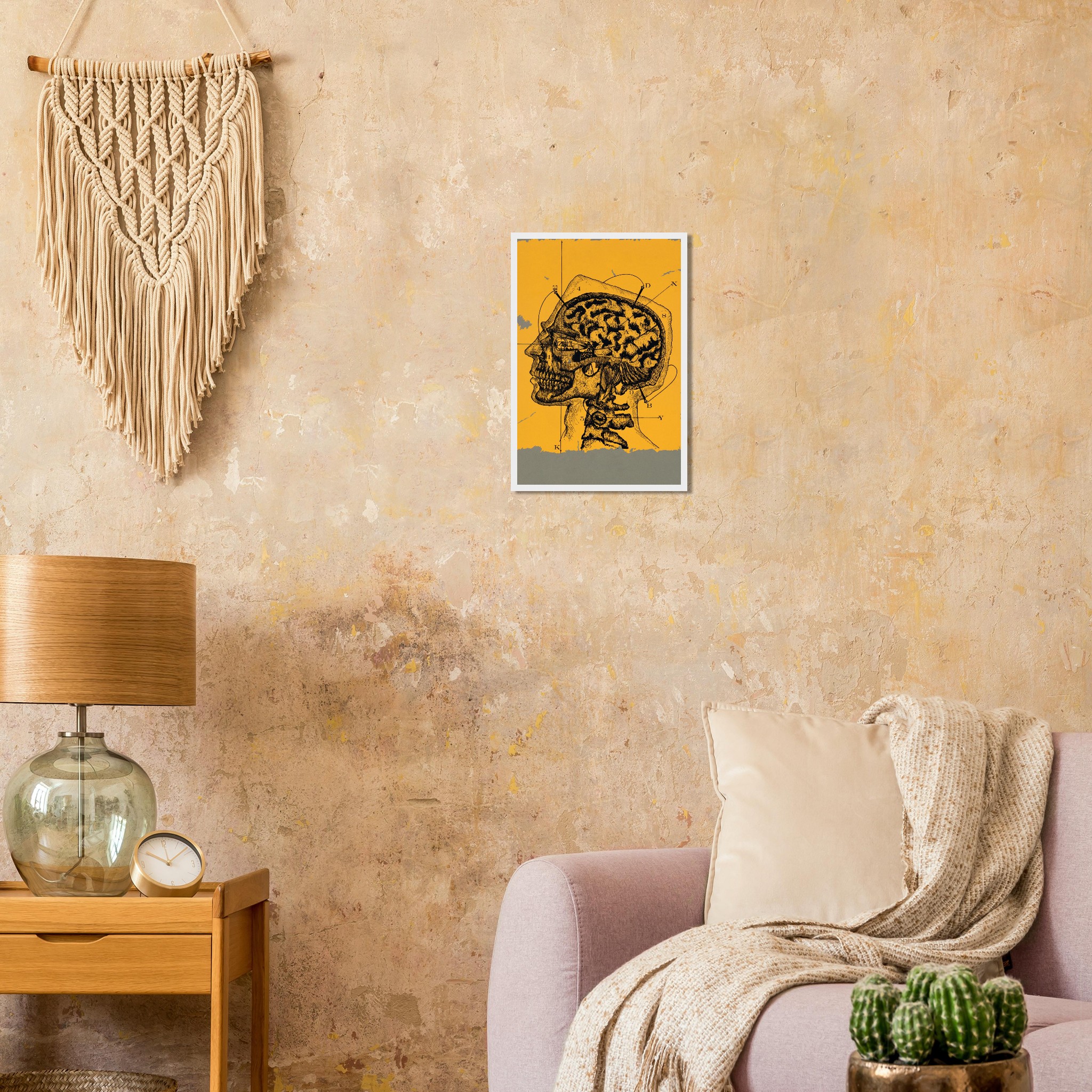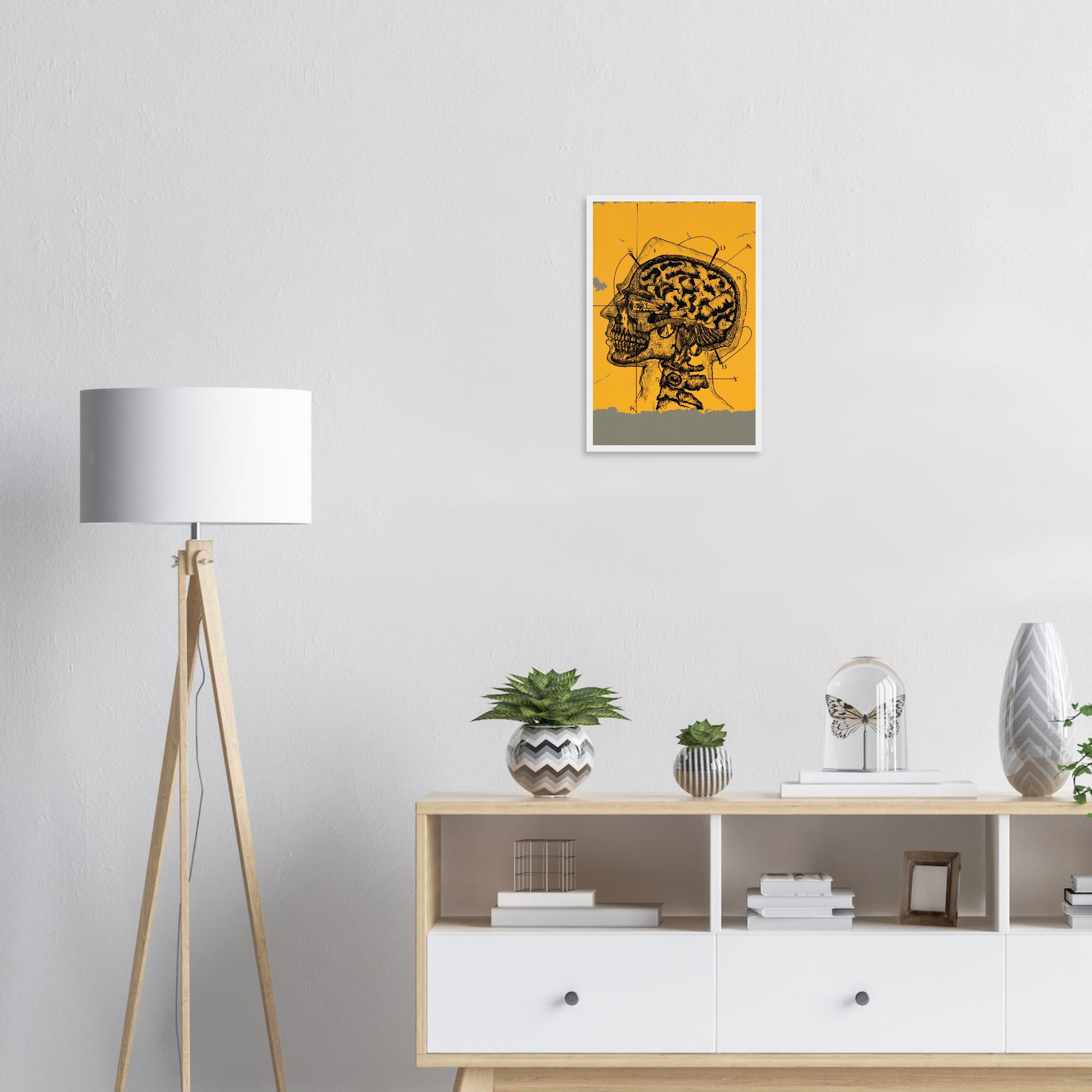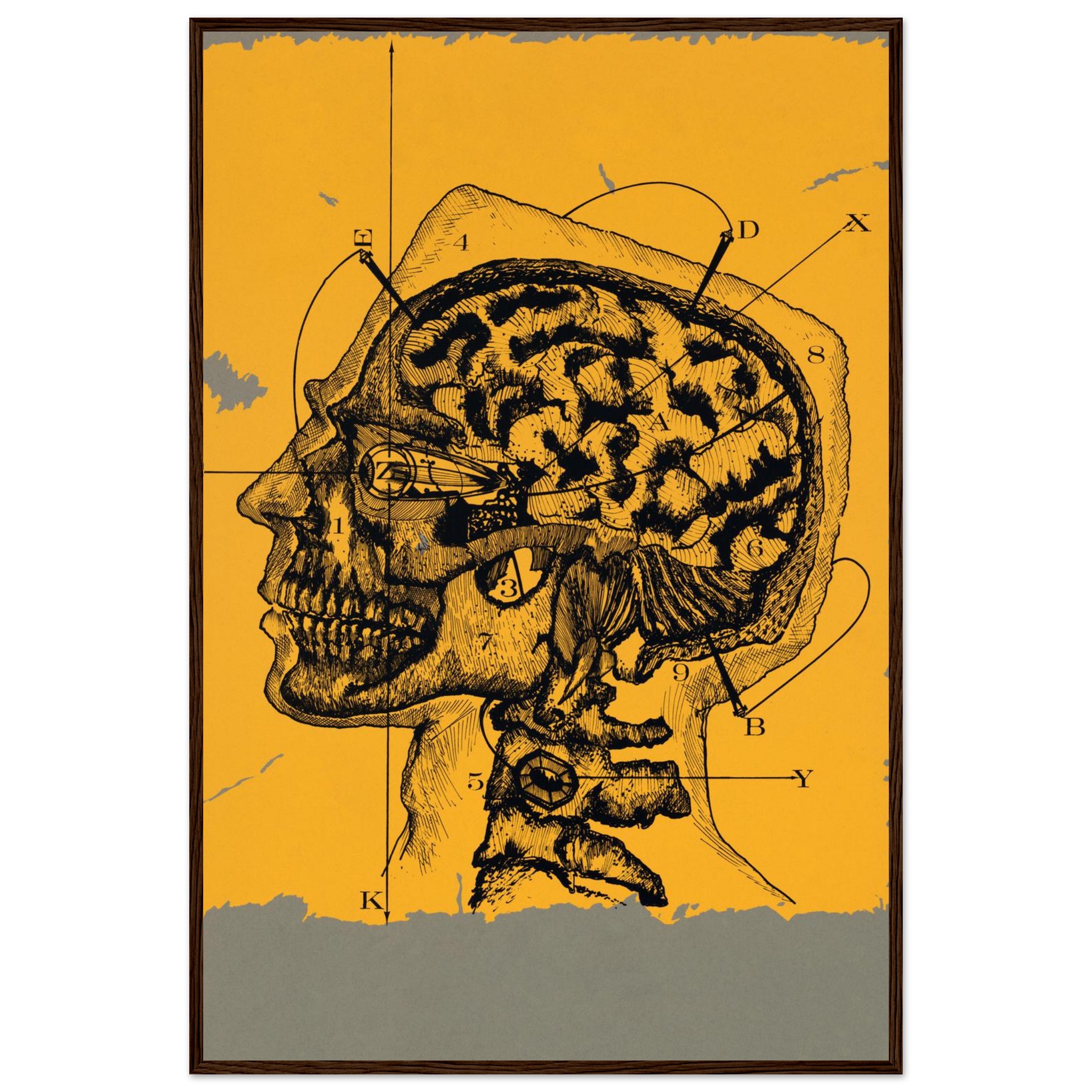 Delve into the intricate beauty of the mind with our “Mind Mapping” framed poster, featuring a striking vintage anatomical illustration of the human brain and skull. Set against a warm, sun-kissed yellow backdrop with a textured gray border, this piece brings a touch of classic scientific intrigue and intellectual curiosity to any space. Perfect for the discerning art lover or anyone fascinated by the complexities of thought, this poster transforms your wall into a gallery of profound human insight.