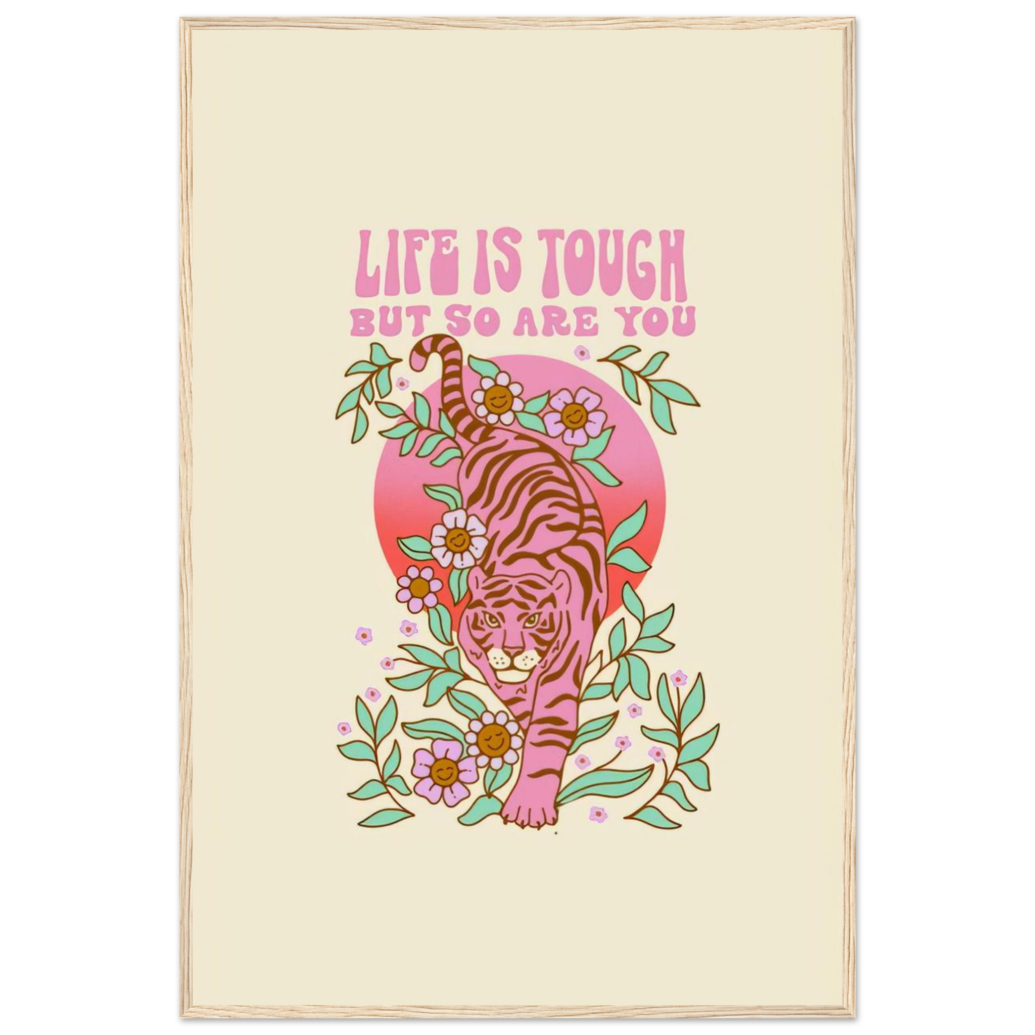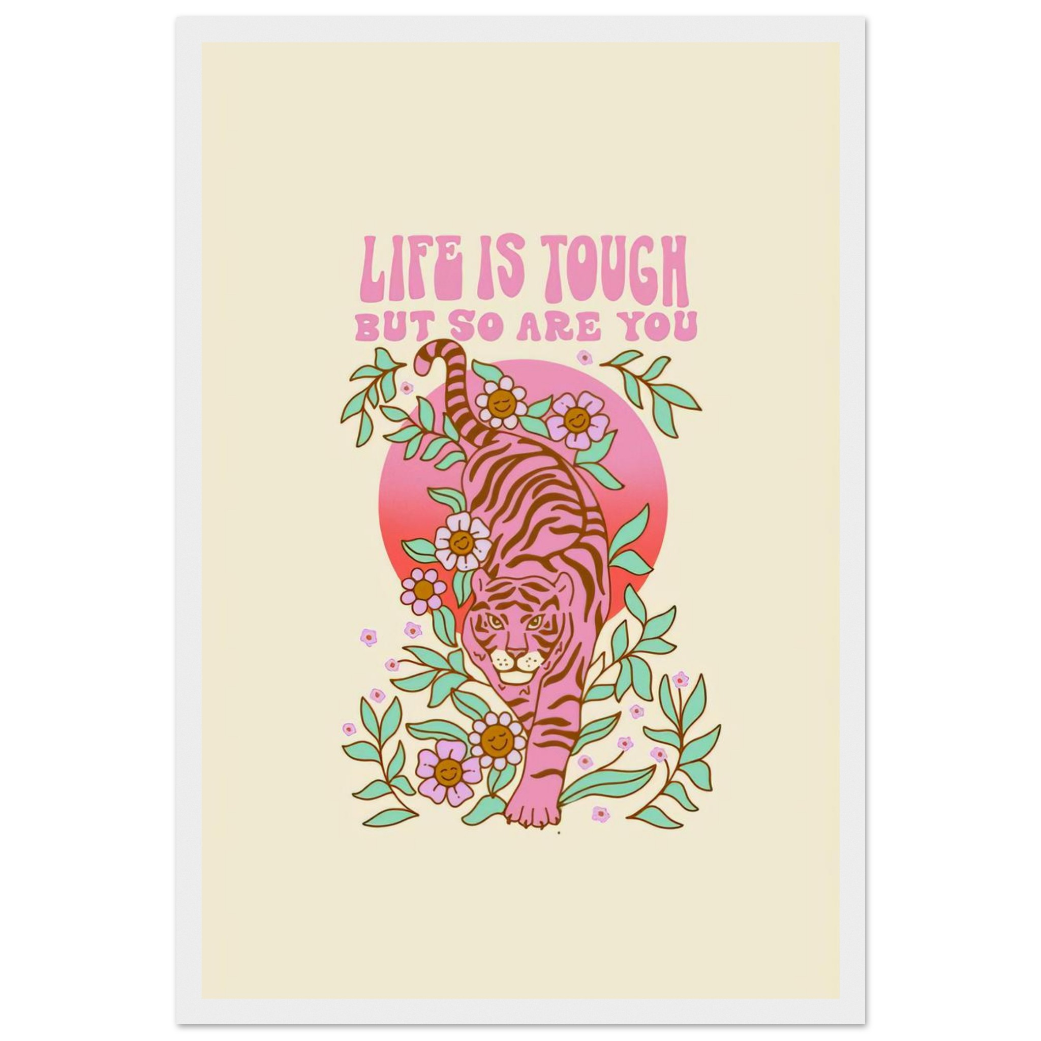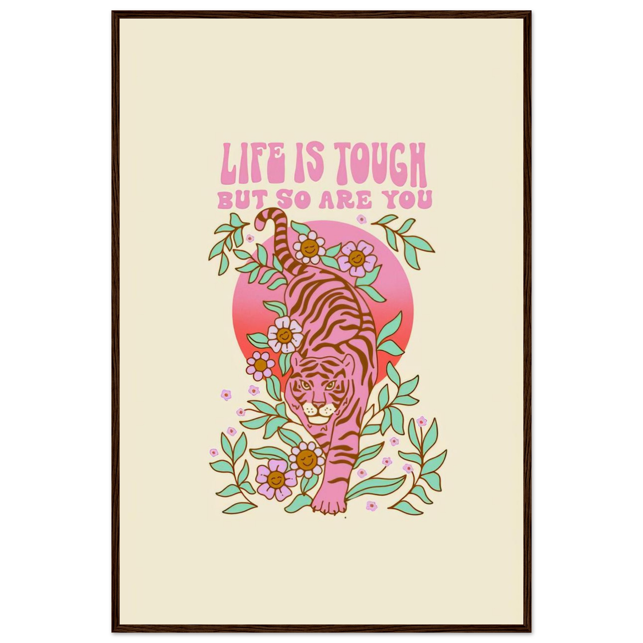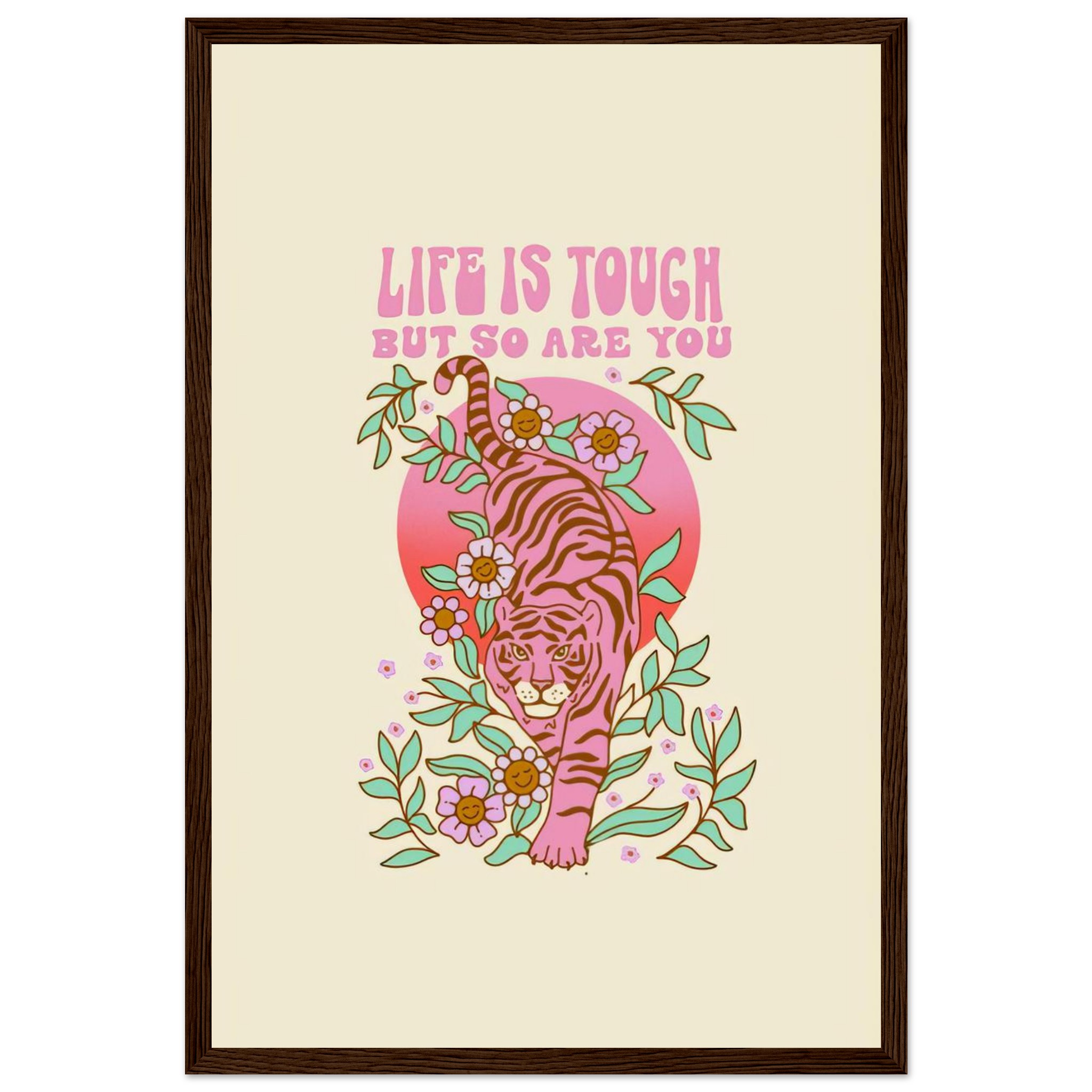 Embrace your inner strength with this vibrant, retro-inspired framed poster featuring a captivating pink tiger surrounded by cheerful floral accents. The empowering message, “LIFE IS TOUGH BUT SO ARE YOU,” is rendered in a playful, wavy font, making it a perfect daily reminder of your resilience. This art print, with its warm beige background and pops of pink and mint, brings a touch of groovy charm and positive vibes to any space.