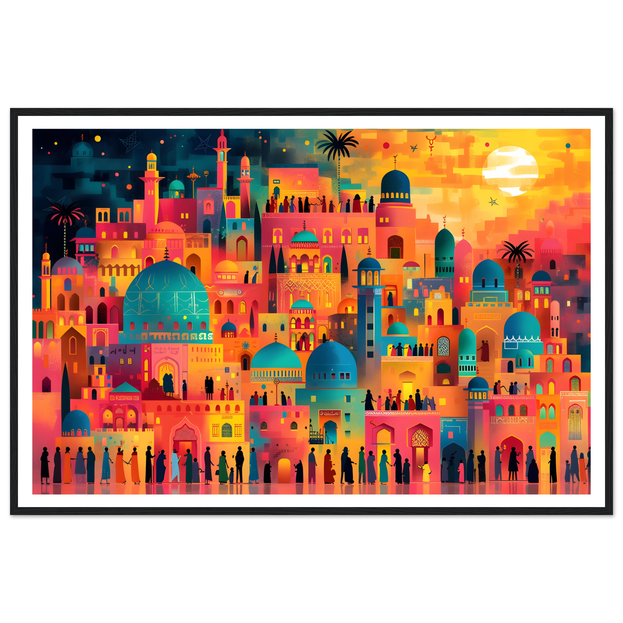 Immerse yourself in the enchanting allure of a bustling Arabian city at twilight with this stunning framed poster. Its vibrant color palette, rich with warm oranges, deep pinks, and serene blues, captures the lively spirit and intricate beauty of an ancient marketplace under a magical sky. This artwork is perfect for adding a touch of exotic charm and visual richness to any room, inviting a sense of wonder and adventure into your home.