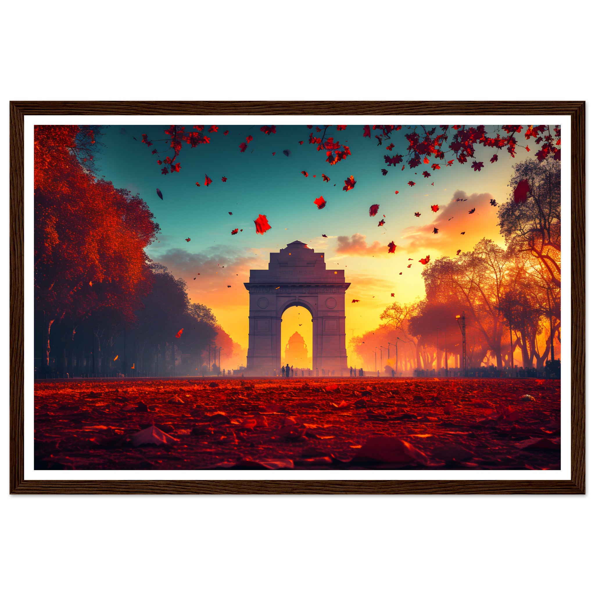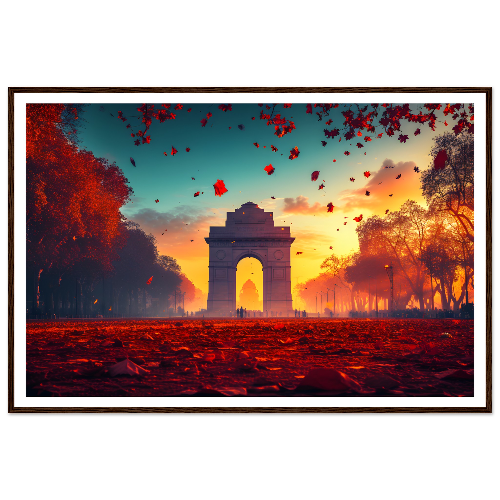 Capture the breathtaking allure of an autumn sunset with our stunning framed poster, featuring a majestic gateway bathed in fiery reds and glowing oranges against a serene teal sky. This artwork evokes a sense of grandeur and vibrant tranquility, perfect for bringing a warm, inviting glow to any space. Imagine the rich, falling leaves and the golden hour light transforming your living room or office into a daily escape.