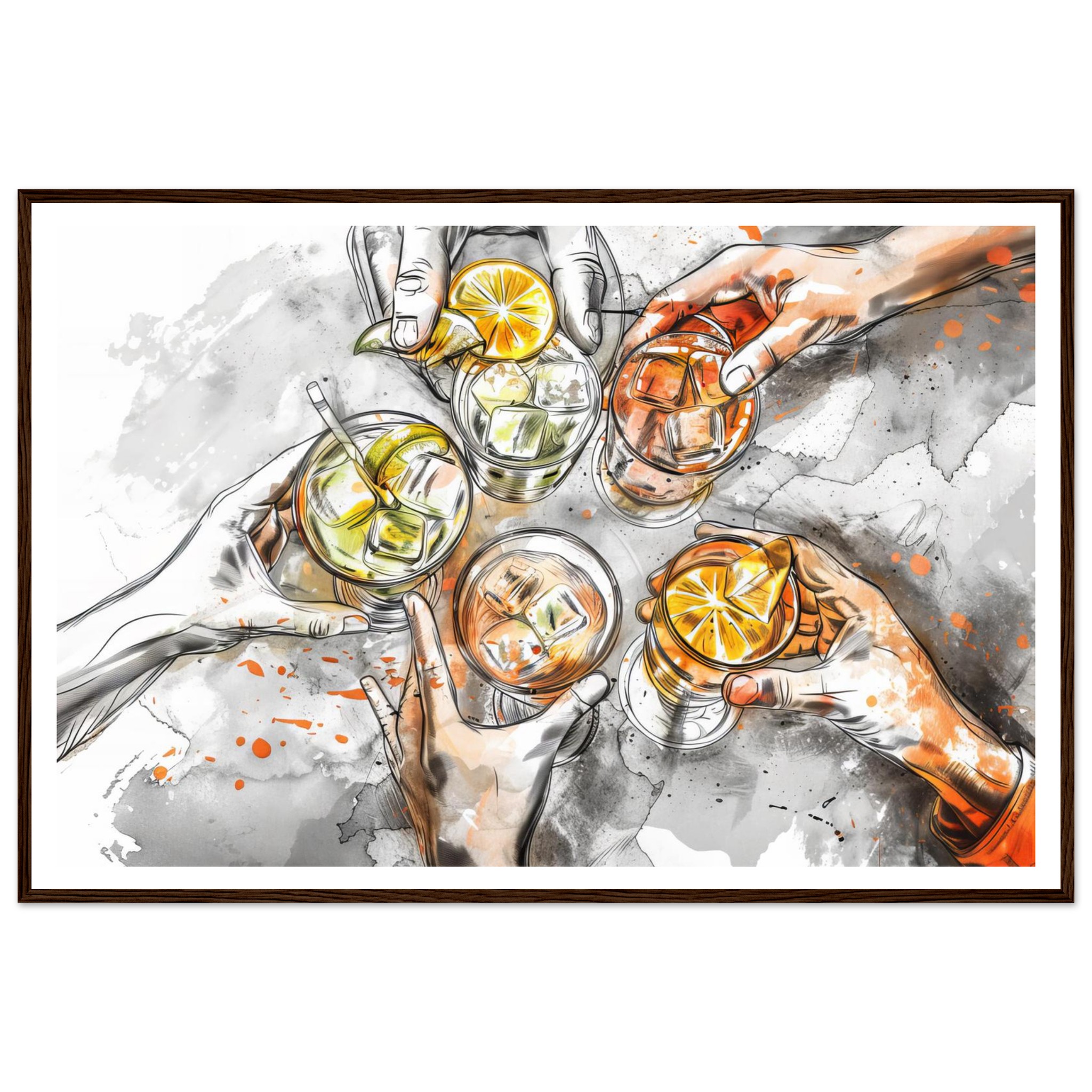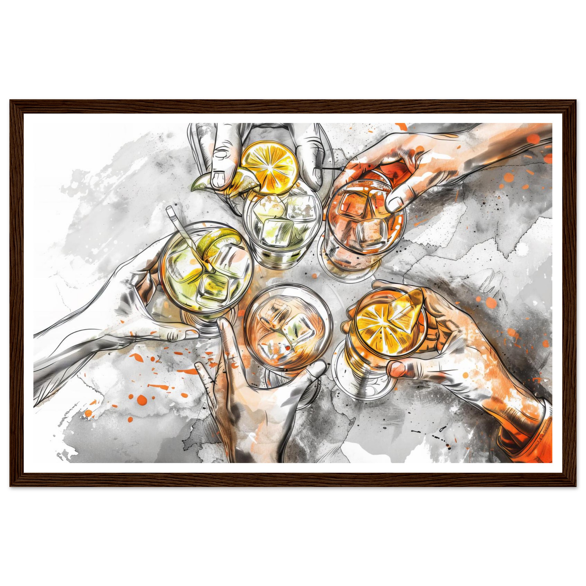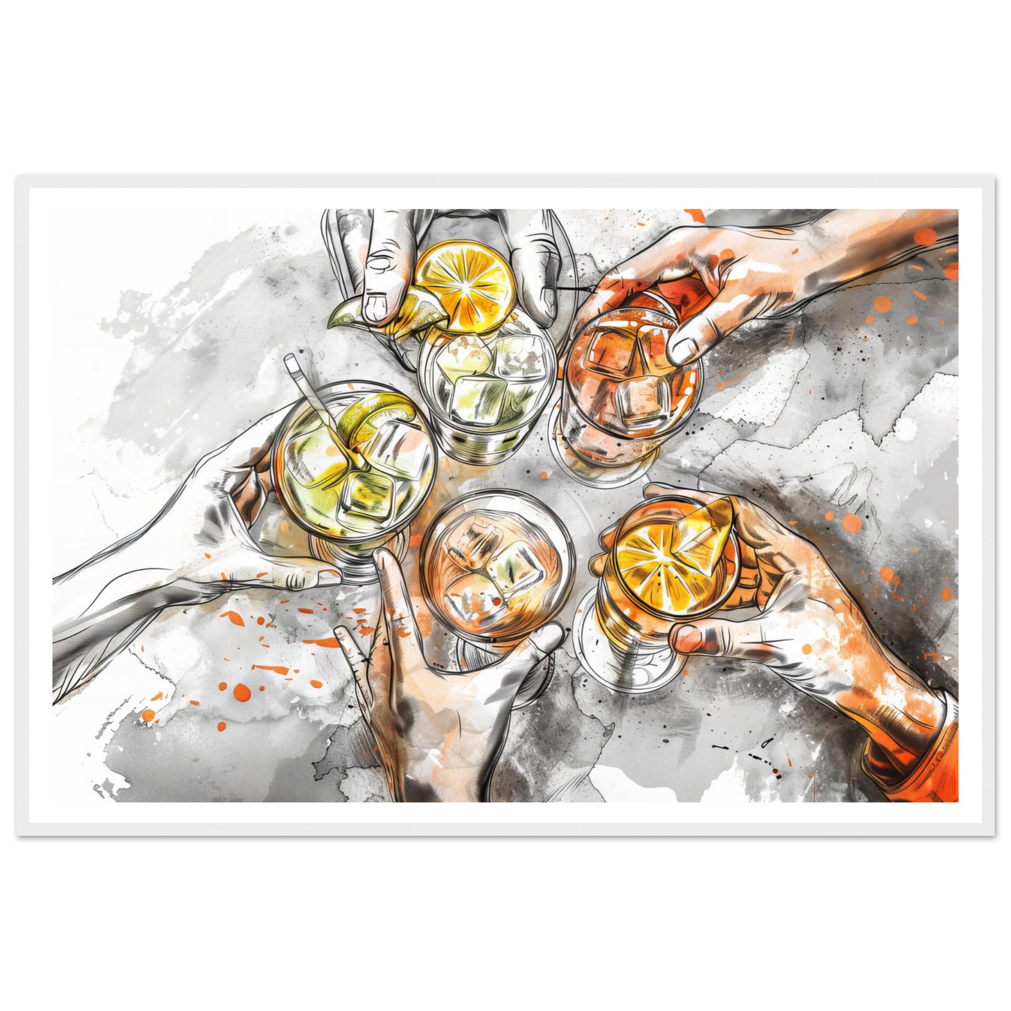 Raise a glass to friendship and good times with this vibrant cocktail party art print! Capturing the joyous clink of glasses and the zesty splash of citrus, this framed poster brings a burst of celebratory energy to any room. Its dynamic artistry with lively orange accents against a sophisticated monochrome background is perfect for adding a touch of modern elegance and a conversation starter to your living space, kitchen, or bar area.