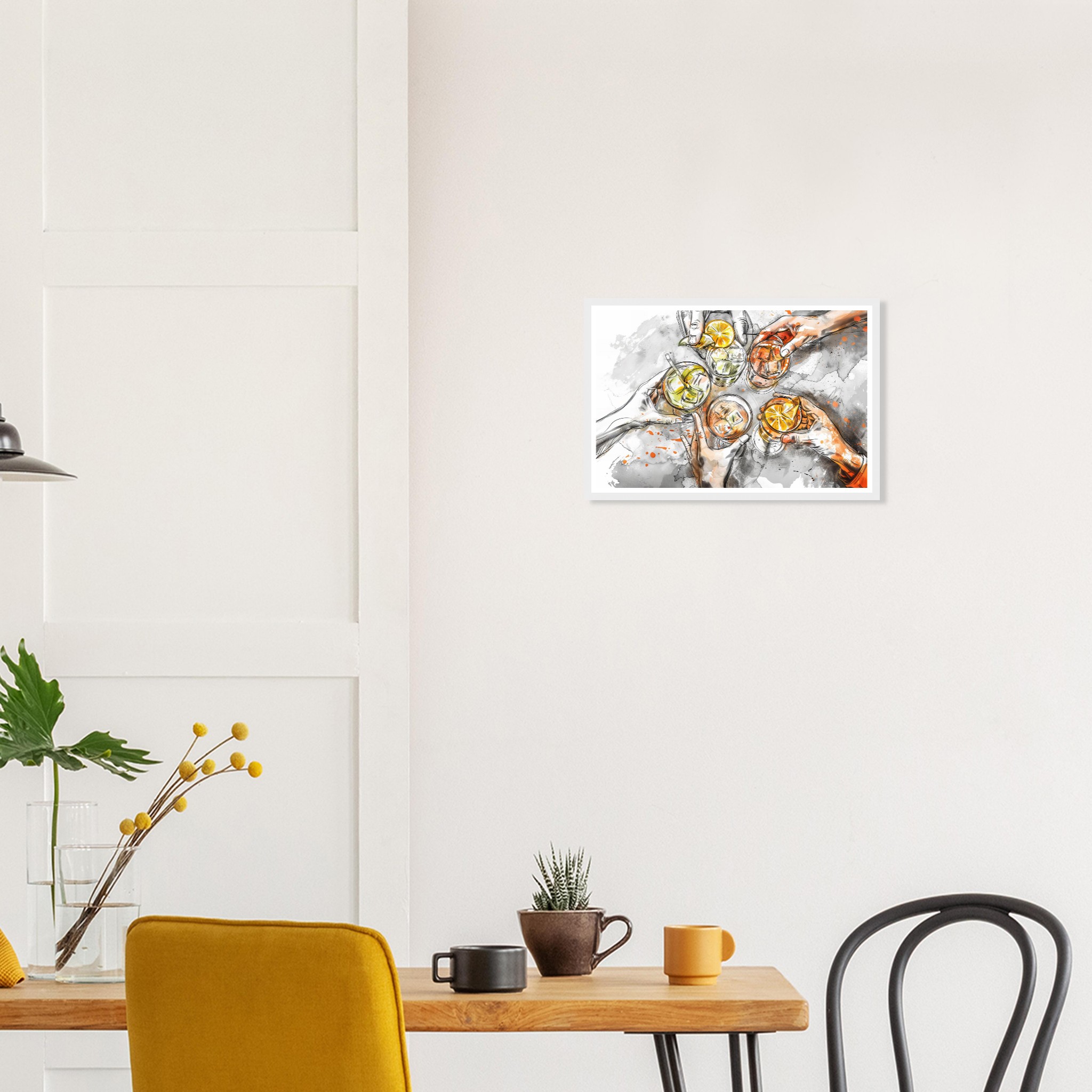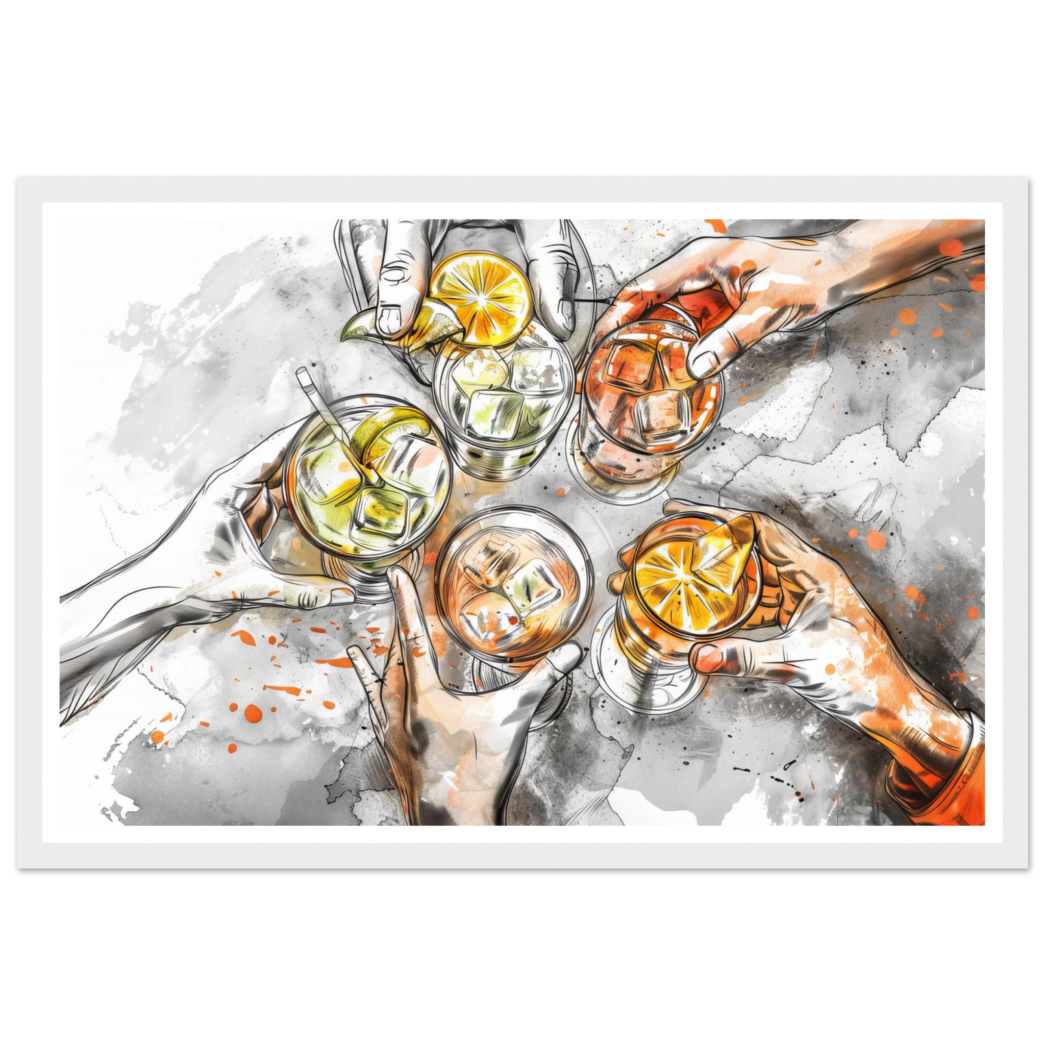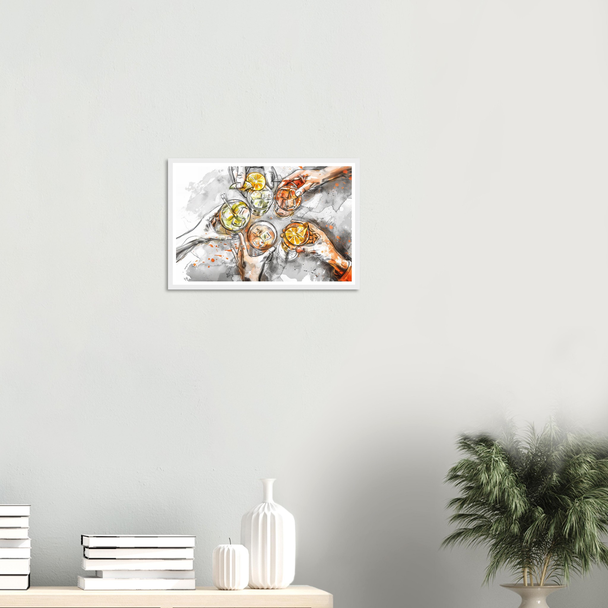 Raise a glass to friendship and good times with this vibrant cocktail party art print! Capturing the joyous clink of glasses and the zesty splash of citrus, this framed poster brings a burst of celebratory energy to any room. Its dynamic artistry with lively orange accents against a sophisticated monochrome background is perfect for adding a touch of modern elegance and a conversation starter to your living space, kitchen, or bar area.