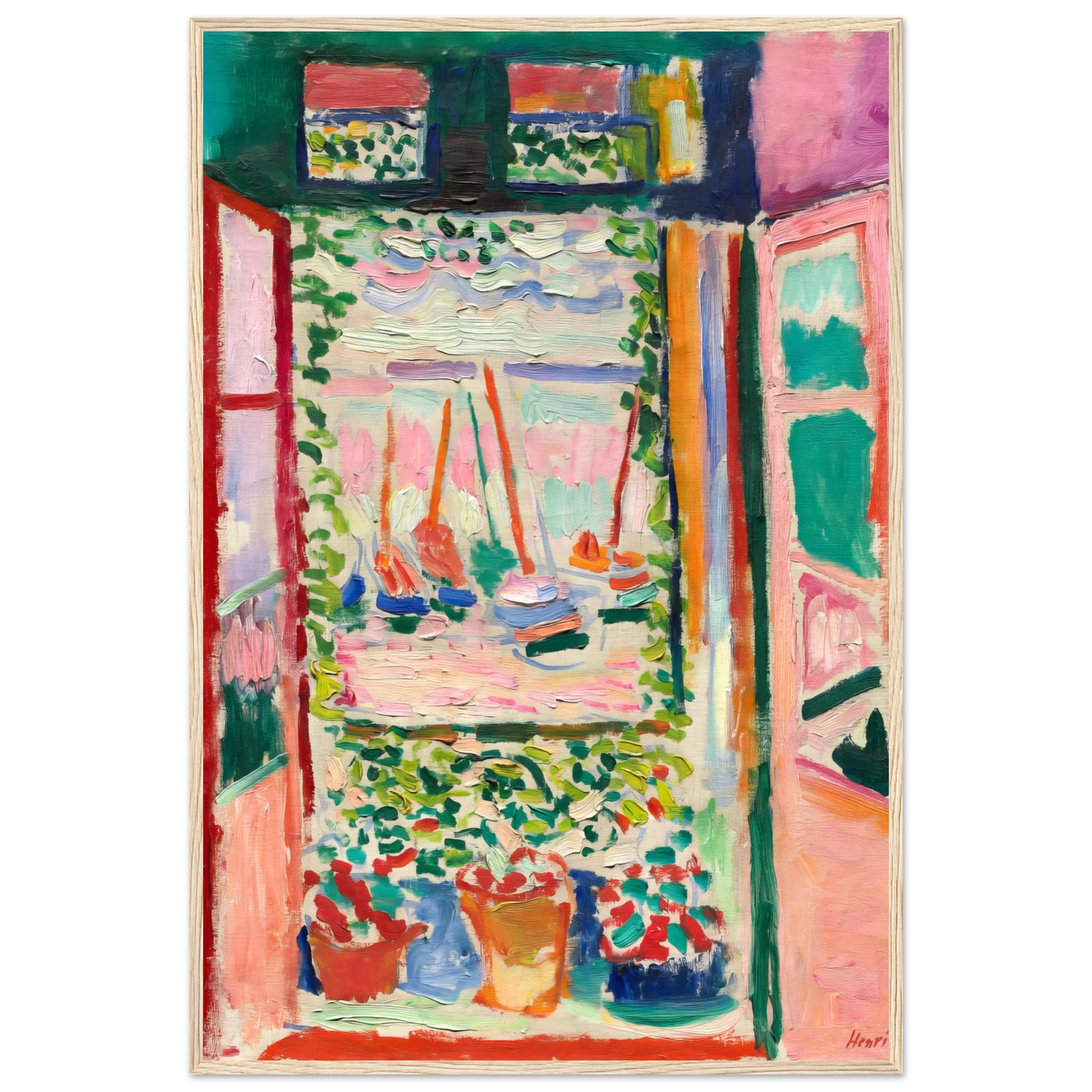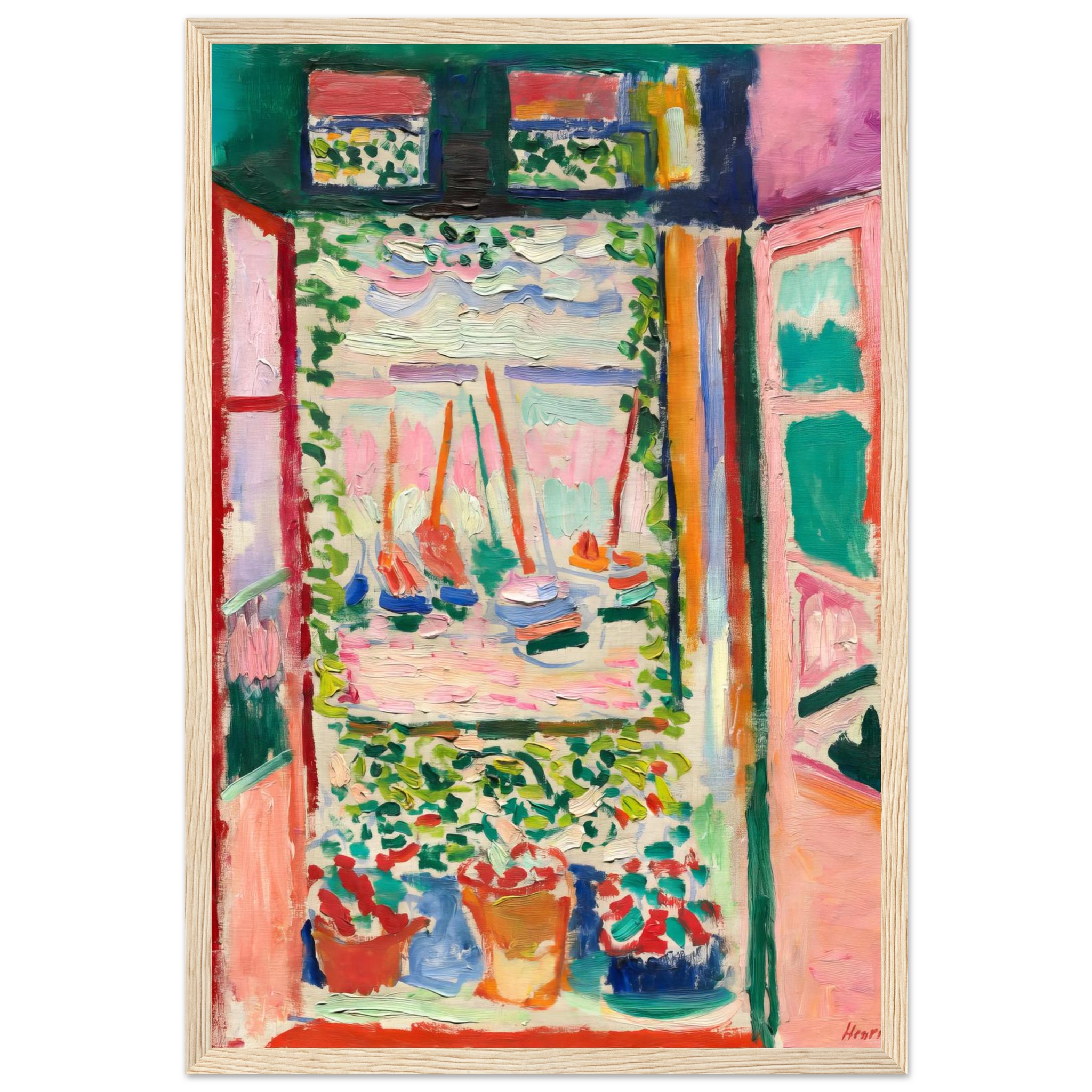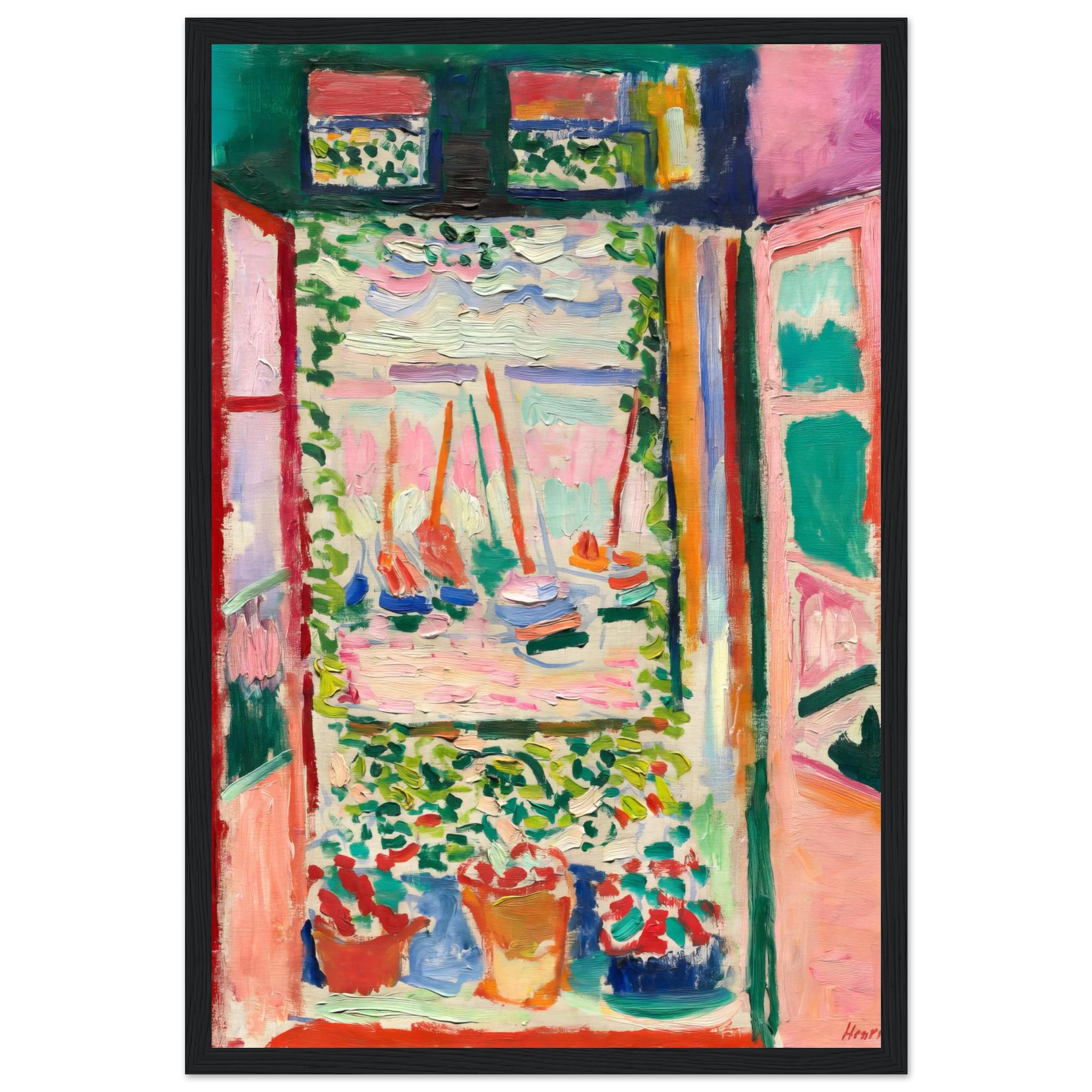 Immerse yourself in the joyful abandon of Fauvist color with our stunning framed poster, capturing the essence of a serene seascape through a sunlit window. The lively brushstrokes and bold palette of pinks, greens, and reds instantly transform any space into a vibrant art sanctuary, bringing a touch of expressive beauty to your home or office.