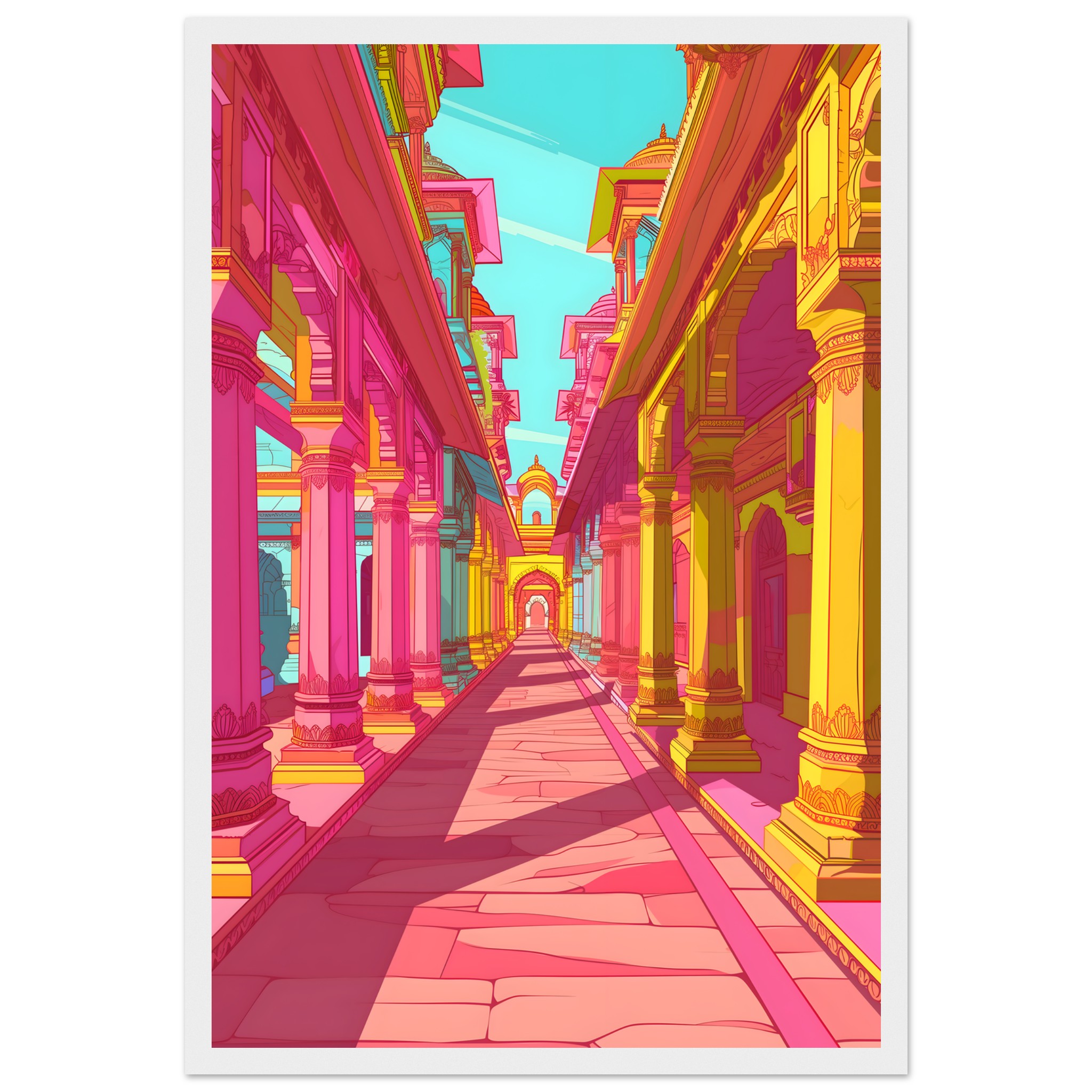 Step into a world of vibrant color and architectural wonder with our framed poster, capturing a mesmerizing palace alleyway bathed in brilliant neon hues. This stunning artwork brings a dynamic and fantastical element to any space, perfect for those who appreciate unique art with a bold personality.