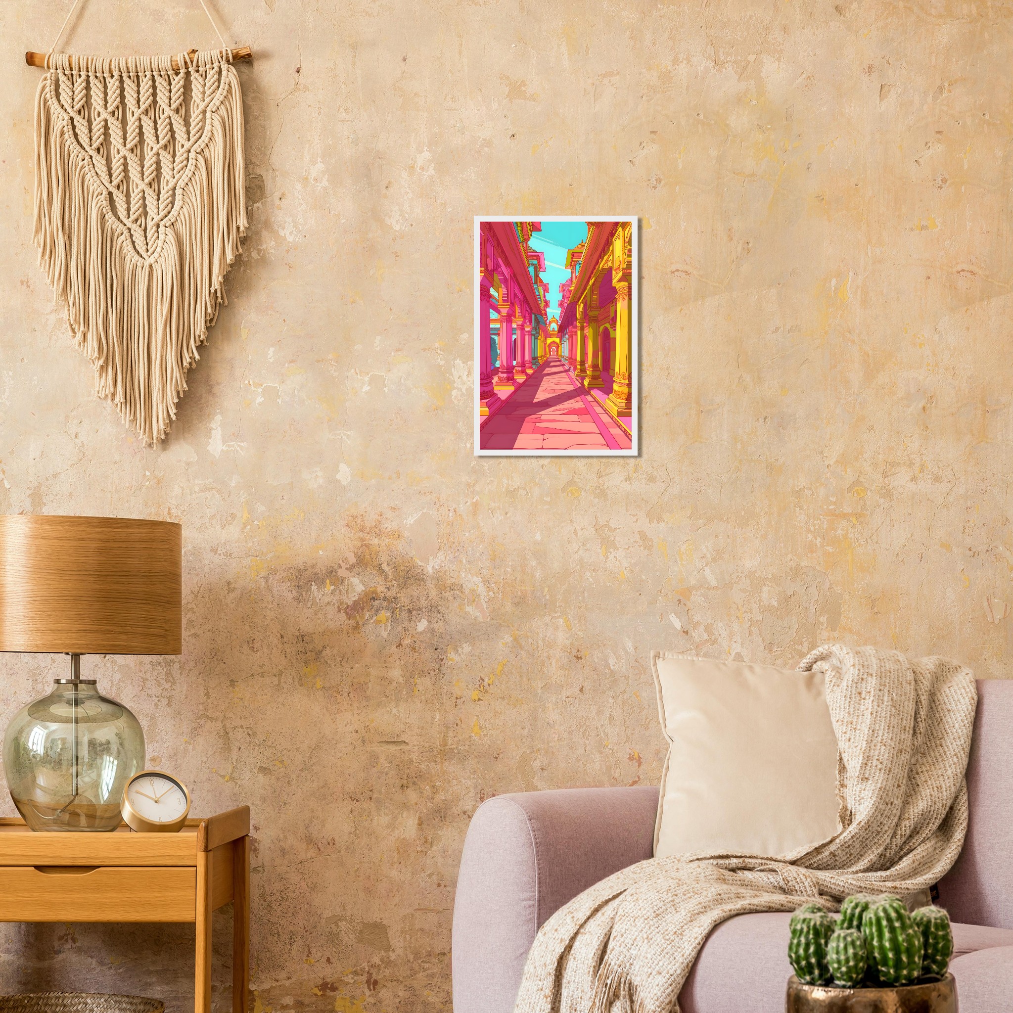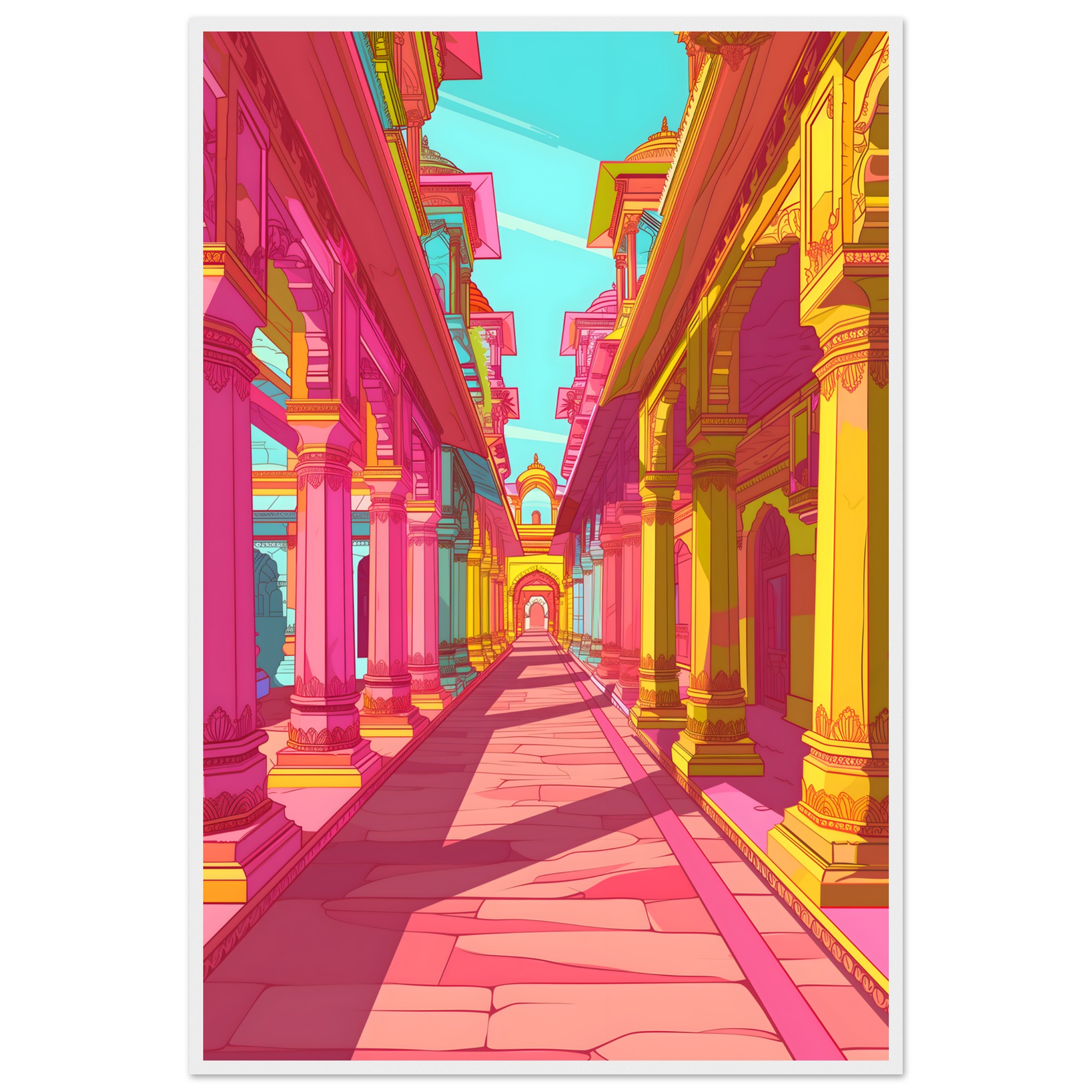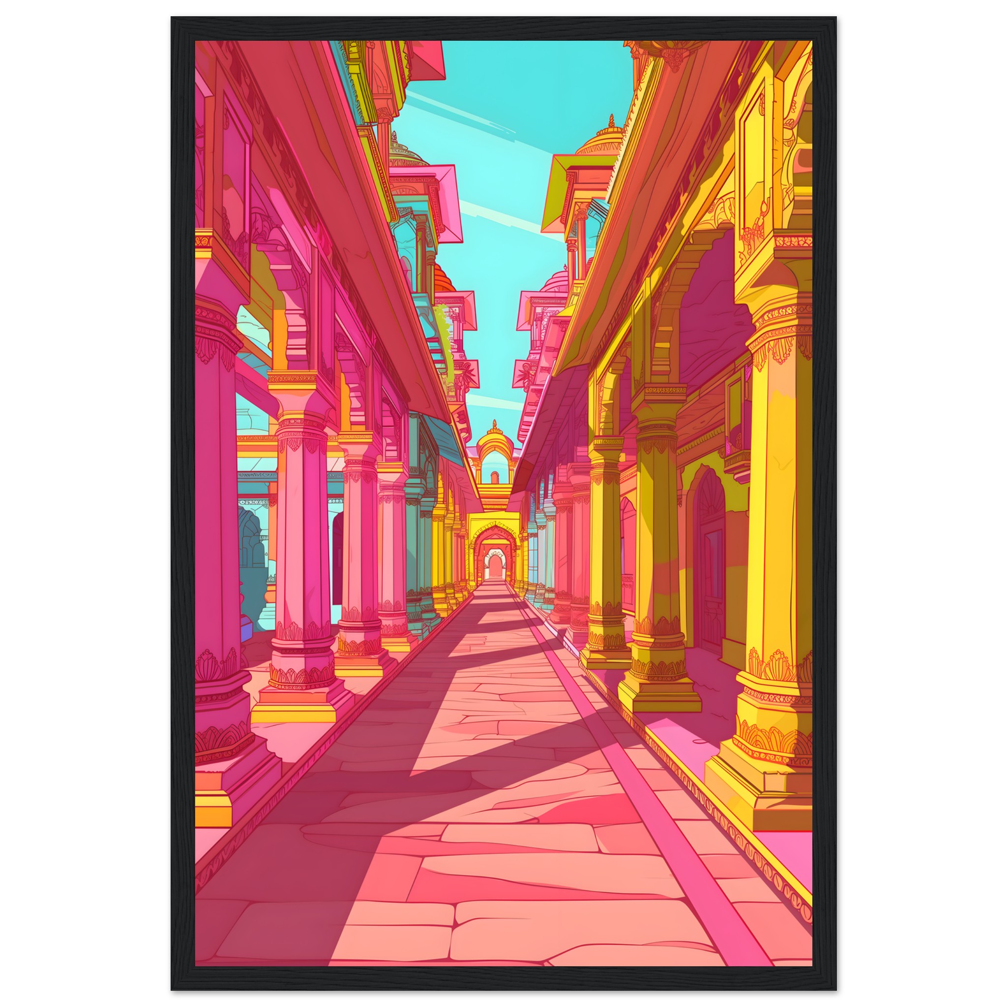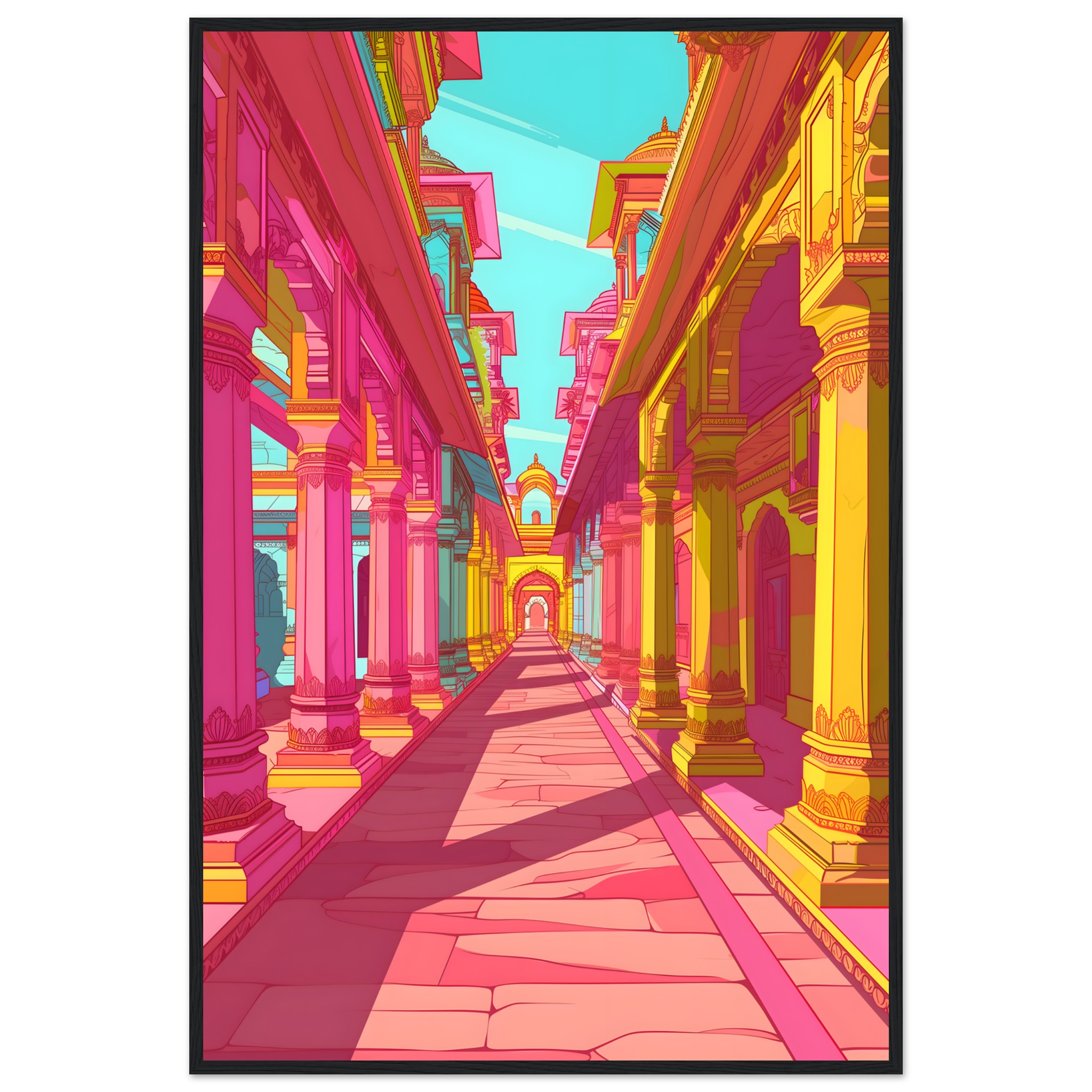 Step into a world of vibrant color and architectural wonder with our framed poster, capturing a mesmerizing palace alleyway bathed in brilliant neon hues. This stunning artwork brings a dynamic and fantastical element to any space, perfect for those who appreciate unique art with a bold personality.