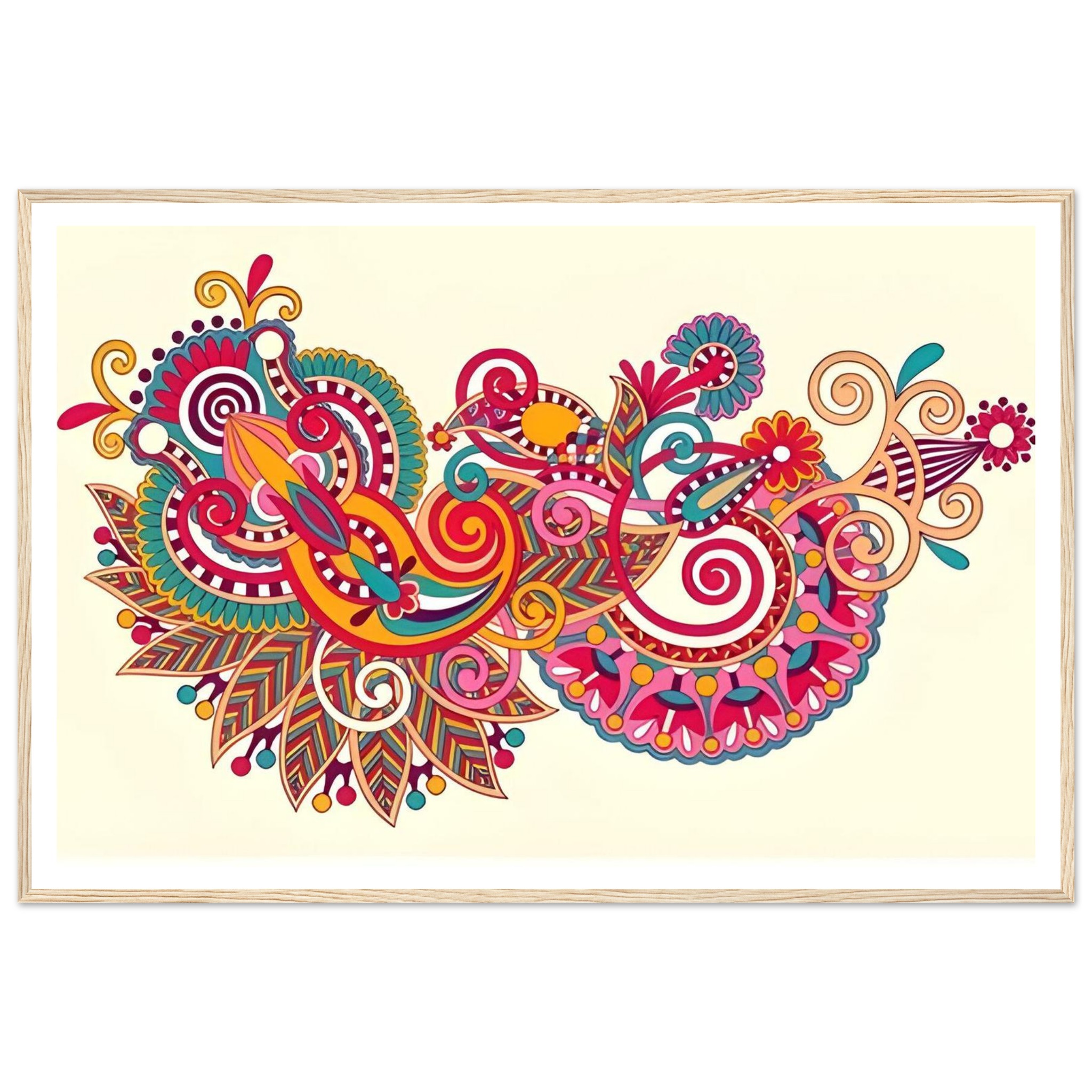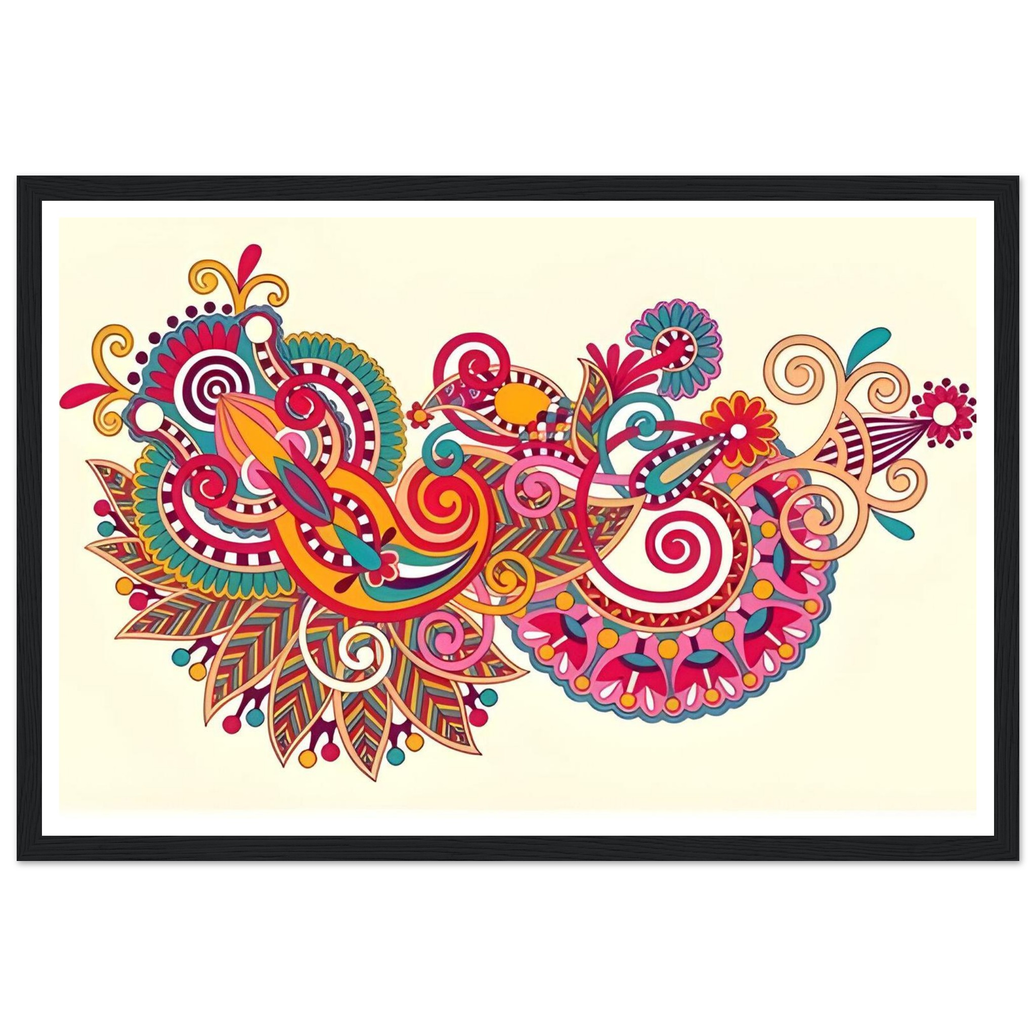 Infuse your living space with a burst of color and bohemian charm. This exquisite framed poster features an intricate paisley design, alive with vibrant hues and flowing floral swirls. It’s a captivating piece that brings joy and artistic flair to any room, transforming your wall into a dynamic focal point.