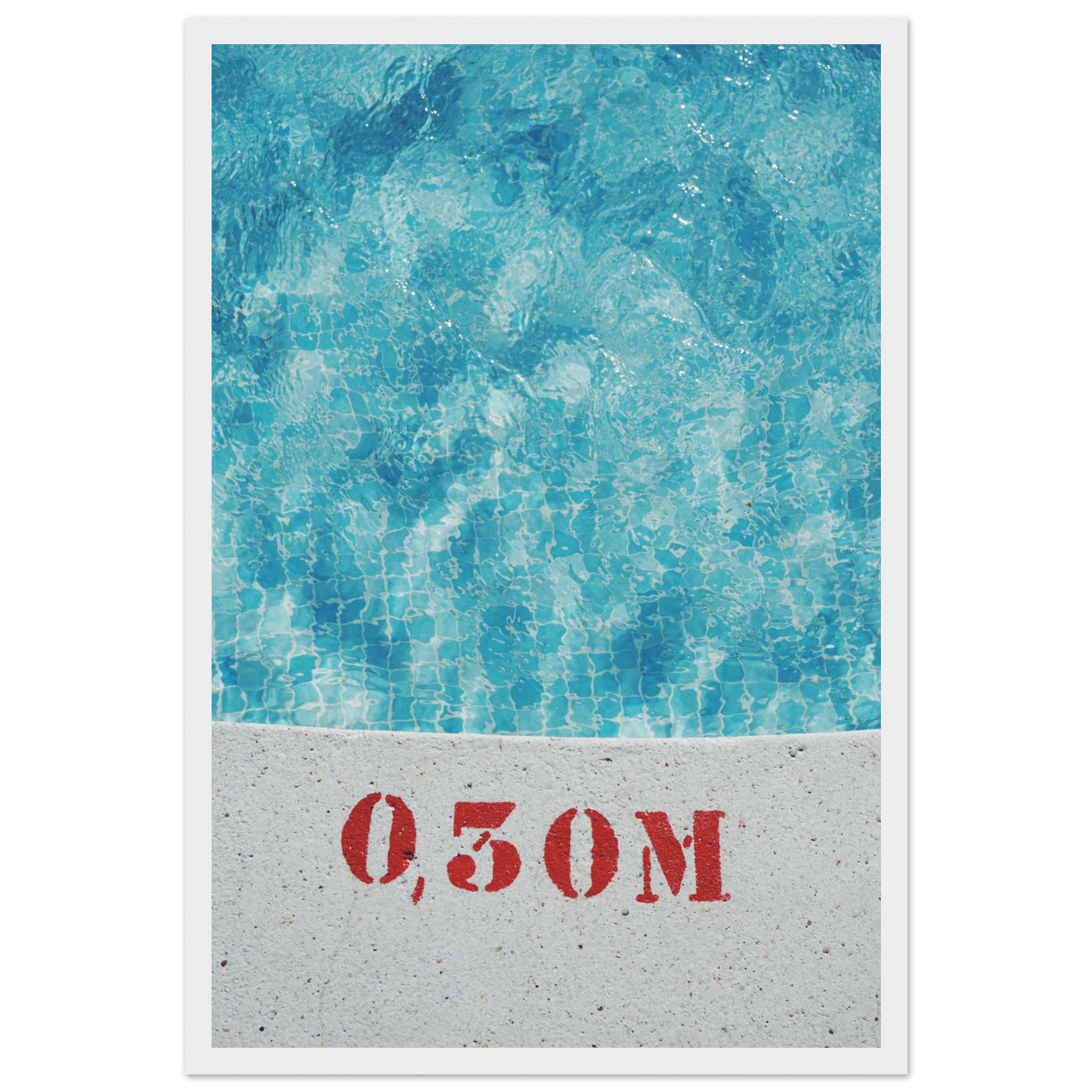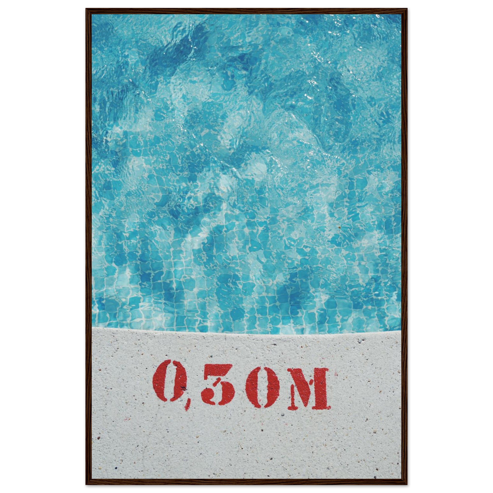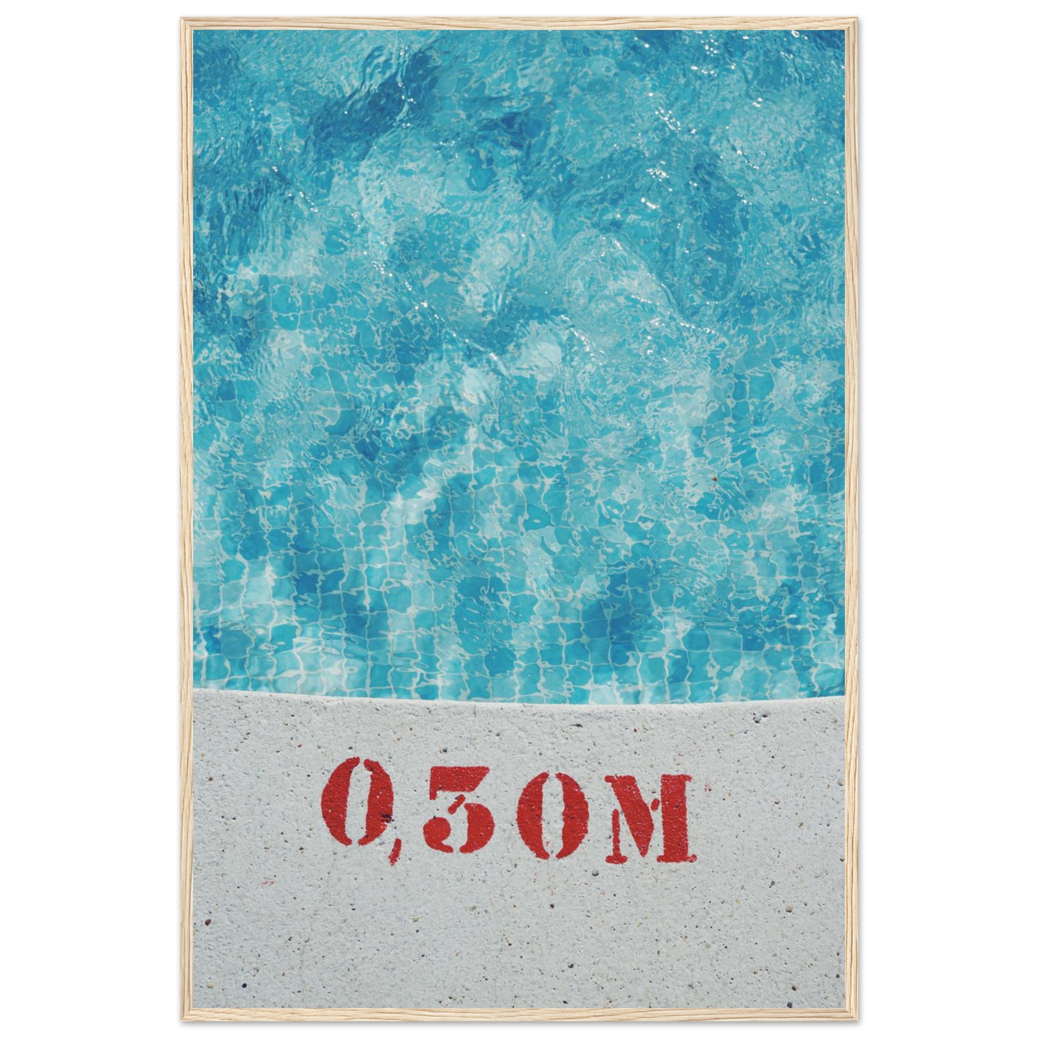 Dive into tranquility with our exclusive framed poster, capturing the serene and inviting essence of a sun-drenched pool. The crisp turquoise water, gently rippling over classic tiles, meets the bold, striking red ‘0,30M’ depth marker on the cool, textured poolside – a perfect blend of refreshing calm and graphic modernism. This piece brings a touch of summery bliss and contemporary design to any space, ideal for those who love clean lines, vibrant colors, and a hint of nostalgic holiday charm.