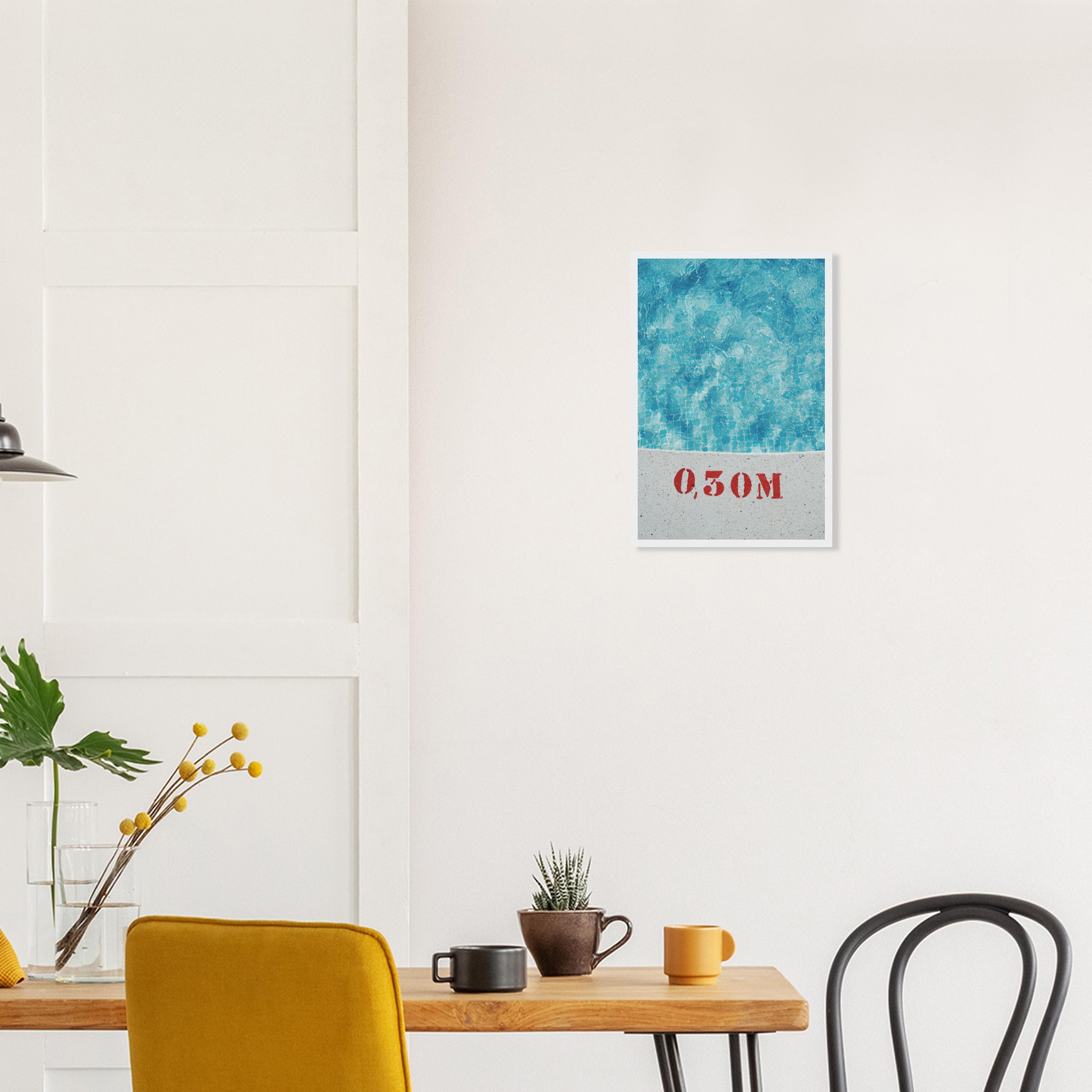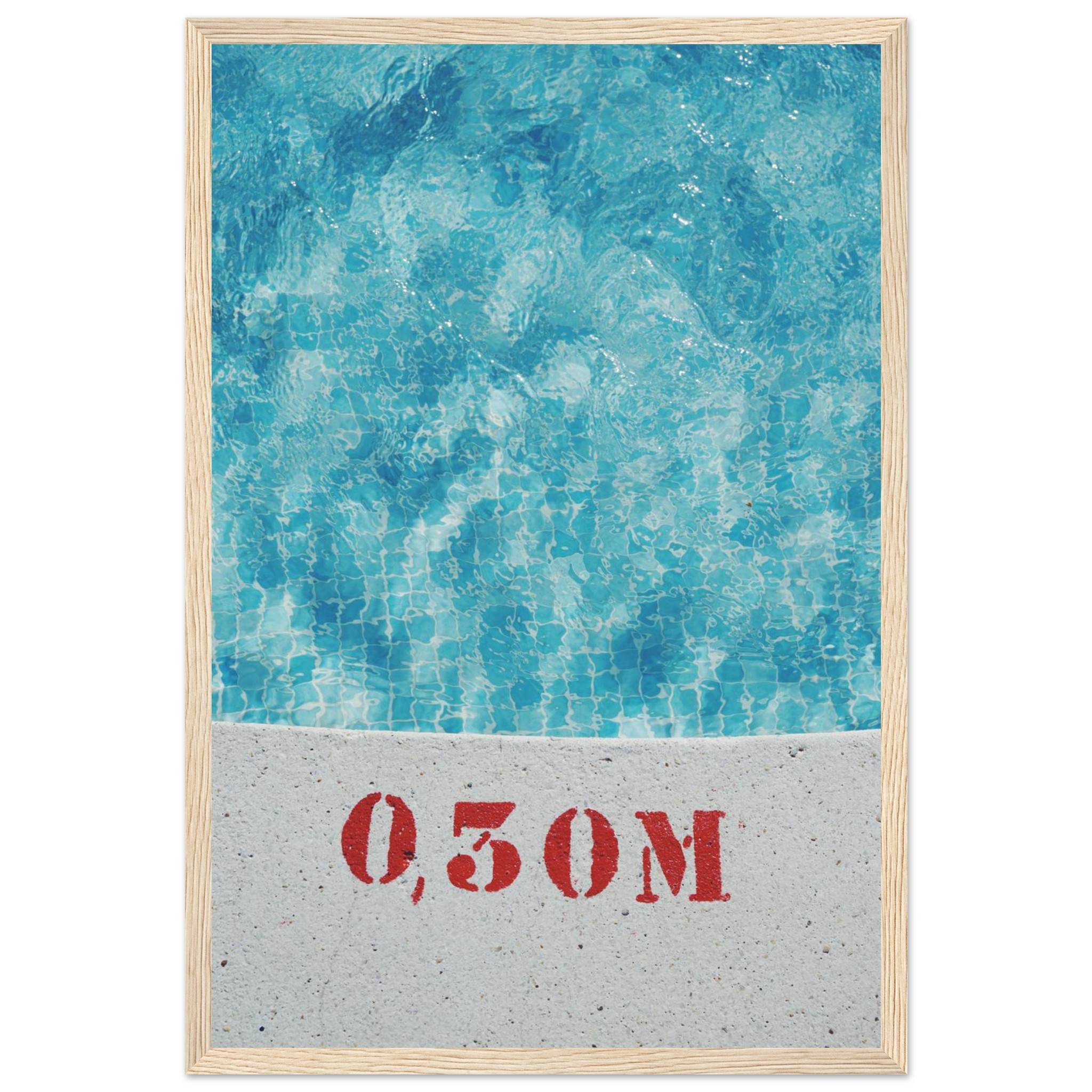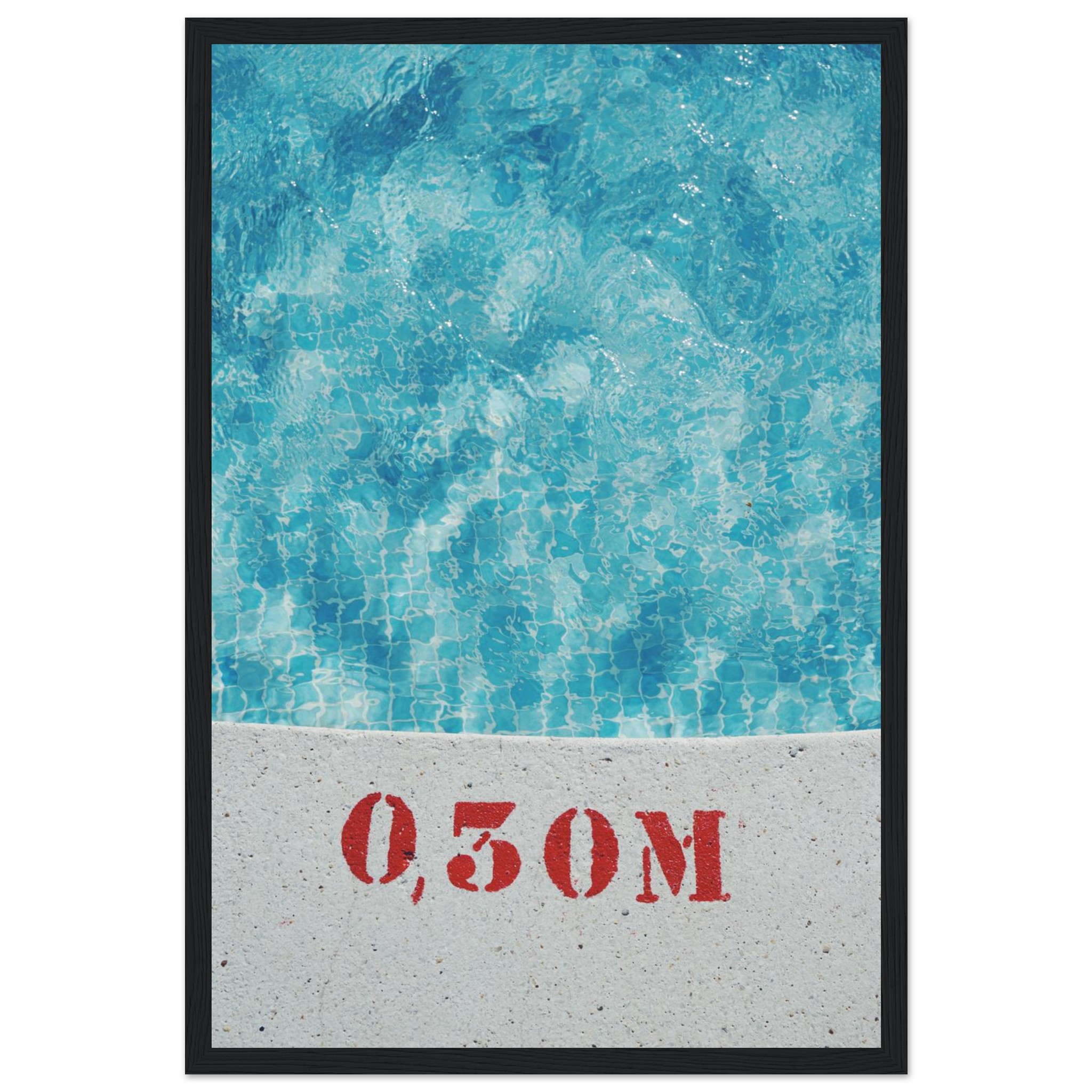 Dive into tranquility with our exclusive framed poster, capturing the serene and inviting essence of a sun-drenched pool. The crisp turquoise water, gently rippling over classic tiles, meets the bold, striking red ‘0,30M’ depth marker on the cool, textured poolside – a perfect blend of refreshing calm and graphic modernism. This piece brings a touch of summery bliss and contemporary design to any space, ideal for those who love clean lines, vibrant colors, and a hint of nostalgic holiday charm.