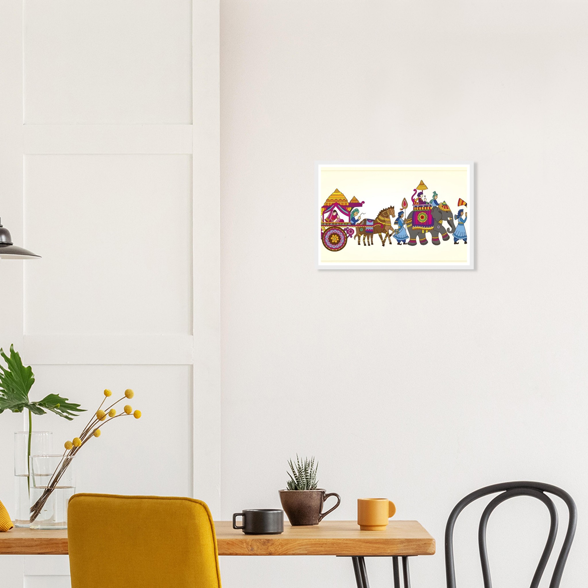 Bring the splendor and color of a majestic Indian procession into your home with this stunning framed poster. Featuring a richly illustrated scene of elephants, horses, and figures adorned in vibrant hues, this artwork captures the spirit of traditional celebrations. It’s the perfect statement piece to infuse any room with cultural elegance and a touch of grand storytelling.