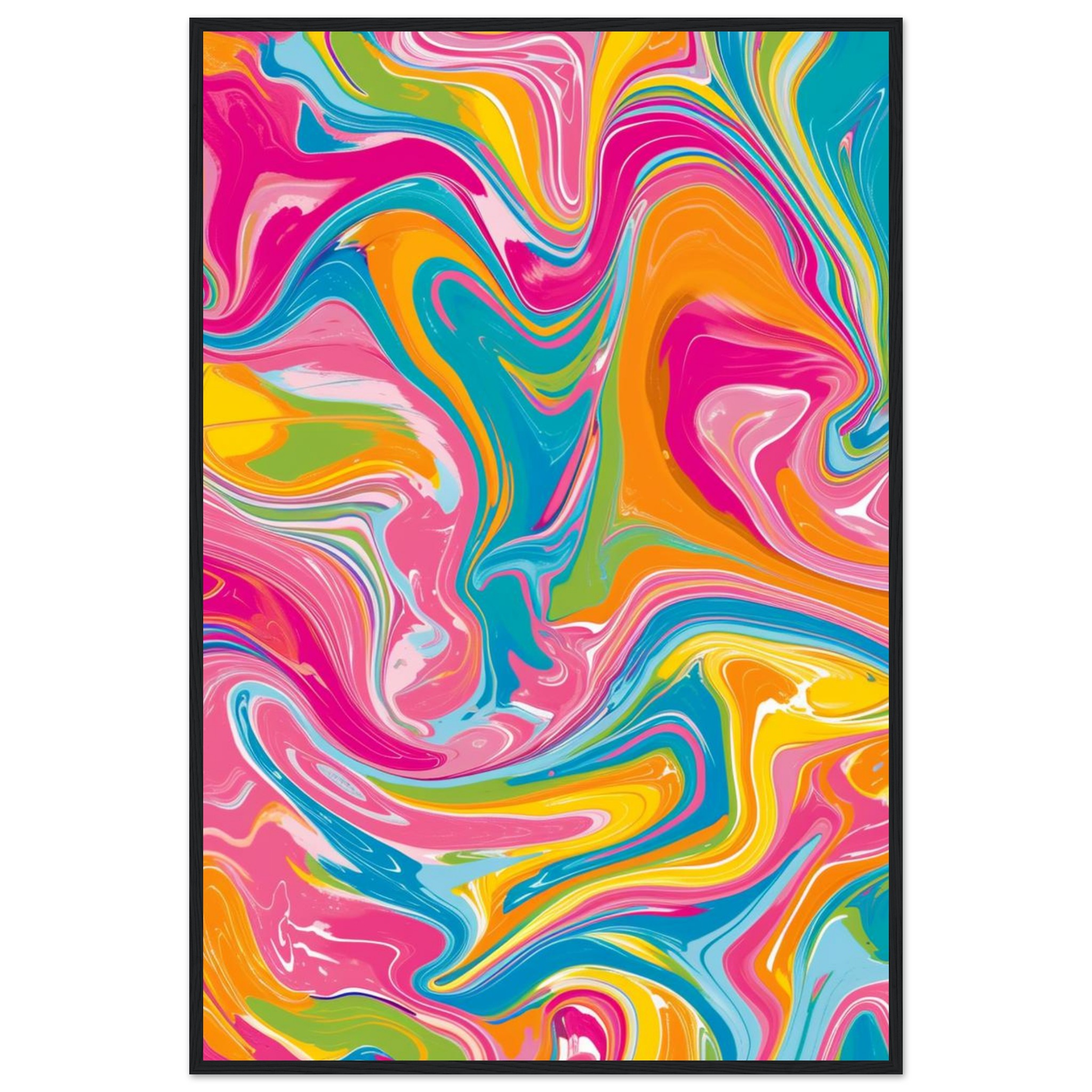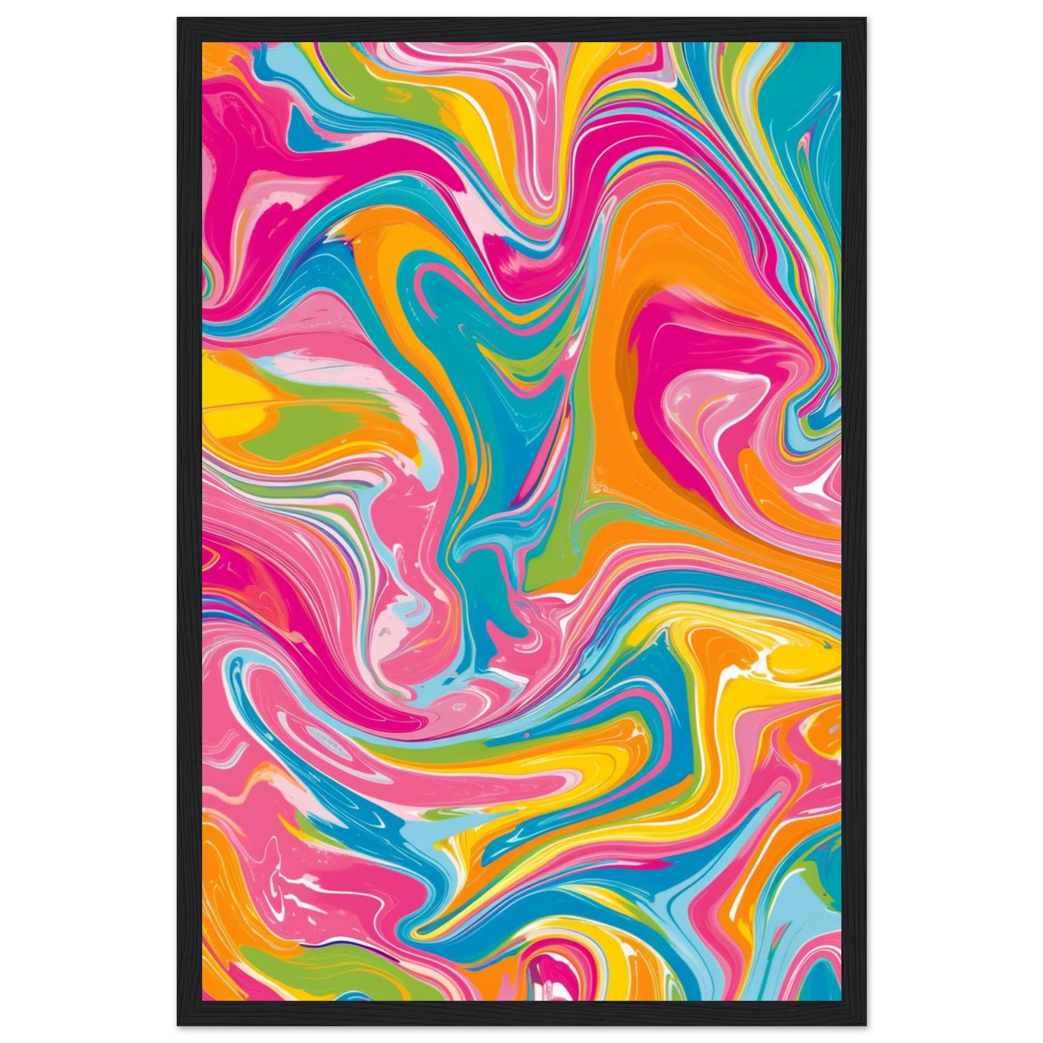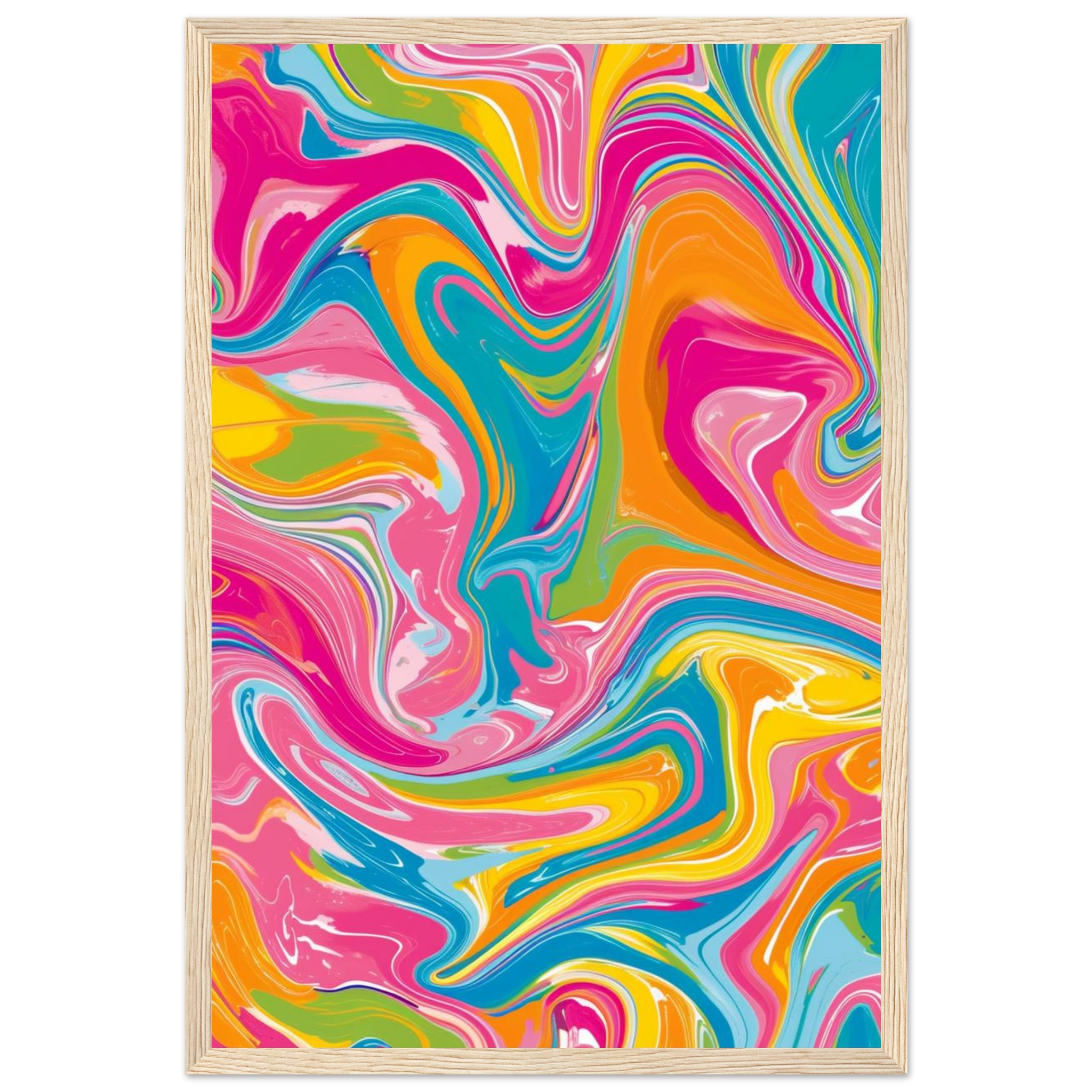Infuse your space with a burst of joyful energy! Our vibrant Swirl Abstract poster features a mesmerizing blend of fuchsia, sky blue, sunshine yellow, and zesty orange, creating a dynamic piece that captivates and delights. This eye-catching design, encased in a durable wooden frame, transforms any room into a lively sanctuary, reflecting a spirit of creativity and fun.