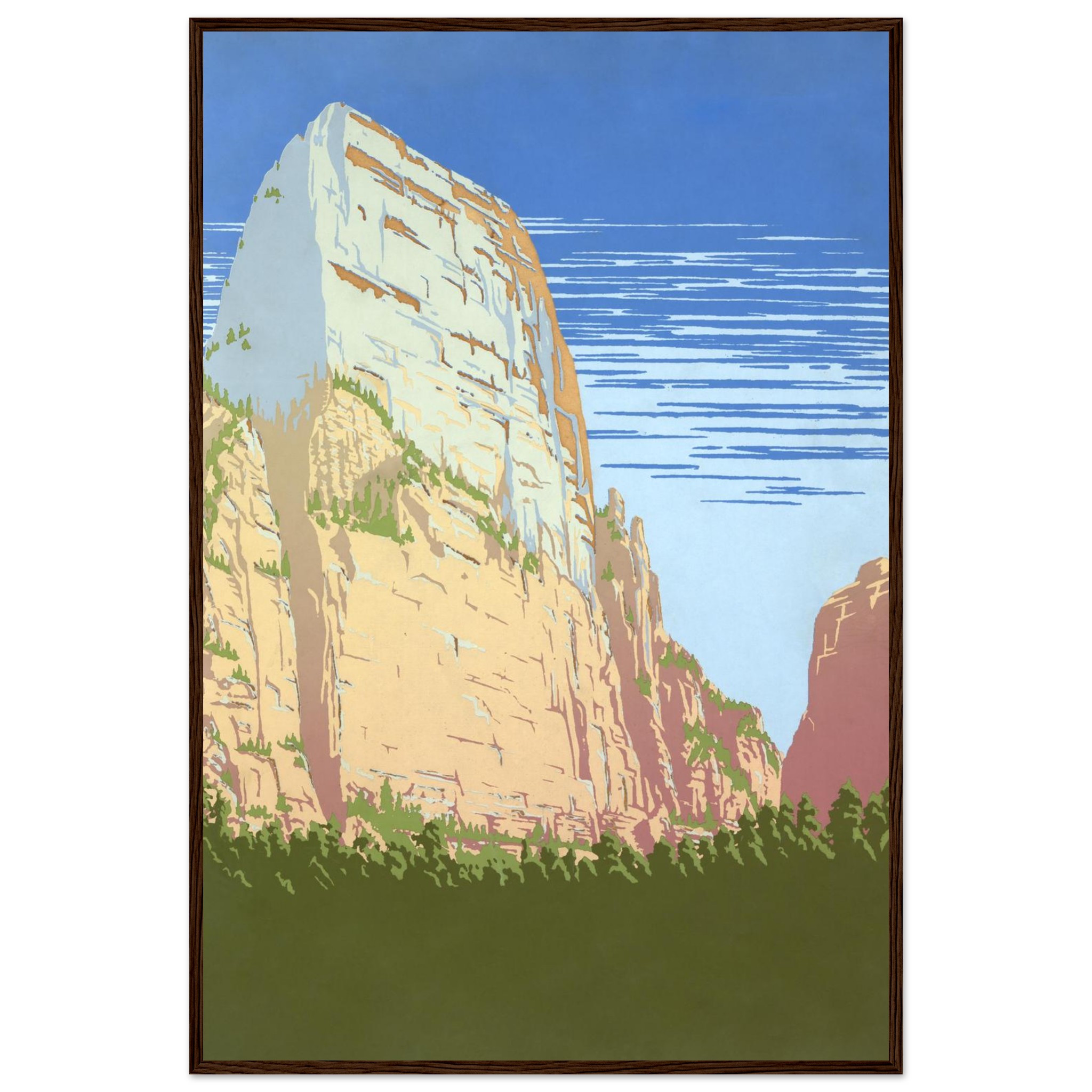 Bring the grandeur of the American West into your home with this stunning framed poster, capturing the majestic beauty of a desert canyon in a classic, art-deco inspired style. The warm, earthy tones of the towering rock formations contrast beautifully with the crisp blue sky and lush green foreground, creating a timeless piece that evokes a sense of adventure and tranquility. Perfect for adding a touch of vintage travel poster charm to any space, this artwork is sure to be a conversation starter.